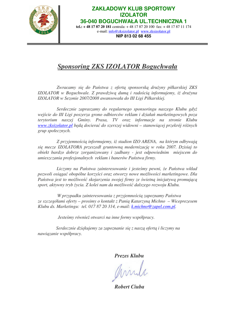 ZAKŁADOWY KLUB SPORTOWY IZOLATOR 36-040 BOGUCHWAŁA UL.TECHNICZNA 1 tel.: + 48 17 87 20 181 centrala: + 48 17 87 20 100 fax: + 48 17 87 11 174 e-mail: [email protected] www.zksizolator.pl NIP 813 02 68 455 Sponsoring ZKS IZOLATOR Boguchwała Zwracamy się do Państwa z ofertą sponsorską drużyny piłkarskiej ZKS IZOLATOR w Boguchwale. Z prawdziwą dumą i radością informujemy, iż drużyna IZOLATOR w Sezonie 2007/2008 awansowała do III Ligi Piłkarskiej. Serdecznie zapraszamy do regularnego sponsoringu naszego Klubu gdyż wejście do III Ligi poszerza grono odbiorców reklam i działań marketingowych poza terytorium naszej Gminy. Prasa, TV oraz informacje na stronie Klubu www.zksizolator.pl będą docierać do szerszej widowni – stanowiącej przekrój różnych grup społecznych. Z przyjemnością informujemy, iż stadion IZO ARENA, na którym odbywają się mecze IZOLATORA przeszedł gruntowną modernizację w roku 2007. Dzisiaj to obiekt bardzo dobrze zorganizowany i zadbany - jest odpowiednim miejscem do umieszczania profesjonalnych reklam i banerów Państwa firmy. Liczymy na Państwa zainteresowanie i jesteśmy pewni, że Państwa wkład pozwoli osiągać obopólne korzyści oraz otworzy nowe możliwości marketingowe. Dla Państwa jest to możliwość skojarzenia swojej firmy ze świetną inicjatywą promującą sport, aktywny tryb życia. Z kolei nam da możliwość dalszego rozwoju Klubu. W przypadku zainteresowania z przyjemnością zapoznamy Państwa ze szczegółami oferty – prosimy o kontakt z Panią Katarzyną Michno – Wiceprezesem Klubu ds. Marketingu: tel. 017 87 20 314, e-mail: [email protected]. Jesteśmy również otwarci na inne formy współpracy. Serdecznie dziękujemy za zapoznanie się z naszą ofertą i liczymy na nawiązanie współpracy. Prezes Klubu Robert Ciuba ZAKŁADOWY KLUB SPORTOWY IZOLATOR 36-040 BOGUCHWAŁA UL.TECHNICZNA 1 tel.: + 48 17 87 20 181 centrala: + 48 17 87 20 100 fax: + 48 17 87 11 174 e-mail: [email protected] www.zksizolator.pl NIP 813 02 68 455 W ramach oferty sponsorskiej proponujemy: - umieszczenie banerów, band, standów, balonów, namiotów na terenie stadionu - wyświetlanie treści reklamy na elektronicznej tablicy zegarowej - dystrybucję wszelkiego rodzaju gadżetów, ulotek, materiałów reklamowych podczas trwania meczy - stworzenie odrębnego wydarzenia pomiędzy meczami, które będzie bezpośrednio wiązać się ze sponsorem (np. konkurs, pokaz, promocja) - umieszczenie logo na wszystkich materiałach informacyjnych (plakaty, banery wiszące wyszczególnionych miejscach, ulotki, materiały informujące o imprezie umieszczane na portalach internetowych) - umieszczenie logo na stronie internetowej ZKS IZOLATOR – www.zksizolator.pl umieszczenie linka do strony internetowej sponsora - umieszczenie dużego baneru reklamowego na witrynie internetowej klubu www.zksizolator.pl - informowanie o sponsorach we wszystkich wywiadach z organizatorami oraz podczas samego turnieju przez głośniki etc.