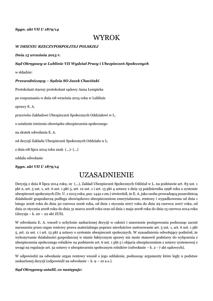 Sygn. akt VII U 1879/14 WYROK W IMIENIU RZECZYPOSPOLITEJ POLSKIEJ Dnia 15 września 2015 r. Sąd Okręgowy w Lublinie VII Wydział Pracy i Ubezpieczeń Społecznych w składzie: Przewodniczący – Sędzia SO Jacek Chaciński Protokolant starszy protokolant sądowy Anna Łempicka po rozpoznaniu w dniu 08 września 2015 roku w Lublinie sprawy E. A. przeciwko Zakładowi Ubezpieczeń Społecznych Oddziałowi w L. o ustalenie istnienia obowiązku ubezpieczenia społecznego na skutek odwołania E. A. od decyzji Zakładu Ubezpieczeń Społecznych Oddziału w L. z dnia 08 lipca 2014 roku znak (...)- (...) oddala odwołanie Sygn. akt VII U 1879/14 UZASADNIENIE Decyzją z dnia 8 lipca 2014 roku, nr (...), Zakład Ubezpieczeń Społecznych Oddział w L. na podstawie art. 83 ust. 1 pkt 2, art. 5 ust. 1, art. 6 ust. 1 pkt 5, art. 12 ust. 1 i art. 13 pkt 4 ustawy z dnia 13 października 1998 roku o systemie ubezpieczeń społecznych (Dz. U. z 2013 roku, poz. 1442 z zm.) stwierdził, że E. A. jako osoba prowadzącą pozarolniczą działalność gospodarczą podlega obowiązkowo ubezpieczeniom emerytalnemu, rentowy i wypadkowemu od dnia 1 lutego 2006 roku do dnia 30 czerwca 2006 roku, od dnia 1 stycznia 2007 roku do dnia 29 czerwca 2007 roku, od dnia 21 stycznia 2008 roku do dnia 31 marca 2008 roku oraz od dnia 1 maja 2008 roku do dnia 15 czerwca 2014 roku (decyzja – k. 20 – 22 akt ZUS). W odwołaniu E. A. wnosił o uchylenie zaskarżonej decyzji w całości i umorzenie postępowania podnosząc zarzut naruszenia przez organ rentowy prawa materialnego poprzez niewłaściwe zastosowanie art. 5 ust. 1, art. 6 ust. 1 pkt 5, art. 12 ust. 1 i art. 13 pkt 4 ustawy o systemie ubezpieczeń społecznych. W uzasadnieniu odwołujący podniósł, że wykonywanie działalności gospodarczej w stanie faktycznym sprawy nie może stanowić podstawy do wyłączenia z ubezpieczenia społecznego rolników na podstawie art. 6 ust. 1 pkt 5 i objęcia ubezpieczeniem z ustawy systemowej z uwagi na regulacje art. 5a ustawy o ubezpieczeniu społecznym rolników (odwołanie – k. 2 - 7 akt sądowych). W odpowiedzi na odwołanie organ rentowy wnosił o jego oddalenie, podnosząc argumenty które legły u podstaw zaskarżonej decyzji (odpowiedź na odwołanie – k. 9 – 10 a.s.). Sąd Okręgowy ustalił, co następuje: Od dnia 1 grudnia 1992 roku E. A. prowadzi pozarolniczą działalność gospodarczą w ramach której wykonuje prace drwalskie. Z tego tytułu do dnia 31 grudnia 1996 roku podlegał ubezpieczeniu społecznemu w systemie powszechnym. W związku z nabyciem własności gospodarstwa rolnego, obejmującego obszar użytków rolnych powyżej 1 ha przeliczeniowego, kontynuowaniem prowadzonej działalności gospodarczej oraz złożeniem oświadczenia o zamiarze podlegania ubezpieczeniu społecznemu rolników, decyzją z dnia 25 marca 1997 roku Prezes Kasy Rolniczego Ubezpieczenia Społecznego stwierdził podleganie z mocy prawa ubezpieczeniu społecznemu rolników i obowiązek opłacania składek na ubezpieczenie wypadkowe, chorobowe, macierzyńskie oraz emerytalno – rentowe dla E. A. jako rolnika od dnia 1 stycznia 1997 roku. Po objęciu ubezpieczeniem społecznym rolników skarżący kontynuował prowadzenie działalności gospodarczej. W dniu 19 grudnia 2005 roku E. A. darował swojemu synowi R. A. gospodarstwo rolne składające się z działki nr (...), położonej w N. oraz z działki nr (...), położonej B.. Od tego dnia skarżący zaprzestał prowadzenia działalności rolniczej oraz nie posiada żadnych gruntów rolnych. Decyzją kierownika biura powiatowego Agencji (...) w L. z dnia 17 stycznia 2006 roku ustalono ubezpieczonemu prawo do renty strukturalnej współfinansowanej ze środków pochodzących z Sekcji Gwarancji (...) Funduszu (...) na okres od dnia 19 grudnia 2005 roku do dnia 19 listopada 2018 roku. Decyzją z dnia 31 stycznia 2006 roku Prezes Kasy Rolniczego Ubezpieczenia Społecznego stwierdził ustanie ubezpieczenia społecznego rolników E. A. od dnia 1 stycznia 2006 roku w związku z przekazaniem w dniu 19 grudnia 2005 roku aktem notarialnym gospodarstwa rolnego. Następnie decyzją z dnia 3 lutego 2006 roku Prezes Kasy Rolniczego Ubezpieczenia Społecznego na podstawie art. 16 ust. 1 pkt 3 ustawy o ubezpieczeniu społecznym rolników stwierdził podleganie ubezpieczeniu społecznemu rolników i obowiązek opłacania składki na ubezpieczenie wypadkowe, chorobowe, macierzyńskie oraz emerytalno – rentowe dla E. A. od dnia 1 stycznia 2006 roku jako osoby pobierającej rentę strukturalną. Po dniu 1 stycznia 2006 roku ubezpieczony kontynuował prowadzenie pozarolniczej działalności gospodarczej do dnia 15 czerwca 2014 roku. Z tytułu prowadzonej działalności w okresie podlegania ubezpieczeniu społecznemu rolników w związku z posiadaniem statusu osoby pobierającej rentę strukturalną ubezpieczony opłacał składkę na ubezpieczenie zdrowotne (okoliczności bezsporne). Stan faktyczny nie był sporny między stronami. Strony różniły się jedynie w jego ocenie prawnej. Sąd Okręgowy zważył, co następuje: Odwołanie E. A. nie jest zasadne i nie zasługuje na uwzględnienie. Istota sporu w rozpoznawanej sprawie, biorąc pod uwagę treść zaskarżonej decyzji oraz odwołania, sprowadzała się do oceny czy prowadzenie przez ubezpieczonego pozarolniczej działalności gospodarczej w okresie podlegania przez niego rolniczemu ubezpieczeniu społecznemu w związku z posiadaniem statusu osoby pobierającej rentę strukturalną współfinansowaną ze środków pochodzących z Sekcji Gwarancji (...) Funduszu (...) skutkuje powstaniem tytułu do obowiązkowych ubezpieczeń społecznych w powszechnym systemie i wyłączeniem z rolniczego ubezpieczenia społecznego. Należy wskazać, że w toku postępowania ubezpieczony nie kwestionował okoliczności prowadzenia pozarolniczej działalność gospodarczej, w tym w okresie po dniu 1 stycznia 2006 roku, tj. po dniu powstania tytułu do ro