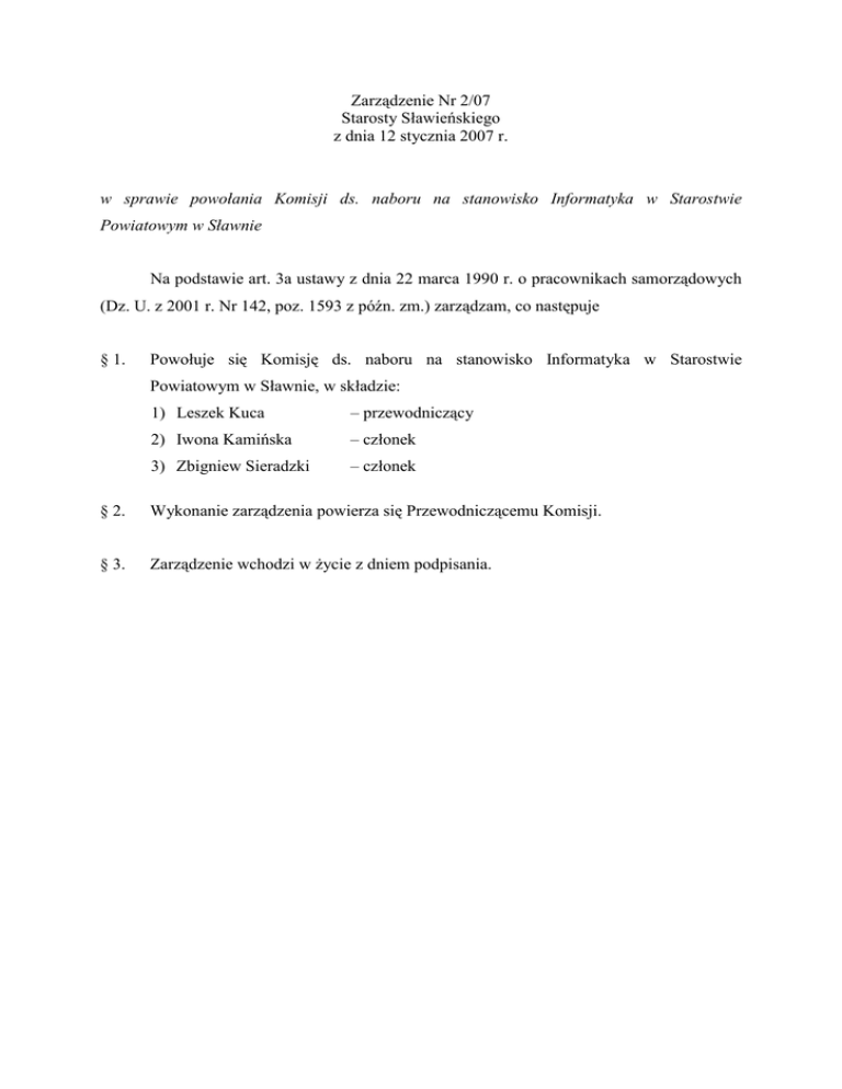 Zarządzenie Nr 2/07 Starosty Sławieńskiego z dnia 12 stycznia 2007 r. w sprawie powołania Komisji ds. naboru na stanowisko Informatyka w Starostwie Powiatowym w Sławnie Na podstawie art. 3a ustawy z dnia 22 marca 1990 r. o pracownikach samorządowych (Dz. U. z 2001 r. Nr 142, poz. 1593 z późn. zm.) zarządzam, co następuje § 1. Powołuje się Komisję ds. naboru na stanowisko Informatyka w Starostwie Powiatowym w Sławnie, w składzie: 1) Leszek Kuca – przewodniczący 2) Iwona Kamińska – członek 3) Zbigniew Sieradzki – członek § 2. Wykonanie zarządzenia powierza się Przewodniczącemu Komisji. § 3. Zarządzenie wchodzi w Ŝycie z dniem podpisania.