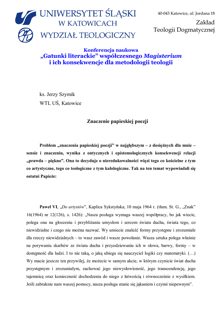 40-043 Katowice, ul. Jordana 18 Zakład Teologii Dogmatycznej Konferencja naukowa „Gatunki literackie” współczesnego Magisterium i ich konsekwencje dla metodologii teologii ks. Jerzy Szymik WTL UŚ, Katowice Znaczenie papieskiej poezji Problem „znaczenia papieskiej poezji” w najgłębszym – z dosiężnych dla mnie – sensie i znaczeniu, wynika z ontycznych i epistemologicznych konsekwencji relacji „prawda – piękno”. Ona to decyduje o nieredukowalności więzi tego co kościelne z tym co artystyczne, tego co teologiczne z tym kalologiczne. Tak na ten temat wypowiadali się ostatni Papieże: Paweł VI, „Do artystów”, Kaplica Sykstyńska, 10 maja 1964 r. (tłum. St. G., „Znak” 16(1964) nr 12(126), s. 1426): „Nasza posługa wymaga waszej współpracy, bo jak wiecie, polega ona na głoszeniu i przybliżaniu umysłom i sercom świata ducha, świata tego, co niewidzialne i czego nie można nazwać. Wy umiecie znaleźć formy przystępne i zrozumiałe dla rzeczy niewidzialnych – to wasz zawód i wasze powołanie. Wasza sztuka polega właśnie na porywaniu skarbów ze świata ducha i przyodziewaniu ich w słowa, barwy, formy – w dostępność dla ludzi. I to nie taką, o jaką ubiega się nauczyciel logiki czy matematyki. (…) Wy macie jeszcze ten przywilej, że możecie w samym akcie, w którym czynicie świat ducha przystępnym i zrozumiałym, zachować jego niewysłowioność, jego transcendencję, jego tajemnicę oraz konieczność dochodzenia do niego z łatwością i równocześnie z wysiłkiem. Jeśli zabraknie nam waszej pomocy, nasza posługa stanie się jąkaniem i czymś niepewnym”. Jan Paweł II, „Do przedstawicieli świata nauki i sztuki”, Wiedeń, 12 września 1983 r. (w: Wiara i kultura. Dokumenty, przemówienia, homilie, wyb. i oprac. M. Radwan, S Wylężek, T. Gorzkula, Rzym-Lublin 1988, s. 209): „Tak jednostka, jak i społeczność potrzebują sztuki dla interpretacji świata i życia, dla rozjaśnienia epokowych wydarzeń, dla ujęcia wielkości i głębi istnienia. Potrzebują sztuki, aby zwrócić się ku temu, co przewyższa sferę samej użyteczności i dopiero w ten sposób człowiek jest w stanie spojrzeć na samego siebie. Potrzebują literatury i poezji: słów łagodnych, a także proroczych i gniewnych, które częstokroć lepiej dojrzewają w samotności i cierpieniu. Według głębokiej myśli Beethovena, artysta poniekąd powołany jest do służby kapłańskiej. Także Kościół potrzebuje sztuki, nie tyle po to, ażeby zlecać jej zadania i w ten sposób zapewnić sobie jej służbę, ale przede wszystkim po to, aby osiągnąć głębsze poznanie conditio humana, wspaniałości i nędzy człowieka. Kościół potrzebuje sztuki, aby lepiej wiedzieć, co kryje się w człowieku: w tym człowieku, któremu ma głosić Ewangelię”. 1 nr 3, 4, 5, 13, 16. Benedykt XVI (J. Ratzinger, „W drodze do Jezusa Chrystusa”, tłum. J. Merecki, Kraków 2004, s. 38-39): „Nie jest to oczywiście wyłącznie problem teologii, ale również duszpasterstwa, które powinno prowadzić człowieka do spotkania z pięknem. Argumenty trafiają często w pustkę, ponieważ w naszym współczesnym świecie mamy aż nazbyt wiele konkurujących ze sobą argumentacji. Rozum ma nos z wosku, tj. jeśli jesteśmy tylko dostatecznie zręczni, możemy go wykręcić w różnych kierunkach. Wszystko wydaje się przekonujące, rozsądne – komu zatem mamy wierzyć? Spotkanie z pięknem może stać się uderzeniem strzały, która rani duszę i w ten sposób otwiera jej oczy, tak że teraz – na podstawie własnego doświadczenia – dysponuje ona odpowiednim kryterium, które pozwala jej na ocenę argumentów. W Monachium, po koncercie, kiedy wybrzmiał ostatni dźwięk jednej z wielkich kantat Bacha, spontanicznie popatrzyłem na siedzącego obok luterańskiego biskupa i równie spontanicznie powiedzieliśmy: „Ten, kto to słyszał, wie, że wiara jest prawdziwa”. Muzyka ta wyraża tak niesłychaną siłę obecnej w niej rzeczywistości, że człowiek wie – nie przez wnioskowanie, ale przez wstrząs – że cos takiego nie może pochodzić z pustki”. Te właśnie papieskie wypowiedzi – opasujące naszą współczesność z dwudziestoletnią częstotliwością – proponuję uczynić przedmiotem rozmowy. Bo one (w moim przekonaniu) decydują o nawiązywaniu w nauczaniu do „Boskiej komedii” Dante Aligheri’ego (Paweł VI), o publikacji „Tryptyku rzymskiego” (Jan Paweł II), czy o 2 „papieskiej” interpretacji Bacha i Mozarta (Benedykt XVI). Czyli o współczesnym związku uprawiania sztuki z głoszeniem prawdy (!). 3