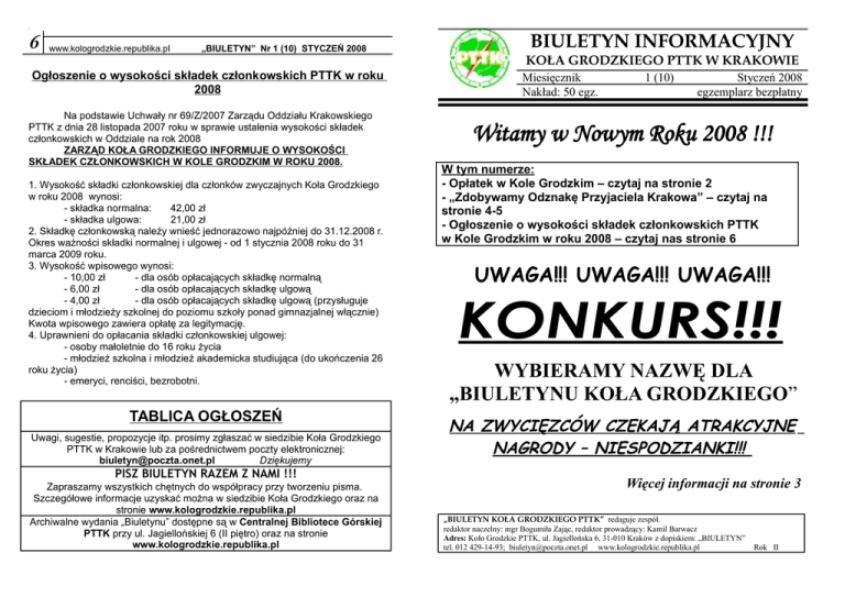 Grób j 6 www.kologrodzkie.republika.pl „BIULETYN” Nr 1 (10) STYCZEŃ 2008 Ogłoszenie o wysokości składek członkowskich PTTK w roku 2008 Na podstawie Uchwały nr 69/Z/2007 Zarządu Oddziału Krakowskiego PTTK z dnia 28 listopada 2007 roku w sprawie ustalenia wysokości składek członkowskich w Oddziale na rok 2008 ZARZĄD KOŁA GRODZKIEGO INFORMUJE O WYSOKOŚCI SKŁADEK CZŁONKOWSKICH W KOLE GRODZKIM W ROKU 2008. 1. Wysokość składki członkowskiej dla członków zwyczajnych Koła Grodzkiego w roku 2008 wynosi: - składka normalna: 42,00 zł - składka ulgowa: 21,00 zł 2. Składkę członkowską należy wnieść jednorazowo najpóźniej do 31.12.2008 r. Okres ważności składki normalnej i ulgowej - od 1 stycznia 2008 roku do 31 marca 2009 roku. 3. Wysokość wpisowego wynosi: - 10,00 zł - dla osób opłacających składkę normalną - 6,00 zł - dla osób opłacających składkę ulgową - 4,00 zł - dla osób opłacających składkę ulgową (przysługuje dzieciom i młodzieży szkolnej do poziomu szkoły ponad gimnazjalnej włącznie) Kwota wpisowego zawiera opłatę za legitymację. 4. Uprawnieni do opłacania składki członkowskiej ulgowej: - osoby małoletnie do 16 roku życia - młodzież szkolna i młodzież akademicka studiująca (do ukończenia 26 roku życia) - emeryci, renciści, bezrobotni. TABLICA OGŁOSZEŃ Uwagi, sugestie, propozycje itp. prosimy zgłaszać w siedzibie Koła Grodzkiego PTTK w Krakowie lub za pośrednictwem poczty elektronicznej: [email protected] Dziękujemy PISZ BIULETYN RAZEM Z NAMI !!! Zapraszamy wszystkich chętnych do współpracy przy tworzeniu pisma. Szczegółowe informacje uzyskać można w siedzibie Koła Grodzkiego oraz na stronie www.kologrodzkie.republika.pl Archiwalne wydania „Biuletynu” dostępne są w Centralnej Bibliotece Górskiej PTTK przy ul. Jagiellońskiej 6 (II piętro) oraz na stronie www.kologrodzkie.republika.pl BIULETYN INFORMACYJNY KOŁA GRODZKIEGO PTTK W KRAKOWIE Miesięcznik Nakład: 50 egz. 1 (10) Styczeń 2008 egzemplarz bezpłatny Witamy w Nowym Roku 2008 !!! W tym numerze: - Opłatek w Kole Grodzkim – czytaj na stronie 2 - „Zdobywamy Odznakę Przyjaciela Krakowa” – czytaj na stronie 4-5 - Ogłoszenie o wysokości składek członkowskich PTTK w Kole Grodzkim w roku 2008 – czytaj nas stronie 6 UWAGA!!! UWAGA!!! UWAGA!!! KONKURS!!! WYBIERAMY NAZWĘ DLA „BIULETYNU KOŁA GRODZKIEGO” NA ZWYCIĘZCÓW CZEKAJĄ ATRAKCYJNE NAGRODY – NIESPODZIANKI!!! Więcej informacji na stronie 3 „BIULETYN KOŁA GRODZKIEGO PTTK” redaguje zespół. redaktor naczelny: mgr Bogumiła Zając, redaktor prowadzący: Kamil Barwacz Adres: Koło Grodzkie PTTK, ul. Jagiellońska 6, 31-010 Kraków z dopiskiem: „BIULETYN” tel. 012 429-14-93; [email protected] www.kologrodzkie.republika.pl Rok II 2 www.kologrodzkie.republika.pl „BIULETYN” Nr 1 (10) STYCZEŃ 2008 Opłatek w Kole Grodzkim 17 grudnia 2007 roku odbyło się spotkanie opłatkowe Koła Grodzkiego. Udział w nim wzięło ok. 30 osób – członkowie Zarządu i Komisji Rewizyjnej Koła Grodzkiego oraz przewodnicy współpracujący z Kołem. Obecny był również przedstawiciel naszej Redakcji Kamil Barwacz. Podczas spotkania pani Prezes Koła Grodzkiego Bogumiła Zając podziękowała za przybycie, krótko podsumowała mijający rok i złożyła wszystkim najlepsze życzenia, po czym wszyscy podzielili się opłatkiem. W drugiej części Dzielimy się opłatkiem fot. W.Otfinowska pan Jacek Kołodziejczyk opowiedział góralską historię o narodzinach Jezusa, a następnie wspólnie kolędowano przy akompaniamencie kolegi Jurka Bożyka Spotkanie przebiegło w miłej i przyjaznej atmosferze, za co szczególne podziękowania należą się pani Wiktorii Otfinowskiej, która je przygotowała. Wspólne kolędowanie fot. W.Otfinowska Kamil Barwacz „BIULETYN” Nr 1 (10) STYCZEŃ 2008 www.kologrodzkie.republika.pl 5 Miniony rok zakończyliśmy w izbie folklorystycznej Nowohuckiego Centrum Kultury w Chałupie „U Szpinaka”, gdzie Jerzy Kujawski pomógł nam pożegnać w oryginalny sposób „stary” 2007 rok. Zabawa była przednia, co widać na załączonych poniżej zdjęciach. autor zdjęć: Wiktoria Otfinowska Mając w pamięci ekscytujące ubiegłoroczne wyprawy, zapraszamy na nie mniej fascynujące trasy wycieczek w 2008 roku. Wszystkim odkrywcom tajemnic Krakowa życzymy Szczęśliwego Nowego Roku. Dominika Molenda 4 www.kologrodzkie.republika.pl „BIULETYN” Nr 1 (10) STYCZEŃ 2008 „Zdobywamy Odznakę Przyjaciela Krakowa” W listopadzie zaczęliśmy kolejny sezon akcji „Zdobywamy Odznakę Przyjaciela Krakowa”. Jest to wspaniała okazja do poznania zbytków i historii naszego miasta oraz miłego spędzenia wolnego czasu. Ogromna różnorodność tematów sprawia, że co roku w wycieczkach uczestniczą tłumy krakowian. Tak było i tym razem. Jak zwykle rozpoczęliśmy od wizyty na krakowskich cmentarzach. Odwiedziliśmy zarówno największy Rakowicki jak i te mniejsze: Salwatorski i Podgórski. Poznaliśmy nie tylko dzieje samych nekropoli, ale również historię pochowanych tam osób: Jana Matejki, Heleny Modrzejewskiej, Marka Grechuty, Józefa Dietla, Stanisława Lema, Edwarda Dembowskiego i wielu innych mających ogromny wkład w rozwój Krakowa. Późniejsze wycieczki były równie interesujące. Wśród wielu propozycji każdy mógł znaleźć coś dla siebie. Zwiedziliśmy między innymi: Muzeum Historyczne Miasta Krakowa, Podgórze, miasto Kleparz, Muzeum Archeologiczne, Muzeum Stanisława Wyspiańskiego, Obserwatorium Astronomiczne UJ, Muzeum UJ Collegium Maius czy Muzeum Archidiecezjalne. Szczególnie atrakcyjne spotkania miały miejsce w okresie bożonarodzeniowym. W sobotę 22 grudnia mieliśmy okazję poprzez wykład prof. Michała Rożka, poznać bliżej sylwetkę Stanisława Wyspiańskiego. Następnego dnia wędrowaliśmy szlakiem krakowskiego Lajkonika: wyruszyliśmy z pętli tramwajowej na Salwtorze, aby dalej ulicami Kościusz