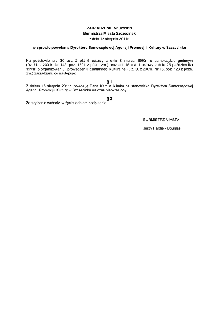 ZARZĄDZENIE Nr 92/2011 Burmistrza Miasta Szczecinek z dnia 12 sierpnia 2011r. w sprawie powołania Dyrektora Samorządowej Agencji Promocji i Kultury w Szczecinku Na podstawie art. 30 ust. 2 pkt 5 ustawy z dnia 8 marca 1990r. o samorządzie gminnym (Dz. U. z 2001r. Nr 142, poz. 1591 z późn. zm.) oraz art. 15 ust. 1 ustawy z dnia 25 października 1991r. o organizowaniu i prowadzeniu działalności kulturalnej (Dz. U. z 2001r. Nr 13, poz. 123 z późn. zm.) zarządzam, co następuje: §1 Z dniem 16 sierpnia 2011r. powołuję Pana Kamila Klimka na stanowisko Dyrektora Samorządowej Agencji Promocji i Kultury w Szczecinku na czas nieokreślony. §2 Zarządzenie wchodzi w Ŝycie z dniem podpisania. BURMISTRZ MIASTA Jerzy Hardie - Douglas