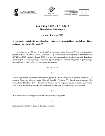 Z A R Z Ą D Z E N I E 8/2012 Burmistrza Strumienia z dnia 14 lutego 2012 w sprawie: ustalenia regulaminu rekrutacji uczestników projektu „Bądź aktywny w gminie Strumień” Na podstawie art.30 ust.1 i ust. 2 pkt 2 i 4 ustawy z dnia 8 marca 1990 r. o samorządzie gminnym (Dz.U.z 2001 r. Nr 142, poz.1591) i § 3 uchwały Rady Miejskiej w Strumieniu Nr XVIII/144/2008 z dnia 28 lutego 2008 r. w sprawie przystąpienia Gminy Strumień do działań finansowych z Europejskiego Funduszu Społecznego w ramach Programu Operacyjnego Kapitał Ludzki 2007 - 2013 – Burmistrz Strumienia zarządza §1 Ustalić regulamin rekrutacji uczestników projektu „Bądź aktywny w gminie Strumień”, w ramach Programu Operacyjnego Kapitał Ludzki, Priorytet VI Rynek pracy otwarty dla wszystkich, Działanie 6.3 – Inicjatywy lokalne na rzecz podnoszenia poziomu aktywności zawodowej na obszarach wiejskich, stanowiący załącznik do niniejszego zarządzenia. §2 Wykonanie zarządzenia powierzam Koordynatorowi Projektu. §3 Zarządzenie wchodzi w życie z dniem podpisania. Załącznik do Zarządzenia nr 8/2012 Burmistrza Strumienia z dnia 14 lutego 2012 REGULAMIN REKRUTACJI UCZESTNIKÓW PROJEKTU „Bądź aktywny w gminie Strumieo” § 1. INFORMACJA O PROJEKCIE 1. Beneficjentem projektu „Bądź aktywny w gminie Strumień” realizowanego w ramach Programu Operacyjnego Kapitał Ludzki Priorytet VI. Rynek pracy otwarty dla wszystkich, Działanie 6.3. Inicjatywy lokalne na rzecz podnoszenia poziomu aktywności zawodowej na obszarach wiejskich jest Gmina Strumień. 2 Projekt jest realizowany przez Urząd Miejski w Strumieniu. 3. Biuro Projektu znajduje się w siedzibie Urzędu Miejskiego w Strumieniu, Rynek 4 , (I piętro) 43-246 Strumień. 4. Projekt obejmuje swym zasięgiem gminę Strumień 5. Projekt współfinansowany jest ze środków Unii Europejskiej w ramach Europejskiego Funduszu Społecznego. 6. Głównym celem projektu jest rozwój aktywności zawodowej oraz edukacji na obszarach wiejskich 7. W ramach Projektu prowadzone będą kurs kroju i szycia, kurs przedsiębiorczości, poradnictwo indywidualne doradcy zawodowego. 8. Czas trwania projektu: od 1.02.2012r. do 30.06.2012r. §2 POSTANOWIENIA OGÓLNE 1. Niniejszy regulamin określa zasady rekrutacji w tym naboru i doboru uczestników nazywanych dalej „Beneficjentami Ostatecznymi” w projekcie „Bądź aktywny w gminie Strumień” zwanego dalej „Projektem”. 2. Projekt zakłada udział 20 uczestników projektu. 3. Udział Uczestników Projektu jest bezpłatny, koszty jego organizacji pokrywane są ze środków Europejskiego Funduszu Społecznego. 4. Ogólny nadzór oraz rozstrzyganie spraw nie uregulowanych w regulaminie należą do kompetencji Burmistrza Strumienia. 5. Odpowiedzialność za właściwą realizację projektu ponosi Burmistrz Strumienia. §3 WARUNKI UCZESTNICTWA 1. Beneficjentem ostatecznym może być osoba, która w dniu zatwierdzenia niniejszego regulaminu spełnia następujące kryteria: a) jest mieszkańcem gminy Strumień i chce z własnej woli podnieść swoje kwalifikacje, b) jest osobą niepracującą (nieaktywna zawodowo lub bezrobotna). 2. Warunkiem uczestnictwa w projekcie po spełnieniu kryteriów określonych w § 3 ust.1 niniejszego regulaminu, jest złożenie w Biurze Projektu (osobiście lub przesłanie pocztą tradycyjną) następujących dokumentów rekrutacyjnych: a) Formularza zgłoszeniowego, stanowiącego załącznik nr 1 do regulaminu; b)Oświadczenia uczestnika dotyczące przetwarzania danych osobowych, stanowiącego załącznik nr 2; c)Deklaracji uczestnictwa w projekcie, stanowiącej załącznik nr 3 do regulaminu. §4 ZASADY REKRUTACJI 1. Rekrutację prowadzi Biuro Projektu, które mieści się w Urzędzie Miejskim w Strumieniu, Rynek 4 (II piętro), 43-246 Strumień. 2. Rekrutacja prowadzona będzie: od 20.02.2012 do momentu wyczerpania miejsc. Przez wyczerpanie miejsc rozumie się stworzenie podstawowej listy uczestników złożonej z 20 osób (8 kobiet bezrobotnych, 2 mężczyzn bezrobotnych, 8 kobiet nieaktywnych zawodowo, 2 mężczyzn nieaktywnych zawodowo). 3. Osoby nie mieszczące się na liście podstawowej będą wpisane na listę rezerwową. 4. Informacje dotyczące rekrutacji zamieszczane są na stronie internetowej www.strumien.pl oraz wywieszane w siedzibie Biura Projektu. Zakłada się również możliwość wykorzystania środków masowego przekazu (prasa, Internet), w celu informowania o terminach rekrutacji. 5. Procedura rekrutacji obejmuje następujące etapy: a) wypełnienie przez kandydatów dokumentów rekrutacyjnych; b) przekazanie dokumentów do Biura Projektu; c) weryfikacja dokumentów pod względem formalnym. 6 Złożone dokumenty zgłoszeniowe będą na bieżąco weryfikowane, a potencjalni uczestnicy będą informowani o wyniku weryfikacji i ewentualnej konieczności poprawienia lub uzupełnienia dokumentów. 7. Kompletne i poprawne zgłoszenia wprowadzane będą według daty ich wpływu do rejestru. 8. Za moment przystąpienia do projektu Beneficjenta Ostatecznego przyjmuje się chwilę podpisania umowy. 9. W wyniku procesu rekrutacji zostanie utworzona lista podstawowa oraz lista rezerwowa. Zgłoszenia, które wpłyną po terminach określonych w § 4 pkt. 2 nie będą brane pod uwagę. 10. Zgodnie z § 3 pkt. 2 jednym z warunków uczestnictwa w Projekcie jest dostarczenie dokumentów rekrutacyjnych do Biura Projektu. 11. Zgłoszenia do udziału w projekcie przyjmowane są od poniedziałku do piątku w godzinach urzędowania Urzędu Miejskiego w Strumieniu. §5 KWALIFIKACJA UCZESTNIKÓW NA KURS 1. Kwalifikacji kandydatów do udziału w szkoleniu dokonuje Komisja Kwalifikacyjna 2. Komisja kwalifikuje do udziału w projekcie kandydatów spełniających warunki formalne określone w niniejszym Regulaminie. 3. W przypadku gdy dokumenty rekrutacyjne nie spełniają wymagań formalnych o których mowa w § 3 pkt.2, kandydat zostanie poproszony o uzupełnienie braków do 3 d