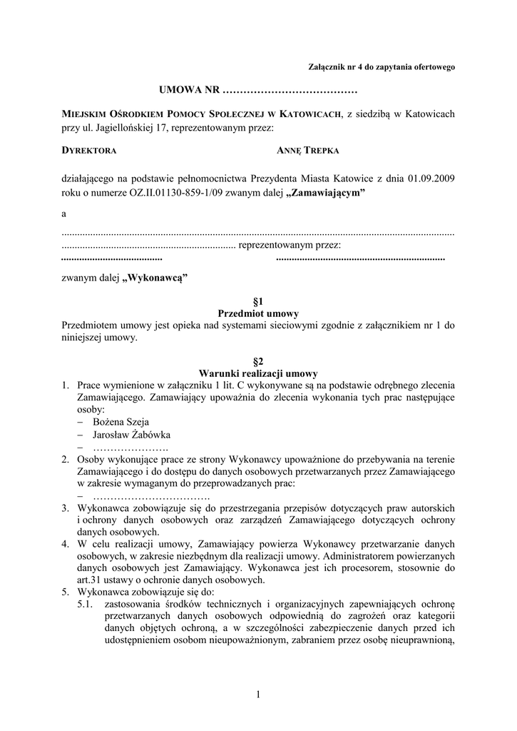 Załącznik nr 4 do zapytania ofertowego UMOWA NR ………………………………… MIEJSKIM OŚRODKIEM POMOCY SPOŁECZNEJ W KATOWICACH, z siedzibą w Katowicach przy ul. Jagiellońskiej 17, reprezentowanym przez: ANNĘ TREPKA DYREKTORA działającego na podstawie pełnomocnictwa Prezydenta Miasta Katowice z dnia 01.09.2009 roku o numerze OZ.II.01130-859-1/09 zwanym dalej „Zamawiającym” a ....................................................................................................................................................... ................................................................... reprezentowanym przez: ....................................... ................................................................. zwanym dalej „Wykonawcą” §1 Przedmiot umowy Przedmiotem umowy jest opieka nad systemami sieciowymi zgodnie z załącznikiem nr 1 do niniejszej umowy. 1. 2. 3. 4. 5. §2 Warunki realizacji umowy Prace wymienione w załączniku 1 lit. C wykonywane są na podstawie odrębnego zlecenia Zamawiającego. Zamawiający upoważnia do zlecenia wykonania tych prac następujące osoby: Bożena Szeja Jarosław Żabówka …………………. Osoby wykonujące prace ze strony Wykonawcy upoważnione do przebywania na terenie Zamawiającego i do dostępu do danych osobowych przetwarzanych przez Zamawiającego w zakresie wymaganym do przeprowadzanych prac: ……………………………. Wykonawca zobowiązuje się do przestrzegania przepisów dotyczących praw autorskich i ochrony danych osobowych oraz zarządzeń Zamawiającego dotyczących ochrony danych osobowych. W celu realizacji umowy, Zamawiający powierza Wykonawcy przetwarzanie danych osobowych, w zakresie niezbędnym dla realizacji umowy. Administratorem powierzanych danych osobowych jest Zamawiający. Wykonawca jest ich procesorem, stosownie do art.31 ustawy o ochronie danych osobowych. Wykonawca zobowiązuje się do: 5.1. zastosowania środków technicznych i organizacyjnych zapewniających ochronę przetwarzanych danych osobowych odpowiednią do zagrożeń oraz kategorii danych objętych ochroną, a w szczególności zabezpieczenie danych przed ich udostępnieniem osobom nieupoważnionym, zabraniem przez osobę nieuprawnioną, 1 przetwarzaniem z naruszeniem prawa oraz zmianą, utratą, uszkodzeniem lub zniszczeniem; 5.2. prowadzenia dokumentacji opisującej sposób przetwarzania danych oraz środki, o których mowa w pkt. 5.1; 5.3. wydawania indywidualnych upoważnień do przetwarzania danych osobowych; 5.4. prowadzenia ewidencji osób upoważnionych do przetwarzania danych osobowych; 5.5. dopuszczania do przetwarzania danych wyłącznie osób posiadających upoważnienie; 5.6. spełnienia warunków technicznych i organizacyjnych, którym odpowiadać powinny urządzenia i systemy informatyczne stosowane przez niego do przetwarzania danych osobowych, określonych w rozporządzeniu Ministra Spraw Wewnętrznych i Administracji z dnia 29 kwietnia 2004 r. w sprawie dokumentacji przetwarzania danych osobowych oraz warunków technicznych i organizacyjnych, jakim powinny odpowiadać urządzenia i systemy informatyczne służące do przetwarzania danych osobowych (Dz. U. z 2004r., Nr 100, poz. 1024); 5.7. zaprzestania przetwarzania powierzonych danych, niezwłocznie po zakończeniu okresu obowiązywania umowy. Wykonawca usunie powierzone dane ze wszystkich nośników, bądź przekaże je Zamawiającemu; 5.8. niepowierzania przetwarzania innym podmiotom bez pisemnej zgody Zamawiającego; 5.9. umożliwienia Administratorowi Danych nadzoru prawidłowości realizacji zapisów ustawy o Ochronie danych osobowych. 5.10. nieprzekazywania danych do państw trzecich, w rozumieniu ustawy o ochronie danych osobowych. 6. Wykonawca przekaże Zamawiającemu w terminie 1 miesiąca od dnia podpisania umowy: 6.1. informacje o zastosowanych środkach organizacyjnych i technicznych o których mowa w pkt. 5.1, w zakresie dotyczącym danych, których przetwarzanie zostanie powierzone; 6.2. dokumentację o której mowa w pkt. 5.2, w zakresie dotyczącym danych, których przetwarzanie zostanie powierzone; 6.3. informacje czy został wyznaczony administrator bezpieczeństwa informacji, a jeżeli został wyznaczony, podanie jego danych. 7. Po sporządzeniu sprawozdania o którym mowa w art. 36a ust. 2 pkt 1 lit. a ustawy o ochronie danych osobowych, Wykonawca przekaże je Zamawiającemu w zakresie dotyczącym danych, których przetwarzanie zostanie powierzone. 8. Po wykonaniu prac serwisowych określonych w Załączniku nr 1 pracownik Wykonawcy sporządzi protokół, w którym zostanie szczegółowo opisany zakres merytoryczny wykonanych prac. Do potwierdzenia protokołu ze strony Zamawiającego, upoważnione są osoby wymienione w §2. 9. Wykonawca zapewni nieodpłatnie, rejestrację i pełną obsługę zgłoszeń i innych prac wynikających z Umowy w Systemie elektronicznej obsługi zgłoszeń, zgodnie z wymogami określonymi w załączniku nr 1. 10. Wykonawca dostarcza wszystkie dokumenty określone w załącznikach nr 2 do 7, zgodnie z wymogami określonymi w załączniku nr 1. 11. Z zastrzeżeniem punktu 12, wszystkie wymagane protokoły i załączniki Wykonawca dostarcza w formie elektronicznej (za pośrednictwem systemu elektronicznej obsługi zgłoszeń, poczty elektronicznej lub na płycie CD) oraz pisemnej, podpisane przez osobę upoważnioną. 12. „Szczegółowy raport instalacji poprawek i nowych wersji oprogramowania oraz udostępniania poprawek i nowych wersji przez dostawcę oprogramowania” (załącznik 7) 2 oraz „Uproszczony raport instalacji poprawek i nowych wersji oprogramowania oraz udostępniania poprawek i nowych wersji przez dostawcę oprogramowania” (załącznik 8), są przekazywane jedynie w formie elektronicznej. 13. Zamawiający udostępni pomieszczenia Wykonawcy w celu realizacji zadań określonych w załączniku nr 1. 14. Prace wykonywane w godzinach pracy Zamawiającego nie mogą kolidować