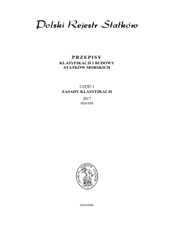 PRZEPISY KLASYFIKACJI I BUDOWY STATKÓW MORSKICH CZĘŚĆ I ZASADY KLASYFIKACJI 2017 styczeń GDAŃSK PRZEPISY KLASYFIKACJI I BUDOWY STATKÓW MORSKICH opracowane i wydane przez Polski Rejestr Statków S.A., zwany dalej PRS, składają się z następujących części: Część I – Zasady klasyfikacji Część II – Kadłub Część III – Wyposażenie kadłubowe Część IV – Stateczność i niezatapialność Część V – Ochrona przeciwpożarowa Część VI – Urządzenia maszynowe i urządzenia chłodnicze Część VII – Silniki, mechanizmy, kotły i zbiorniki ciśnieniowe Część VIII – Instalacje elektryczne i systemy sterowania Część IX – Materiały i spawanie. Część I – Zasady klasyfikacji – styczeń 2017 została zatwierdzona przez Zarząd PRS S.A. w dniu 16 grudnia 2016 r. i wchodzi w życie z dniem 1 stycznia 2017 r. Z dniem wejścia w życie niniejszej Części I jej wymagania mają zastosowanie: – do statków nowych, dla których podpisanie kontraktu nastąpi 1 stycznia 2017 r. lub po tej dacie – w pełnym zakresie, – do statków istniejących – od najbliższego przeglądu klasyfikacyjnego. Niniejsza Część I zastępuje Część I – Zasady klasyfikacji – lipiec 2016. Rozszerzeniem Części I – Zasady klasyfikacji są następujące Publikacje „P”: Publikacja Nr 2/P – Alternatywne systemy nadzoru urządzeń maszynowych Publikacja Nr 14/P – Zasady uznawania programów komputerowych Publikacja Nr 36/P – Przeglądy kadłuba zbiornikowców olejowych Publikacja Nr 39/P – Przeglądy kadłuba masowców Publikacja Nr 46/P – Przeglądy kadłuba chemikaliowców Publikacja Nr 48/P – Wymagania dotyczące gazowców Publikacja Nr 51/P – Zasady uznawania firm serwisowych Publikacja Nr 54/P – Alternatywne systemy nadzoru kadłuba Publikacja Nr 58/P – Przeglądy kadłuba zbiornikowców olejowych o podwójnym kadłubie Publikacja Nr 62/P – Przeglądy kadłuba drobnicowców Publikacja Nr 63/P – Kryteria wymiany wręgów i węzłówek masowców i roporudomasowców z burtą pojedynczą Publikacja Nr 64/P – Przeglądy kadłuba masowców o podwójnych burtach Publikacja Nr 81/P – Przeglądy kadłuba w czasie budowy statku Publikacja Nr 82/P – Przeglądy kadłuba gazowców Publikacja Nr 95/P – Wymagania dotyczące przeglądów furt i wrót wewnętrznych na statkach ro-ro Publication No. 97/P – Transfer of Class and Adding Maintaining and Withdrawing Double or Dual Class Publikacja Nr 100/P – Przepisy budowy kadłuba jednostek szybkich Publication No. 102/P – EU RO Mutual Recognition of Type Approval Publikacja Nr 103/P – Wytyczne w zakresie efektywności energetycznej statków. Publikacja Nr 106/P – Przepisy ekologicznego znaku klasy Publikacja Nr 111/P – Przeglądy okresowe wałów śrubowych Uzupełnieniem Części I – Zasady klasyfikacji są następujące Publikacje „I”: Publikacja Nr 16/I – Standardy budowy i naprawy statków Publikacja Nr 27/I – Wytyczne dotyczące zatwierdzania/akceptacji alternatywnych środków dostępu Publikacja Nr 28/I – Wytyczne dotyczące bezpiecznego wejścia do przestrzeni zamkniętych Publikacja Nr 29/I – Wytyczne dotyczące przeglądów okresowych instalacji i urządzeń stosowanych w ochronie przeciwpożarowej na statkach Publikacja Nr 32/I – Wytyczne dla programów pilotażowych dotyczących wydłużonego okresu pomiędzy przeglądami na doku. © Copyright by Polski Rejestr Statków S.A., 2017 PRS/OP, 12/2016 SPIS TREŚCI str. 0 Struktura i zakres Przepisów....................................................................................................................... 5 1 Postanowienia ogólne.................................................................................................................................... 1.1 Zakres zastosowania ............................................................................................................................... 1.2 Określenia............................................................................................................................................... 5 5 6 2 Zakres nadzoru ............................................................................................................................................. 13 3 Klasa statku ................................................................................................................................................... 3.1 Zasady ogólne......................................................................................................................................... 3.2 Okres ważności klasy statku................................................................................................................... 3.3 Zasadniczy symbol klasy........................................................................................................................ 3.4 Znaki dodatkowe w symbolu klasy ........................................................................................................ 3.5 ,Symbol urządzeń maszynowych............................................................................................................ 3.6 Dodatkowe informacje opisowe ............................................................................................................. 14 14 14 14 15 24 25 4 Nadanie klasy statkowi ................................................................................................................................. 4.1 Zasady ogólne......................................................................................................................................... 4.2 Statek zbudowany pod nadzorem PRS ................................................................................................... 4.3 Statek posiadający ważną klasę innej uznanej instytucji klasyfikacyjnej............................................... 4.4 Statek nigdy nie klasyfikowany przez PRS lub inną uzna