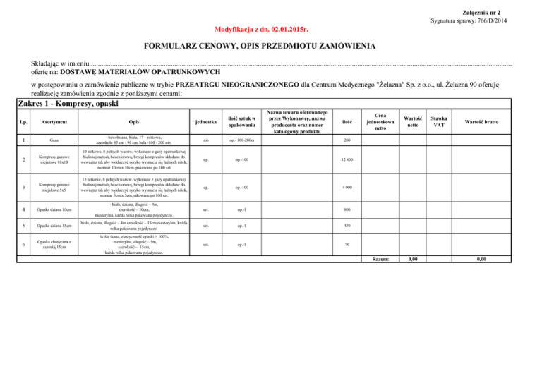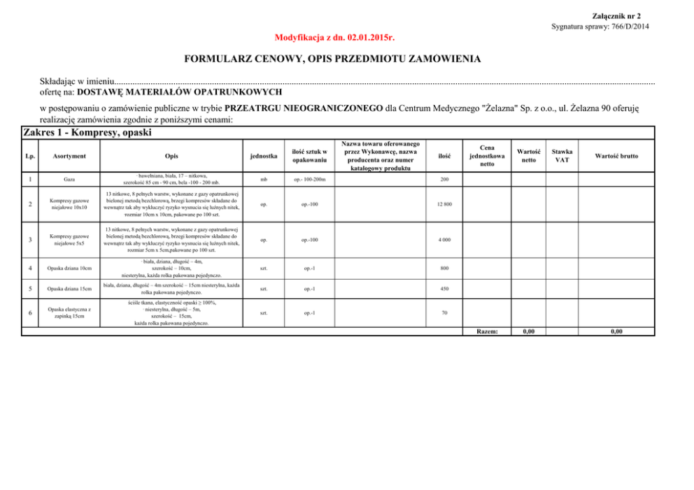 Załącznik nr 2 Sygnatura sprawy: 766/D/2014 Modyfikacja z dn. 02.01.2015r. FORMULARZ CENOWY, OPIS PRZEDMIOTU ZAMÓWIENIA Składając w imieniu.................................................................................................................................................................................................................................................... ofertę na: DOSTAWĘ MATERIAŁÓW OPATRUNKOWYCH w postępowaniu o zamówienie publiczne w trybie PRZEATRGU NIEOGRANICZONEGO dla Centrum Medycznego "Żelazna" Sp. z o.o., ul. Żelazna 90 oferuję realizację zamówienia zgodnie z poniższymi cenami: Zakres 1 - Kompresy, opaski Nazwa towaru oferowanego przez Wykonawcę, nazwa producenta oraz numer katalogowy produktu Lp. Asortyment Opis jednostka ilość sztuk w opakowaniu 1 Gaza · bawełniana, biała, 17 – nitkowa, szerokość 85 cm - 90 cm, bela -100 - 200 mb. mb op.- 100-200m 200 2 Kompresy gazowe niejałowe 10x10 13 nitkowe, 8 pełnych warstw, wykonane z gazy opatrunkowej bielonej metodą bezchlorową, brzegi kompresów składane do wewnątrz tak aby wykluczyć ryzyko wysnucia się luźnych nitek, ·rozmiar 10cm x 10cm, pakowane po 100 szt. op. op.-100 12 800 3 Kompresy gazowe niejałowe 5x5 13 nitkowe, 8 pełnych warstw, wykonane z gazy opatrunkowej bielonej metodą bezchlorową, brzegi kompresów składane do wewnątrz tak aby wykluczyć ryzyko wysnucia się luźnych nitek, rozmiar 5cm x 5cm,pakowane po 100 szt. op. op.-100 4 000 4 Opaska dziana 10cm · biała, dziana, długość – 4m, szerokość – 10cm, niesterylna, każda rolka pakowana pojedynczo. szt. op.-1 800 5 Opaska dziana 15cm biała, dziana, długość – 4m szerokość – 15cm niesterylna, każda rolka pakowana pojedynczo. szt. op.-1 450 6 Opaska elastyczna z zapinką 15cm ściśle tkana, elastyczność opaski ≥ 100%, · niesterylna, długość – 5m, szerokość – 15cm, każda rolka pakowana pojedynczo. szt. op.-1 70 ilość Cena jednostkowa netto Wartość netto Razem: 0,00 Stawka VAT Wartość brutto 0,00 Zakres 2 - Plastry, opatrunki Nazwa towaru oferowanego przez Wykonawcę, nazwa producenta oraz numer katalogowy produktu Asortyment Opis jednostka ilość sztuk w opakowaniu Plaster typ TEGADERM jałowy przeźroczysty wodoodporny równoważny z cechami TEGADERMU/1624W/ wymiary 6cm x 7 cm lub 6cm x 9cm opakowanie zbiorcze po 100 szt. op. op.-100 20 2 Plaster typ TEGADERM PEDIATRYCZNY do mocowania i zabezpieczania wkłuć naczyniowych u dziecisterylny, jednorazowy, nietoksyczny- pakowany pojedynczo, przezroczysty- cienki, wodoodporny, z systemem ramki - stanowiący barierę mikrobiologiczną - wycięcie w opatrunku oraz wzmocnienie warstwą włókniny zapewniające dobre mocowanie kaniul - dodatkowe sterylne paski mocujące - bezpieczny w użyciu, o wymiarach 5 cm x 5,7 cm - o parametrach opatrunku Tegaderm I.V., opakowanie zbiorcze po 100 sztuk. op. op.-100 22 3 Plaster typ TEGADERM z nacięciem · jałowy z nacięciem, przeźroczysty,· wodoodporny, wymiary 6 cm x 7 cm lub 6 cm x 9cm, równoważny z cechami TEGADERMU/1623W/,· opakowanie zbiorcze po 100 szt. op. op.-100 220 4 Plaster bez opat. typ MICROFOAM piankowy dobra przylepność odporny na wodę hypoalergiczny długość: 5m szerokość 2,5 cm szt. op.-1 szt. 950 5 Plaster o parametrach DURAPORE jedwabny, biały, dobra przylepność, hypoalergiczny· długość: 9m – 9,14m, szerokość 1,25 cm · nie strzępiące się brzegi szt. op.-1 szt. 425 6 Plaster typu Tegaderm + PAD Plaster typu Tegaderm + PAD, z opatrunkiem, przezroczysty, wymiary ok.. 5-7 cm, opatrunek umieszczony centralnie o wymiarach 2,5 cm x 4 cm bez nacięcia szt. op. 1 szt. 600 7 Opatrunek zbliżający typu Steri Strip · sterylny, jednorazowy, nietoksyczny, · pakowany trzy paski w jednym opakowaniu, w przezroczystą folię, · cienki, wodoodporny, do zamykania ran, tzw. szew naskórny, w formie pasków o wymiarach 6-7 mm x 75-76 mm, paski elastyczne, z włókniny ze sztucznego jedwabiu, włóknina poliestrowa, akrylowa masa lepna, bezpieczny w użyciu, o parametrach opatrunku Steri Strip pakiet 3 szt. op.- pakiet 500 8 Plaster typu Tegaderm jałowy przeźroczysty wodoodporny równoważny z cechami TEGADERMU/1622W/ wymiary 4,4cm x 4,4 cm opakowanie zbiorcze po 100 szt. op. op. - 100 szt. 15 Lp. 1 ilość Cena jednostkowa netto Wartość netto Razem: 0,00 Stawka VAT Wartość brutto 0,00 Zakres 3 - Plastry Nazwa towaru oferowanego przez Wykonawcę, nazwa producenta oraz numer katalogowy produktu Lp. Asortyment Opis jednostka ilość sztuk w opakowaniu 1 Plaster bez opatr. typ POLOVIS 2,5cm przylepiec na tkaninie, dobra przylepność, odporny na wodę, hypoalergiczny, szerokość – 2,5 cm, długość – 5m. szt. op.-1 szt. 1 800 2 Plaster typ POLOFIX 10cm wykonany z materiału perforowanego odporny na wodę biały dobra przylepność hypoalergiczny szerokość – 10 cm długość – 10 m łatwy do zdjęcia w całości zarówno suchy jak i mokry szt. op.-1 szt. 71 3 wykonany z materiału perforowanego odporny na wodę biały Plaster typ POLOFIX 2,5cm dobra przylepność hypoalergiczny szerokość – 2,5 cm długość – 10 m łatwy do zdjęcia w całości zarówno suchy jak i mokry szt. op.-1 szt. 235 szt. op.-1 szt. 204 szt. op.-1 szt. op. 5 lub 10 szt. 1 250 4 Plaster typ POLOSILK 2,5cm 5 Plaster typ PRESTOVIS 6cm jedwabny biały dobra przylepność niestrzępiące się brzegi, hypoalergiczny długość: 5m szerokość 2,5 cm · przylepiec na tkaninie z opatrunkiem · szerokość – 6 cm, długość – 10 cm, po 100 szt.5 lub 10 szt. w opakowaniu. ilość Cena jednostkowa netto Wartość netto Razem: 0,00 Cena jednostkowa netto Wartość netto Razem: 0,00 Cena jednostkowa netto Wartość netto Razem: 0,00 Stawka VAT Wartość brutto 0,00 Zakres 4 - Opatrunki hydrokoloidowe 1 Nazwa towaru oferowanego przez Wykonawcę, nazwa producenta oraz numer katalogowy produktu Lp. Asortyment Opis jednostka ilość sztuk w opakowaniu 1 Opatrunek hydroko