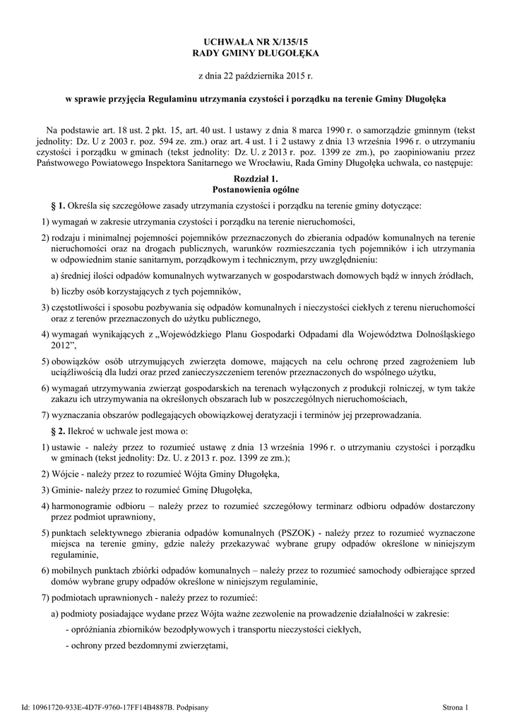 UCHWAŁA NR X/135/15 RADY GMINY DŁUGOŁĘKA z dnia 22 października 2015 r. w sprawie przyjęcia Regulaminu utrzymania czystości i porządku na terenie Gminy Długołęka Na podstawie art. 18 ust. 2 pkt. 15, art. 40 ust. 1 ustawy z dnia 8 marca 1990 r. o samorządzie gminnym (tekst jednolity: Dz. U z 2003 r. poz. 594 ze. zm.) oraz art. 4 ust. 1 i 2 ustawy z dnia 13 września 1996 r. o utrzymaniu czystości i porządku w gminach (tekst jednolity: Dz. U. z 2013 r. poz. 1399 ze zm.), po zaopiniowaniu przez Państwowego Powiatowego Inspektora Sanitarnego we Wrocławiu, Rada Gminy Długołęka uchwala, co następuje: Rozdział 1. Postanowienia ogólne § 1. Określa się szczegółowe zasady utrzymania czystości i porządku na terenie gminy dotyczące: 1) wymagań w zakresie utrzymania czystości i porządku na terenie nieruchomości, 2) rodzaju i minimalnej pojemności pojemników przeznaczonych do zbierania odpadów komunalnych na terenie nieruchomości oraz na drogach publicznych, warunków rozmieszczania tych pojemników i ich utrzymania w odpowiednim stanie sanitarnym, porządkowym i technicznym, przy uwzględnieniu: a) średniej ilości odpadów komunalnych wytwarzanych w gospodarstwach domowych bądź w innych źródłach, b) liczby osób korzystających z tych pojemników, 3) częstotliwości i sposobu pozbywania się odpadów komunalnych i nieczystości ciekłych z terenu nieruchomości oraz z terenów przeznaczonych do użytku publicznego, 4) wymagań wynikających z „Wojewódzkiego Planu Gospodarki Odpadami dla Województwa Dolnośląskiego 2012”, 5) obowiązków osób utrzymujących zwierzęta domowe, mających na celu ochronę przed zagrożeniem lub uciążliwością dla ludzi oraz przed zanieczyszczeniem terenów przeznaczonych do wspólnego użytku, 6) wymagań utrzymywania zwierząt gospodarskich na terenach wyłączonych z produkcji rolniczej, w tym także zakazu ich utrzymywania na określonych obszarach lub w poszczególnych nieruchomościach, 7) wyznaczania obszarów podlegających obowiązkowej deratyzacji i terminów jej przeprowadzania. § 2. Ilekroć w uchwale jest mowa o: 1) ustawie - należy przez to rozumieć ustawę z dnia 13 września 1996 r. o utrzymaniu czystości i porządku w gminach (tekst jednolity: Dz. U. z 2013 r. poz. 1399 ze zm.); 2) Wójcie - należy przez to rozumieć Wójta Gminy Długołęka, 3) Gminie- należy przez to rozumieć Gminę Długołęka, 4) harmonogramie odbioru – należy przez to rozumieć szczegółowy terminarz odbioru odpadów dostarczony przez podmiot uprawniony, 5) punktach selektywnego zbierania odpadów komunalnych (PSZOK) - należy przez to rozumieć wyznaczone miejsca na terenie gminy, gdzie należy przekazywać wybrane grupy odpadów określone w niniejszym regulaminie, 6) mobilnych punktach zbiórki odpadów komunalnych – należy przez to rozumieć samochody odbierające sprzed domów wybrane grupy odpadów określone w niniejszym regulaminie, 7) podmiotach uprawnionych - należy przez to rozumieć: a) podmioty posiadające wydane przez Wójta ważne zezwolenie na prowadzenie działalności w zakresie: - opróżniania zbiorników bezodpływowych i transportu nieczystości ciekłych, - ochrony przed bezdomnymi zwierzętami, Id: 10961720-933E-4D7F-9760-17FF14B4887B. Podpisany Strona 1 - prowadzenia schronisk dla bezdomnych zwierząt, a także grzebowisk i spalarni zwłok zwierzęcych i ich części, b) podmioty wpisane do prowadzonego przez Wójta rejestru działalności regulowanej w zakresie odbierania odpadów komunalnych. Rozdział 2. Wymagania w zakresie utrzymania czystości i porządku na terenie nieruchomości § 3. 1. Właściciele nieruchomości zapewniają utrzymanie czystości i porządku na terenie nieruchomości poprzez: 1) wyposażenie nieruchomości w pojemniki kompletne i zdatne do użytkowania, przystosowane do rozładunku za pomocą standardowych śmieciarek, o minimalnej pojemności ustalonej zgodnie z § 6 ust. 2 i 4, służące do zbierania odpadów komunalnych oraz utrzymywanie tych urządzeń w odpowiednim stanie sanitarnym, porządkowym i technicznym, 2) gromadzenie odpadów w pojemnikach do tego przeznaczonych, 3) oddzielne gromadzenie ścieków bytowych i gnojówki, 4) usuwanie z terenu nieruchomości pojazdów mechanicznych wycofanych z eksploatacji, 5) niezwłoczne usuwanie błota, śniegu, lodu i innych zanieczyszczeń z części nieruchomości służących do użytku publicznego, 2. Na terenie gminy Długołęka obowiązkowi selektywnego zbierania odpadów komunalnych na terenie nieruchomości podlegają następujące rodzaje odpadów: 1) papier i makulatura, 2) metale, tworzywa sztuczne, opakowania wielomateriałowe, 3) opakowania ze szkła, 4) odpady ulegające biodegradacji, w tym odpady opakowaniowe ulegające biodegradacji oraz odpady zielone, 5) przeterminowane leki i chemikalia, 6) zużyte baterie i akumulatory, 7) zużyty sprzęt elektryczny i elektroniczny, 8) meble i inne odpady wielkogabarytowe, 9) odpady budowlane i rozbiórkowe, 10) zużyte opony. 3. Selektywne zbieranie odpadów: tj. papieru i makulatury, tworzyw wielomateriałowych, metali, opakowań ze szkła należy prowadzić systemem: sztucznych, opakowań 1) indywidualnym – przeznaczonym dla zabudowy jednorodzinnej, bliźniaczej, szeregowej i budynków wielorodzinnych, w których liczba lokali mieszkalnych wynosi maksymalnie siedem oraz dla nieruchomości niezamieszkałych, polegającym na selektywnym zbieraniu odpadów w workach foliowych o minimalnej pojemności dla szkła 60 litrów, dla pozostałych 120 litrów lub pojemnikach o minimalnej pojemności 120 litrów, 2) zbiorowym – przeznaczonym dla zabudowy wielorodzinnej (powyżej siedmiu lokali mieszkalnych), polegającym na selektywnym zbieraniu odpadów w przystosowanych do tego celu pojemnikach o minimalnej pojemności 120 litrów, 4. Selektywne zbieranie odpadów ulegających biodegradacji, w tym odpadów opakowaniowych ulegających biodegradacji i odpad
