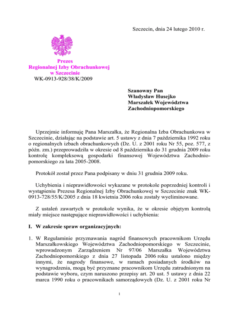 Szczecin, dnia 24 lutego 2010 r. Prezes Regionalnej Izby Obrachunkowej w Szczecinie WK-0913-928/38/K/2009 Szanowny Pan Władysław Husejko Marszałek Województwa Zachodniopomorskiego Uprzejmie informuję Pana Marszałka, że Regionalna Izba Obrachunkowa w Szczecinie, działając na podstawie art. 5 ustawy z dnia 7 października 1992 roku o regionalnych izbach obrachunkowych (Dz. U. z 2001 roku Nr 55, poz. 577, z późn. zm.) przeprowadziła w okresie od 8 października do 31 grudnia 2009 roku kontrolę kompleksową gospodarki finansowej Województwa Zachodniopomorskiego za lata 2005-2008. Protokół został przez Pana podpisany w dniu 31 grudnia 2009 roku. Uchybienia i nieprawidłowości wykazane w protokole poprzedniej kontroli i wystąpieniu Prezesa Regionalnej Izby Obrachunkowej w Szczecinie znak WK0913-728/55/K/2005 z dnia 18 kwietnia 2006 roku zostały wyeliminowane. Z ustaleń zawartych w protokole wynika, że w okresie objętym kontrolą miały miejsce następujące nieprawidłowości i uchybienia: I. W zakresie spraw organizacyjnych: 1. W Regulaminie przyznawania nagród finansowych pracownikom Urzędu Marszałkowskiego Województwa Zachodniopomorskiego w Szczecinie, wprowadzonym Zarządzeniem Nr 97/06 Marszałka Województwa Zachodniopomorskiego z dnia 27 listopada 2006 roku ustalono między innymi, że nagrody finansowe, w ramach posiadanych środków na wynagrodzenia, mogą być przyznane pracownikom Urzędu zatrudnionym na podstawie wyboru, czym naruszono przepisy art. 20 ust. 5 ustawy z dnia 22 marca 1990 roku o pracownikach samorządowych (Dz. U. z 2001 roku Nr 1 142, poz. 1593 z późn. zm.), za co odpowiedzialność ponosi Dyrektor Wydziału Organizacji i Rozwoju Zasobów Ludzkich, a z tytułu nadzoru Marszałek Województwa – str. 106-107 protokołu kontroli. 2. Na mocy Uchwały Nr XXIII/254/05 Sejmiku Województwa Zachodniopomorskiego z dnia 20 czerwca 2005 roku Regionalne Biuro Gospodarki Przestrzennej Województwa Zachodniopomorskiego w Szczecinie zostało przekształcone z dniem 1 stycznia 2006 roku z zakładu budżetowego w jednostkę budżetową. Obowiązujące wówczas pełnomocnictwo do podejmowania czynności zwykłego zarządu, udzielone Dyrektorowi wymienionego Biura na mocy Uchwały Nr 681/2001 Zarządu Województwa Zachodniopomorskiego z dnia 6 grudnia 2001 roku utraciło w związku z tym moc. Ustalono, że w okresie od dnia 1 stycznia 2006 roku do dnia 19 lipca 2007 roku, kiedy to Zarząd Województwa Zachodniopomorskiego udzielił Dyrektorowi Biura stosownego pełnomocnictwa na mocy Uchwały Nr 666/07 z dnia 19 lipca 2007 roku, kierownik wymienionej jednostki organizacyjnej nie posiadał udzielonego przez Zarząd Województwa pełnomocnictwa do jednoosobowego działania w imieniu kierowanej jednostki i mimo jego braku podejmował czynności zwykłego zarządu, czym naruszono art. 56 ust. 1 ustawy z dnia 5 czerwca 1998 roku o samorządzie województwa (Dz. U. z 2001 roku Nr 142, poz. 1590 z późn. zm.) oraz § 6 ust. 3 Statutu Regionalnego Biura Gospodarki Przestrzennej ustalonego jako załącznik do Uchwały Nr XXX/354/06 Sejmiku Województwa Zachodniopomorskiego z dnia 19 czerwca 2006 roku, za co odpowiedzialność ponosi Dyrektor ówczesnego Departamentu Polityki Regionalnej i Zarząd Województwa – str. 220-221 protokołu kontroli. II. W zakresie spraw budżetowych, finansowych oraz sprawozdawczości: 1. W zakresie dokonywania wydatków związanych z podróżami służbowymi pracowników Urzędu Marszałkowskiego i radnych Sejmiku Województwa oraz rozliczaniem kosztów używania samochodów prywatnych do celów służbowych stwierdzono uchybienia, które dotyczyły stosunkowo niskich kwot, niemniej jednak należy zwrócić uwagę na ich wystąpienie: a) w latach 2007-2008 stwierdzono przypadki odbycia krajowej podróży służbowej w terminie i miejscu innym niż określone przez pracodawcę oraz nienaliczenia należnej diety, czym naruszono § 3 i § 4 ust. 2 pkt 1 lit. a rozporządzenia Ministra Pracy i Polityki Społecznej z dnia 19 grudnia 2002 roku w sprawie wysokości oraz warunków ustalania należności przysługujących pracownikowi zatrudnionemu w państwowej lub samorządowej jednostce sfery budżetowej z tytułu podróży służbowej na obszarze kraju (Dz. U. Nr 236, poz. 1990 z późn. zm.), za co 2 odpowiedzialność ponoszą: Dyrektor Wydziału Zarządzania Regionalnym Programem Operacyjnym, Kierownik Biura Świadczeń Rodzinnych przy Regionalnym Ośrodku Polityki Społecznej oraz Podinspektor w Biurze Księgowości Urzędu Marszałkowskiego – str. 113-115 protokołu kontroli, b) w 2008 roku stwierdzono przypadki niewskazania na poleceniach wyjazdów służbowych pracowników poza granice kraju środka transportu właściwego do odbycia podróży służbowej, czym naruszono § 8 ust. 1 rozporządzenia Ministra Pracy i Polityki Społecznej z 19 grudnia 2002 roku w sprawie wysokości oraz warunków ustalania należności przysługujących pracownikowi zatrudnionemu w państwowej lub samorządowej jednostce sfery budżetowej z tytułu podróży służbowej poza granicami kraju (Dz. U. Nr 236, poz. 1991 z późn. zm.), za co odpowiedzialność ponosi Dyrektor Wydziału Współpracy Międzynarodowej – str. 118-119 protokołu kontroli, c) na przykładzie II i III kwartału 2008 roku stwierdzono przypadki niewłaściwego naliczania i wypłacania kwot należnych pracownikom Urzędu Marszałkowskiego z tytułu używania prywatnych samochodów do celów służbowych, czym naruszono § 4 rozporządzenia Ministra Infrastruktury z dnia 25 marca 2002 roku w sprawie warunków ustalania oraz sposobu dokonywania zwrotu kosztów używania do celów służbowych samochodów osobowych, motocykli i motorowerów niebędących własnością pracodawcy (Dz. U. Nr 27, poz. 271 z późn. zm.), za co odpowiedzialność ponosi Główny Specjalista w Wydziale Organizacji i Rozwoju Zasobów Ludzkich – str. 116-117 protokołu kontroli, d) stwierdzono przyp