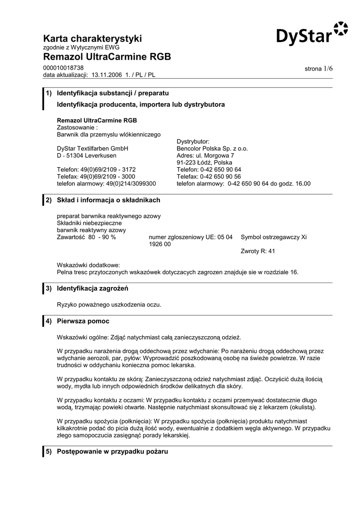 Karta charakterystyki zgodnie z Wytycznymi EWG Remazol UltraCarmine RGB 000010018738 data aktualizacji: 13.11.2006 1. / PL / PL strona 1/6 1) Identyfikacja substancji / preparatu Identyfikacja producenta, importera lub dystrybutora Remazol UltraCarmine RGB Zastosowanie : Barwnik dla przemyslu wlókienniczego DyStar Textilfarben GmbH D - 51304 Leverkusen Telefon: 49(0)69/2109 - 3172 Telefax: 49(0)69/2109 - 3000 telefon alarmowy: 49(0)214/3099300 Dystrybutor: Bencolor Polska Sp. z o.o. Adres: ul. Morgowa 7 91-223 Łódź, Polska Telefon: 0-42 650 90 64 Telefax: 0-42 650 90 56 telefon alarmowy: 0-42 650 90 64 do godz. 16.00 2) Skład i informacja o składnikach preparat barwnika reaktywnego azowy Składniki niebezpieczne barwnik reaktywny azowy Zawartość 80 - 90 % numer zgloszeniowy UE: 05 04 1926 00 Symbol ostrzegawczy Xi Zwroty R: 41 Wskazówki dodatkowe: Pelna tresc przytoczonych wskazówek dotyczacych zagrozen znajduje sie w rozdziale 16. 3) Identyfikacja zagrożeń Ryzyko poważnego uszkodzenia oczu. 4) Pierwsza pomoc Wskazówki ogólne: Zdjąć natychmiast całą zanieczyszczoną odzież. W przypadku narażenia drogą oddechową przez wdychanie: Po narażeniu drogą oddechową przez wdychanie aerozoli, par, pyłów: Wyprowadzić poszkodowaną osobę na świeże powietrze. W razie trudności w oddychaniu konieczna pomoc lekarska. W przypadku kontaktu ze skórą: Zanieczyszczoną odzież natychmiast zdjąć. Oczyścić dużą ilością wody, mydła lub innych odpowiednich środków delikatnych dla skóry. W przypadku kontaktu z oczami: W przypadku kontaktu z oczami przemywać dostatecznie długo wodą, trzymając powieki otwarte. Następnie natychmiast skonsultować się z lekarzem (okulistą). W przypadku spożycia (połknięcia): W przypadku spożycia (połknięcia) produktu natychmiast kilkakrotnie podać do picia dużą ilość wody, ewentualnie z dodatkiem węgla aktywnego. W przypadku złego samopoczucia zasięgnąć porady lekarskiej. 5) Postępowanie w przypadku pożaru Karta charakterystyki zgodnie z Wytycznymi EWG Remazol UltraCarmine RGB 000010018738 data aktualizacji: 13.11.2006 1. / PL / PL strona 2/6 Odpowiednie środki gaśnicze: mgła wodna, piana, suche środki gaśnicze środki gaszące nieprzydatne ze względów bezpieczeństwa: CO2 Specjalne wyposażenie ochronne przy gaszeniu pożaru: Przy zwalczaniu pożaru konieczny sprzęt do oddychania z niezależnym dopływem powietrza. Dodatkowe dane: Pozostalosci po pozarze i skazona woda uzyta do gaszenia musza byc utylizowane zgodnie z przepisami miejscowych wladz. 6) Postępowanie w przypadku niezamierzonego uwolnienia do środowiska Środki ostrożności mające na celu dobro ludzi: Zapobiegać powstawaniu i odkładaniu się pyłu. Działania mające na celu ochronę środowiska: Nie dopuszczać do przedostania się do kanalizacji i wód. Sposób oczyszczania/zbieranie: Rozsypany materiał zebrać przy użyciu środka wiążącego pył lub zastosować odsysanie za pomocą odpowiedniego odkurzacza. Umieścić w oznakowanych, zamykanych pojemnikach. Dodatkowe wskazówki: Dodatkowa utylizacja patrz rozdzial 13. 7) Postępowanie z substancją/preparatem* i jej/jego* magazynowanie Wskazówki na temat bezpiecznego obchodzenia się z produktem: Zapobiegać powstawaniu i odkładaniu się pyłu. Przechowywać pojemnik szczelnie zamknięty, w suchym miejscu. Wskazówki dotyczące ochrony przeciwpożarowej i przeciwwybuchowej: Stosować środki ostrożności konieczne przy obchodzeniu się z chemikaliami, których pyły są wybuchowe. (Niemcy: VDI 2263. Inne kraje: przestrzegać przepisów obowiązujących w danym kraju). Wymagania dotyczące pomieszczeń magazynowych i opakowań/pojemników: Produkt przechowywać w oryginalnym opakowaniu w suchym i chłodnym miejscu. W czasie operacji napełniania produktem pojemników podjąć środki zapobiegające wyładowaniom elektrostatycznym. Czas i warunki magazynowania Czas przechowywania: 60 m-cy. 8) Kontrola narażenia i środki ochrony indywidualnej Karta charakterystyki zgodnie z Wytycznymi EWG Remazol UltraCarmine RGB 000010018738 data aktualizacji: 13.11.2006 1. / PL / PL strona 3/6 ogólne środki ochrony: Nie wdychać pyłu. Unikać zanieczyszczenia skóry i oczu. Zanieczyszczoną odzież natychmiast zdjąć. WSKAZÓWKA: W PRZYPADKU MAREK GRANULATÓW CHODZI O SYPKIE, SZCZEGÓLNIE MAŁO PYLĄCE SIĘ PREPARATY BARWNIKÓW REAKTYWNYCH. POPRZEZ OSTROŻNE OBCHODZENIE SIĘ MOŻNA W JAK NAJDALEJ IDĄCYM STOPNIU ZAPOBIEC PYLENIU. Bezwzglednie unikac wdychania pylów i areozoli ( dobra wentylacja wyciagowa/odsysanie lub odpowiednie maski ). Osoby cierpiace na chroniczne choroby dróg oddechowych nie powinny pracowac z markami proszkowych barwników reaktywnych. Jezeli w zwiazku z pracami z markami proszkowych barwników reaktywnych wystepuja takie dolegliwosci jak brak tchu lub astma, nalezy szybko skonsultowac sie z lekarzem. W przypadku potwierdzonej wrazliwosci na marki proszkowych barwników reaktywnych nalezy natychmiast zaprzestac kontaktu z ich pylami . Środki higieny: Nie przechowywać razem z żywnością i napojami. W czasie pracy nie jeść, nie pić, nie palić tytoniu. Przed przerwami oraz po zakończeniu pracy myć ręce i smarować maścią chroniącą skórę. Sprzęt ochronny dróg oddechowych : maska przeciwpylna z filtrem czastkowym. Ochrona rąk: nalezy nosic odpowiednie rekawice ochronne, np. z polichlorku winylu lub kauczuku nitrylowego w przypadku zanieczyszczenia nalezy natychmiast zmienic rekawice ochronne. Ochrona oczu : okulary ochronne z ochrona boczna Ochrona ciała : Nosić odzież ochronną. 9) Właściwości fizykochemiczne Postać : granulat Kolor : czerwony Zapach bez zapachu Temperatura zapłonu : > 100 °C Gęstość : ok. 1,1 g/cm3 Rozpuszczalność w wodzie: ulega mieszaniu Wartość pH: ok. 5 - 6 (20 °C) 10) Stabilność i reaktywność Rozkład termiczny Przy właściwym przechowywaniu i obchodzeniu się z substancją rozkład termiczny nie następ