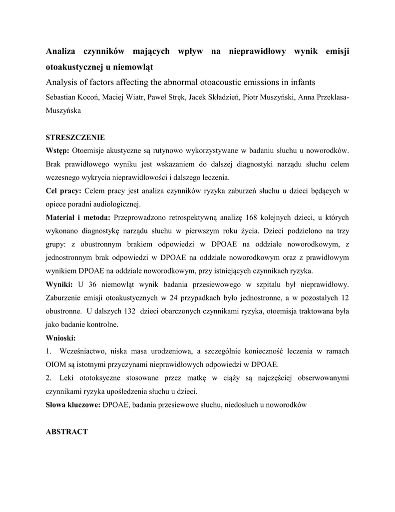 Analiza czynników mających wpływ na nieprawidłowy wynik emisji otoakustycznej u niemowląt Analysis of factors affecting the abnormal otoacoustic emissions in infants Sebastian Kocoń, Maciej Wiatr, Paweł Stręk, Jacek Składzień, Piotr Muszyński, Anna PrzeklasaMuszyńska STRESZCZENIE Wstęp: Otoemisje akustyczne są rutynowo wykorzystywane w badaniu słuchu u noworodków. Brak prawidłowego wyniku jest wskazaniem do dalszej diagnostyki narządu słuchu celem wczesnego wykrycia nieprawidłowości i dalszego leczenia. Cel pracy: Celem pracy jest analiza czynników ryzyka zaburzeń słuchu u dzieci będących w opiece poradni audiologicznej. Materiał i metoda: Przeprowadzono retrospektywną analizę 168 kolejnych dzieci, u których wykonano diagnostykę narządu słuchu w pierwszym roku życia. Dzieci podzielono na trzy grupy: z obustronnym brakiem odpowiedzi w DPOAE na oddziale noworodkowym, z jednostronnym brak odpowiedzi w DPOAE na oddziale noworodkowym oraz z prawidłowym wynikiem DPOAE na oddziale noworodkowym, przy istniejących czynnikach ryzyka. Wyniki: U 36 niemowląt wynik badania przesiewowego w szpitalu był nieprawidłowy. Zaburzenie emisji otoakustycznych w 24 przypadkach było jednostronne, a w pozostałych 12 obustronne. U dalszych 132 dzieci obarczonych czynnikami ryzyka, otoemisja traktowana była jako badanie kontrolne. Wnioski: 1. Wcześniactwo, niska masa urodzeniowa, a szczególnie konieczność leczenia w ramach OIOM są istotnymi przyczynami nieprawidłowych odpowiedzi w DPOAE. 2. Leki ototoksyczne stosowane przez matkę w ciąży są najczęściej obserwowanymi czynnikami ryzyka upośledzenia słuchu u dzieci. Słowa kluczowe: DPOAE, badania przesiewowe słuchu, niedosłuch u noworodków ABSTRACT Introduction: Otoacoustic emissions are routine diagnostics in hearing examination of newborns. Lack of right responses in DPOAE is an indication to father diagnostic procedures to know the reason and institute treatment. Aim: The aim of this paper is analysis of hearing impairment factors in children which are treated in the audiological out-patients ward. Material and methods: We analyzed retrospectively 168 consecutive children in which diagnostic of hearing apparatus was perform in the first year of life. Children were divided into three groups: with bilateral lack of otoacoustic emissions in newborn ward, with unilateral lack of otoacoustic emissions in newborn ward and with right responses in otoacoustic emissions but with presence of risk factors of hearing impairment in history. Results: In 36 cases results of screening otoacoustic emissions was wrong. Unilateral disturbance of this examination was observed in 24 cases and bilateral in 12 cases. 132 children have right responses in otoacoustic emissions but risk factors of hearing impairment were present. Conclusions: 1. Immaturity, low birthweight and therapy in intensive care ward are important reasons of disturbance in otoacoustic emissions. 2. Administration of ototoxic medications in pregnancy is the most common risk factor of hearing impairment in children. Key words: DPOAE, Screening hearing test, Hearing loss in newborns