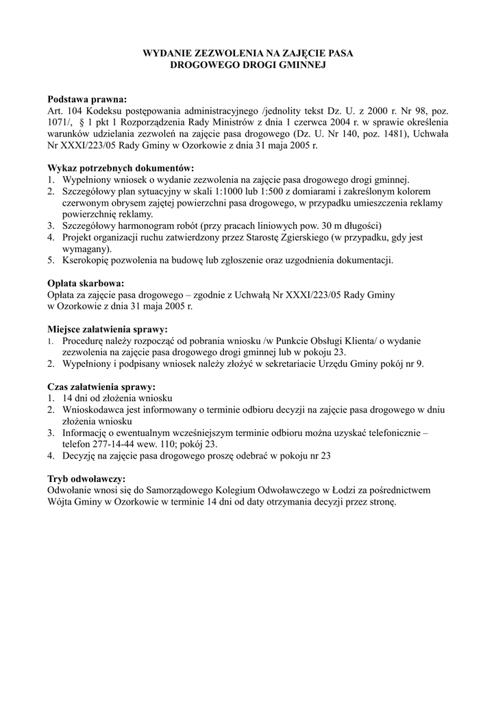 WYDANIE ZEZWOLENIA NA ZAJĘCIE PASA DROGOWEGO DROGI GMINNEJ Podstawa prawna: Art. 104 Kodeksu postępowania administracyjnego /jednolity tekst Dz. U. z 2000 r. Nr 98, poz. 1071/, § 1 pkt 1 Rozporządzenia Rady Ministrów z dnia 1 czerwca 2004 r. w sprawie określenia warunków udzielania zezwoleń na zajęcie pasa drogowego (Dz. U. Nr 140, poz. 1481), Uchwała Nr XXXI/223/05 Rady Gminy w Ozorkowie z dnia 31 maja 2005 r. Wykaz potrzebnych dokumentów: 1. Wypełniony wniosek o wydanie zezwolenia na zajęcie pasa drogowego drogi gminnej. 2. Szczegółowy plan sytuacyjny w skali 1:1000 lub 1:500 z domiarami i zakreślonym kolorem czerwonym obrysem zajętej powierzchni pasa drogowego, w przypadku umieszczenia reklamy powierzchnię reklamy. 3. Szczegółowy harmonogram robót (przy pracach liniowych pow. 30 m długości) 4. Projekt organizacji ruchu zatwierdzony przez Starostę Zgierskiego (w przypadku, gdy jest wymagany). 5. Kserokopię pozwolenia na budowę lub zgłoszenie oraz uzgodnienia dokumentacji. Opłata skarbowa: Opłata za zajęcie pasa drogowego – zgodnie z Uchwałą Nr XXXI/223/05 Rady Gminy w Ozorkowie z dnia 31 maja 2005 r. Miejsce załatwienia sprawy: 1. Procedurę należy rozpocząć od pobrania wniosku /w Punkcie Obsługi Klienta/ o wydanie zezwolenia na zajęcie pasa drogowego drogi gminnej lub w pokoju 23. 2. Wypełniony i podpisany wniosek należy złożyć w sekretariacie Urzędu Gminy pokój nr 9. Czas załatwienia sprawy: 1. 14 dni od złożenia wniosku 2. Wnioskodawca jest informowany o terminie odbioru decyzji na zajęcie pasa drogowego w dniu złożenia wniosku 3. Informację o ewentualnym wcześniejszym terminie odbioru można uzyskać telefonicznie – telefon 277-14-44 wew. 110; pokój 23. 4. Decyzję na zajęcie pasa drogowego proszę odebrać w pokoju nr 23 Tryb odwoławczy: Odwołanie wnosi się do Samorządowego Kolegium Odwoławczego w Łodzi za pośrednictwem Wójta Gminy w Ozorkowie w terminie 14 dni od daty otrzymania decyzji przez stronę. Ozorków, dnia .................................... Wójt Gminy w Ozorkowie ul. Wigury 14 95-035 Ozorków WNIOSEK o wydanie zezwolenia na zajęcie pasa drogowego drogi gminnej ................................................................................................................................................................................................ ... (nazwa drogi lub nazwa ulicy, miejscowość, rodzaj budowy ) w celu (odpowiednie zakreślić): 1. prowadzenia robót w pasie drogowym 2. umieszczania w pasie drogowym urządzeń infrastruktury technicznej niezwiązanych z potrzebami zarządzania drogami lub potrzebami ruchu drogowego 3. umieszczania w pasie drogowym obiektów budowlanych niezwiązanych z potrzebami zarządzania drogami (kioski i reklamy) 4. zajęcia pasa drogowego na prawach wyłączności w celach innych niż wymienione w pkt 1 –3. Kserokopia pozwolenia na budowę lub zgłoszenie*……...................................................... Nr ......................................... z dnia .................................................................................................................. Wnioskodawca**: ................................................................................................................................................................................................ (pełna nazwa / nazwisko, pierwsze imię, drugie imię) NIP ....................................................................................... REGON / PESEL .................................................................. Adres zamieszkania: .........................................................................................................Telefon: ..................................... Wnioskuję o wydanie zezwolenia na czasowe zajęcie elementów pasa drogowego w celu prowadzenia robót: jezdni do 50 % szerokości: powierzchnia: ........................................... m2 jezdni powyżej 50 % szerokości: powierzchnia: ........................................... m2 chodnika, zieleńca, pobocza, rowu***: powierzchnia: ........................................... m2 teren poza krawędzią rowu: powierzchnia: ........................................... m2 Planowany okres zajęcia pasa drogowego w celu prowadzenia robót: od dnia .......................................................... do dnia .................................................................... Umieszczenie w pasie drogowym urządzeń infrastruktury technicznej niezwiązanych z potrzebami zarządzania ruchem lub potrzebami ruchu drogowego: a) pas drogowy poza obszarem zabudowanym ............................................................................... – powierzchnia pasa (sposób umieszczenia względem drogi) b) drogowego drogi gminnej zajętej przez rzut poziomy umieszczonego urządzenia .............................................. m2 pas drogowy w obszarze zabudowanym ......................................................................................... –powierzchnia pasa (sposób umieszczenia względem drogi) drogowego drogi gminnej zajętej przez rzut poziomy umieszczonego urządzenia .............................................. m2 Okres umieszczenia urządzenia w pasie drogowym: od dnia ........................................................................................... do dnia ..................................................................... Wnioskuję o wydanie zezwolenia na zajęcie elementów pasa drogowego w celu umieszczenia obiektu handlowego lub reklamy: reklama (jednostronna /dwustronna): powierzchnia ........................................... m2 o treści: .......................................................................................................................................................................... obiekt handlowy: powierzchnia ........................................... m2 Planowany okres zajęcia pasa drogowego w celu umieszcz