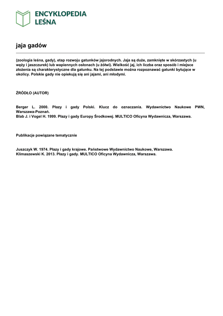 jaja gadów (zoologia leśna, gady), etap rozwoju gatunków jajorodnych. Jaja są duże, zamknięte w skórzastych (u węży i jaszczurek) lub wapiennych osłonach (u żółwi). Wielkość jaj, ich liczba oraz sposób i miejsce złożenia są charakterystyczne dla gatunku. Na tej podstawie można rozpoznawać gatunki bytujące w okolicy. Polskie gady nie opiekują się ani jajami, ani młodymi. ŹRÓDŁO (AUTOR) Berger L. 2000. Płazy i gady Polski. Klucz do oznaczania. Wydawnictwo Naukowe PWN, Warszawa-Poznań. Blab J. i Vogel H. 1999. Płazy i gady Europy Środkowej. MULTICO Oficyna Wydawnicza, Warszawa. Publikacje powiązane tematycznie Juszczyk W. 1974. Płazy i gady krajowe. Państwowe Wydawnictwo Naukowe, Warszawa. Klimaszewski K. 2013. Płazy i gady. MULTICO Oficyna Wydawnicza, Warszawa.