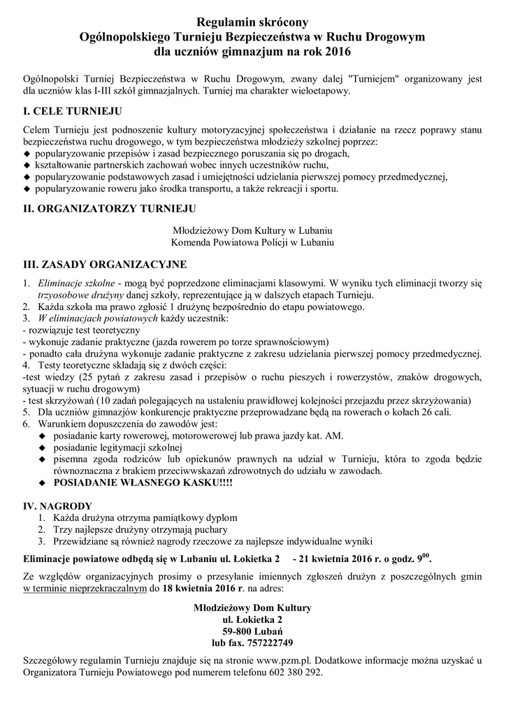 Regulamin skrócony Ogólnopolskiego Turnieju Bezpieczeństwa w Ruchu Drogowym dla uczniów gimnazjum na rok 2016 Ogólnopolski Turniej Bezpieczeństwa w Ruchu Drogowym, zwany dalej "Turniejem" organizowany jest dla uczniów klas I-III szkół gimnazjalnych. Turniej ma charakter wieloetapowy. I. CELE TURNIEJU Celem Turnieju jest podnoszenie kultury motoryzacyjnej społeczeństwa i działanie na rzecz poprawy stanu bezpieczeństwa ruchu drogowego, w tym bezpieczeństwa młodzieży szkolnej poprzez: u popularyzowanie przepisów i zasad bezpiecznego poruszania się po drogach, u kształtowanie partnerskich zachowań wobec innych uczestników ruchu, u popularyzowanie podstawowych zasad i umiejętności udzielania pierwszej pomocy przedmedycznej, u popularyzowanie roweru jako środka transportu, a także rekreacji i sportu. II. ORGANIZATORZY TURNIEJU Młodzieżowy Dom Kultury w Lubaniu Komenda Powiatowa Policji w Lubaniu III. ZASADY ORGANIZACYJNE 1. Eliminacje szkolne - mogą być poprzedzone eliminacjami klasowymi. W wyniku tych eliminacji tworzy się trzyosobowe drużyny danej szkoły, reprezentujące ją w dalszych etapach Turnieju. 2. Każda szkoła ma prawo zgłosić 1 drużynę bezpośrednio do etapu powiatowego. 3. W eliminacjach powiatowych każdy uczestnik: - rozwiązuje test teoretyczny - wykonuje zadanie praktyczne (jazda rowerem po torze sprawnościowym) - ponadto cała drużyna wykonuje zadanie praktyczne z zakresu udzielania pierwszej pomocy przedmedycznej. 4. Testy teoretyczne składają się z dwóch części: -test wiedzy (25 pytań z zakresu zasad i przepisów o ruchu pieszych i rowerzystów, znaków drogowych, sytuacji w ruchu drogowym) - test skrzyżowań (10 zadań polegających na ustaleniu prawidłowej kolejności przejazdu przez skrzyżowania) 5. Dla uczniów gimnazjów konkurencje praktyczne przeprowadzane będą na rowerach o kołach 26 cali. 6. Warunkiem dopuszczenia do zawodów jest: u posiadanie karty rowerowej, motorowerowej lub prawa jazdy kat. AM. u posiadanie legitymacji szkolnej u pisemna zgoda rodziców lub opiekunów prawnych na udział w Turnieju, która to zgoda będzie równoznaczna z brakiem przeciwwskazań zdrowotnych do udziału w zawodach. u POSIADANIE WŁASNEGO KASKU!!!! IV. NAGRODY 1. Każda drużyna otrzyma pamiątkowy dyplom 2. Trzy najlepsze drużyny otrzymają puchary 3. Przewidziane są również nagrody rzeczowe za najlepsze indywidualne wyniki Eliminacje powiatowe odbędą się w Lubaniu ul. Łokietka 2 - 21 kwietnia 2016 r. o godz. 900. Ze względów organizacyjnych prosimy o przesyłanie imiennych zgłoszeń drużyn z poszczególnych gmin w terminie nieprzekraczalnym do 18 kwietnia 2016 r. na adres: Młodzieżowy Dom Kultury ul. Łokietka 2 59-800 Lubań lub fax. 757222749 Szczegółowy regulamin Turnieju znajduje się na stronie www.pzm.pl. Dodatkowe informacje można uzyskać u Organizatora Turnieju Powiatowego pod numerem telefonu 602 380 292.