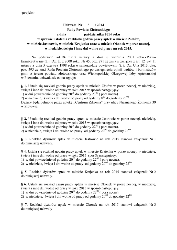 -projekt- Uchwała Nr / / 2014 Rady Powiatu Złotowskiego z dnia października 2014 roku w sprawie ustalenia rozkładu godzin pracy aptek w mieście Złotów, w mieście Jastrowie, w mieście Krajenka oraz w mieście Okonek w porze nocnej, w niedzielę, święta i inne dni wolne od pracy na rok 2015. Na podstawie art. 94 ust. 2 ustawy z dnia 6 września 2001 roku - Prawo farmaceutyczne (t. j. Dz. U. z 2008 roku, Nr 45, poz. 271 ze zm.) w związku z art. 12 pkt 11 ustawy z dnia 5 czerwca 1998 roku o samorządzie powiatowym (t. j. Dz. U. z 2013 roku, poz. 595 ze zm.) Rada Powiatu Złotowskiego po zasięgnięciu opinii wójtów i burmistrzów gmin z terenu powiatu złotowskiego oraz Wielkopolskiej Okręgowej Izby Aptekarskiej w Poznaniu, uchwala się co następuje: § 1. Ustala się rozkład godzin pracy aptek w mieście Złotów w porze nocnej, w niedzielę, święta i inne dni wolne od pracy w roku 2015 w sposób następujący: 1) w dni powszednie od godziny 2000 do godziny 2300 ( pora nocna). 2) w niedziele, święta i dni wolne od pracy od godziny 800 do godziny 2300. DyŜury będą pełnione przez aptekę ,,Centrum Zdrowia” przy ulicy Nieznanego śołnierza 39 w Złotowie. § 2. Ustala się rozkład godzin pracy aptek w mieście Jastrowie w porze nocnej, niedzielę, święta i inne dni wolne od pracy w roku 2015 w sposób następujący: 1) w dni powszednie od godziny 2000 do godziny 2200 ( pora nocna). 2) w niedziele, święta i dni wolne od pracy od godziny 2000 do godziny 2200. § 3. Rozkład dyŜurów aptek w mieście Jastrowie na rok 2015 stanowi załącznik Nr 1 do niniejszej uchwały. § 4. Ustala się rozkład godzin pracy aptek w mieście Krajenka w porze nocnej, w niedzielę, święta i inne dni wolne od pracy w roku 2015 sposób następujący: 1) w dni powszednie od godziny 2000 do godziny 2200 ( pora nocna). 2) w niedziele, święta i dni wolne od pracy od godziny 2000 do godziny 2200. § 5. Rozkład dyŜurów aptek w mieście Krajenka na rok 2015 stanowi załącznik Nr 2 do niniejszej uchwały. § 6. Ustala się rozkład czasu pracy apteki w mieście Okonek w porze nocnej, w niedzielę, święta i inne dni wolne od pracy w roku 2015 w sposób następujący: 1) w dni powszednie od godziny 2000 do godziny 2200 ( pora nocna). 2) w niedziele, święta i dni wolne od pracy od godziny 2000 do godziny 2200. § 7. Rozkład dyŜurów aptek w mieście Okonek na rok 2015 stanowi załącznik Nr 3 do niniejszej uchwały § 8. Wykonanie uchwały powierza się Zarządowi Powiatu Złotowskiego. § 9. Uchwała wchodzi w Ŝycie po upływie 14 dni od dnia jej ogłoszenia w Dzienniku Urzędowym Województwa Wielkopolskiego. Uzasadnienie do uchwały Nr / /2014 Rady Powiatu Złotowskiego z dnia października 2014 roku w sprawie ustalenia rozkładu godzin pracy aptek w mieście Złotów, w mieście Jastrowie, w mieście Krajenka oraz w mieście Okonek w porze nocnej, w niedzielę, święta i inne dni wolne od pracy na rok 2015. Podstawę prawną podjęcia uchwały stanowią: - art. 94 ust. 2 ustawy z dnia 6 września 2001 roku – Prawo farmaceutyczne, stanowiący Ŝe rozkład godzin pracy aptek ogólnodostępnych na danym terenie określa w drodze uchwały, rada powiatu, po zasięgnięciu opinii wójtów i burmistrzów gmin z terenu powiatu i samorządu aptekarskiego, - art.12 pkt 11 ustawy o samorządzie powiatowym, który stanowi, Ŝe do wyłącznej właściwości rady powiatu naleŜy podejmowanie uchwał w innych sprawach zastrzeŜonych ustawami do kompetencji rady powiatu, Z mocy art. 94 ust. 2 ustawy z dnia 6 września 2001 roku – Prawo farmaceutyczne (t. j. Dz. U. z 2008 roku, Nr 45, poz. 271 – tekst jednolity ze zm.) rozkład godzin pracy aptek ogólnodostępnych powinien być dostosowany do potrzeb ludności i zapewniać dostępność świadczeń równieŜ w porze nocnej, w niedzielę, święta i inne dni wolne od pracy. Rozkład godzin pracy aptek ogólnodostępnych na danym terenie określa, w drodze uchwały, rada powiatu po zasięgnięciu opinii wójtów (burmistrzów, prezydentów miast) gmin z terenu powiatu i samorządu aptekarskiego. Rozkład godzin pracy aptek został pozytywnie zaopiniowany przez burmistrzów i wójtów z terenu powiatu złotowskiego oraz przez Wielkopolską Okręgową Izbę Aptekarską w Poznaniu. Na terenie miasta Złotowa w 2015 roku dyŜurować będzie tylko apteka ,,Centrum Zdrowia” przy ulicy Nieznanego śołnierza 39. DyŜury będą pełnione w sposób następujący: 1) w dni powszednie od godziny 2000 do godziny 2300 ( pora nocna) 2) w niedziele, święta i dni wolne od pracy od godziny 800 do godziny 2300 . Apteki działające na terenie miasta Jastrowie w roku 2015 dyŜury będą pełnić: 1) w dni powszednie od godziny 2000 do godziny 2200 ( pora nocna) 2) w niedziele, święta i dni wolne od pracy od godziny 2000 do godziny 2200. Apteki działające na terenie miasta Krajenka w roku 2015 dyŜury będą pełnić: 1) w dni powszednie od godziny 2000 do godziny 2200 ( pora nocna) 2) w niedziele, święta i dni wolne od pracy od godziny 2000 do godziny 2200. Apteki działające na terenie miasta Okonek w roku 2015 dyŜury będą pełnić: 1) w dni powszednie od godziny 2000 do godziny 2200 ( pora nocna) 2) w niedziele, święta i dni wolne od pracy od godziny 2000 do godziny 2200. Wobec powyŜszego zasadne jest podjęcie przez Radę Powiatu Złotowskiego niniejszej uchwały.