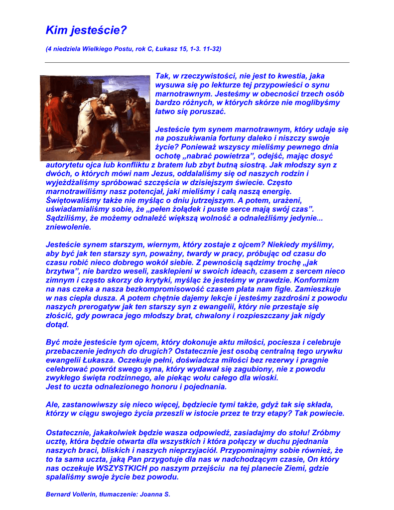 Kim jesteście? (4 niedziela Wielkiego Postu, rok C, Łukasz 15, 1-3. 11-32) Tak, w rzeczywistości, nie jest to kwestia, jaka wysuwa się po lekturze tej przypowieści o synu marnotrawnym. Jesteśmy w obecności trzech osób bardzo różnych, w których skórze nie moglibyśmy łatwo się poruszać. Jesteście tym synem marnotrawnym, który udaje się na poszukiwania fortuny daleko i niszczy swoje życie? Ponieważ wszyscy mieliśmy pewnego dnia ochotę „nabrać powietrza”, odejść, mając dosyć autorytetu ojca lub konfliktu z bratem lub zbyt butną siostrą. Jak młodszy syn z dwóch, o których mówi nam Jezus, oddalaliśmy się od naszych rodzin i wyjeżdżaliśmy spróbować szczęścia w dzisiejszym świecie. Często marnotrawiliśmy nasz potencjał, jaki mieliśmy i całą naszą energię. Świętowaliśmy także nie myśląc o dniu jutrzejszym. A potem, urażeni, uświadamialiśmy sobie, że „pełen żołądek i puste serce mają swój czas”. Sądziliśmy, że możemy odnaleźć większą wolność a odnaleźliśmy jedynie... zniewolenie. Jesteście synem starszym, wiernym, który zostaje z ojcem? Niekiedy myślimy, aby być jak ten starszy syn, poważny, twardy w pracy, próbując od czasu do czasu robić nieco dobrego wokół siebie. Z pewnością sądzimy trochę „jak brzytwa”, nie bardzo weseli, zasklepieni w swoich ideach, czasem z sercem nieco zimnym i często skorzy do krytyki, myśląc że jesteśmy w prawdzie. Konformizm na nas czeka a nasza bezkompromisowość czasem płata nam figle. Zamieszkuje w nas ciepła dusza. A potem chętnie dajemy lekcje i jesteśmy zazdrośni z powodu naszych prerogatyw jak ten starszy syn z ewangelii, który nie przestaje się złościć, gdy powraca jego młodszy brat, chwalony i rozpieszczany jak nigdy dotąd. Być może jesteście tym ojcem, który dokonuje aktu miłości, pociesza i celebruje przebaczenie jednych do drugich? Ostatecznie jest osobą centralną tego urywku ewangelii Łukasza. Oczekuje pełni, doświadcza miłości bez rezerwy i pragnie celebrować powrót swego syna, który wydawał się zagubiony, nie z powodu zwykłego święta rodzinnego, ale piekąc wołu całego dla wioski. Jest to uczta odnalezionego honoru i pojednania. Ale, zastanowiwszy się nieco więcej, będziecie tymi także, gdyż tak się składa, którzy w ciągu swojego życia przeszli w istocie przez te trzy etapy? Tak powiecie. Ostatecznie, jakakolwiek będzie wasza odpowiedź, zasiadajmy do stołu! Zróbmy ucztę, która będzie otwarta dla wszystkich i która połączy w duchu pjednania naszych braci, bliskich i naszych nieprzyjaciół. Przypominajmy sobie również, że to ta sama uczta, jaką Pan przygotuje dla nas w nadchodzącym czasie, On który nas oczekuje WSZYSTKICH po naszym przejściu na tej planecie Ziemi, gdzie spalaliśmy swoje życie bez powodu. Bernard Vollerin, tłumaczenie: Joanna S.