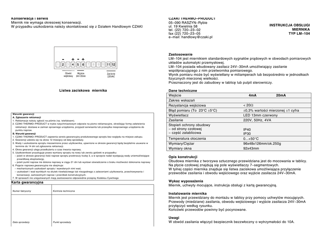 Konserwacja i serwis Miernik nie wymaga okresowej konserwacji. W przypadku uszkodzenia nale¿y skontaktowaæ siê z Dzia³em Handlowym CZAKI CZAKI THERMO-PRODUCT 05-090 RASZYN-Rybie ul. 19 Kwietnia 58 tel. (22) 720-23-02 fax (22) 720-23-05 e-mail: [email protected] INSTRUKCJA OBS£UGI MIERNIKA TYP LM-104 Zastosowanie LM-104 jest miernikiem standardowych sygna³ów pr¹dowych w obwodach pomiarowych uk³adów automatyki przemys³owej. LM-104 posiada wbudowany zasilacz 24V-30mA umo¿liwiaj¹cy zasilanie wspó³pracuj¹cego z nim przetwornika pomiarowego. Wynik pomiaru mo¿e byæ wyœwietlany w miliamperach lub bezpoœrednio w jednostkach fizycznych mierzonej wielkoœci. Przeznaczony jest do zabudowy w tablicê lub pulpit sterowniczy. Listwa zaciskowa miernika Warunki gwarancji A. Zg³aszanie reklamacji 1. Reklamacje nale¿y zg³osiæ na piœmie (np. telefaksem). 2. CZAKI THERMO–PRODUCT w trybie natychmiastowym odpowie na pismo reklamacyjne, okreœlaj¹c formê za³atwienia reklamacji: dostawa w zamian sprawnego urz¹dzenia, przyjazd serwisanta lub przesy³ka niesprawnego urz¹dzenia do punktu napraw. B. Warunki gwarancji 1. CZAKI THERMO–PRODUCT zapewnia serwis gwarancyjny produkowanego sprzêtu bez wzglêdu na miejsce zakupu. 2. Gwarancji udziela siê na okres 12 miesiêcy od daty sprzeda¿y. 3. Wady i uszkodzenia sprzêtu niezawinione przez u¿ytkownika, ujawnione w okresie gwarancji bêd¹ bezp³atnie usuwane w terminie do 14 dni od zg³oszenia reklamacji. 4. Okres gwarancji ulega przed³u¿eniu o czas trwania naprawy. 5. U¿ytkownikowi przys³uguje prawo wymiany sprzêtu na nowy lub zwrotu gotówki w przypadku: - je¿eli w okresie gwarancji iloœæ napraw sprzêtu przekroczy liczbê 3, a w sprzêcie nadal wystêpuj¹ wady uniemo¿liwiaj¹ce prawid³ow¹ eksploatacjê, - je¿eli punkt napraw nie dokona naprawy w ci¹gu 21 dni lub wystawi oœwiadczenie o braku mo¿liwoœci dokonania naprawy 6. Pojêcie naprawa gwarancyjna nie obejmuje: - mechanicznych uszkodzeñ sprzêtu i wywo³anych nimi wad, - uszkodzeñ i wad wynik³ych na skutek niew³aœciwego lub niezgodnego z zaleceniami u¿ytkowania, przechowywania i konserwacji, samowolnych napraw i przeróbek konstrukcyjnych. 7. W sprawach nie uregulowanych maj¹ zastosowanie odpowiednie przepisy Kodeksu Cywilnego Karta gwarancyjna Numer fabryczny Kontrola techniczna Data sprzeda¿y Punkt sprzeda¿y Dane techniczne Wejœcie Zakres wskazañ Rezystancja wejœciowa B³¹d pomiaru (To 23°C ±5°C) Wyœwietlacz Zasilanie Stopieñ ochrony obudowy - od strony czo³owej - czêœæ zatablicowa Temperatura otoczenia Wymiary/Ciê¿ar Wymiary okna 4mA 20mA < 20Ω ±0,3% wartoœci mierzonej ±1 cyfra LED 13mm czerwony 220V, 50Hz, 4VA IP40 IP30 0...+50°C 96x48x126mm/ok.250g 92x43mm Opis konstrukcji Obudowa miernika z tworzywa sztucznego przewidziana jest do mocowania w tablicy. Na p³ycie czo³owej znajduj¹ siê pole wyœwietlaczy 7-segmentowych. W tylnej czêœci miernika znajduje siê listwa zaciskowa umo¿liwiaj¹ca przy³¹czenie przewodów zasilania i obwodu wejœciowego oraz wyjœcie zasilacza 24V-30mA. Wykaz wyposa¿enia Miernik, uchwyty mocuj¹ce, instrukcja obs³ugi z kart¹ gwarancyjn¹. Instalowanie miernika Miernik jest przewidziany do monta¿u w tablicy przy pomocy uchwytów mocuj¹cych. Przewody (miedziane) zasilania, obwodu wejœciowego i wyjœcie zasilacza 24V-30mA przy³¹czyæ wed³ug rysunku. Koñcówki przewodów powinny byæ pocynowane. Uwagi W obwód zasilania w³¹czyæ bezpiecznik bezzw³oczny o wytrzyma³oœci do 10A.