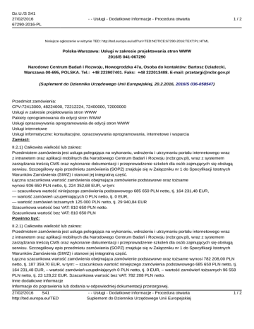 Dz.U./S S41 27/02/2016 67290-2016-PL - - Usługi - Dodatkowe informacje - Procedura otwarta 1/2 Niniejsze ogłoszenie w witrynie TED: http://ted.europa.eu/udl?uri=TED:NOTICE:67290-2016:TEXT:PL:HTML Polska-Warszawa: Usługi w zakresie projektowania stron WWW 2016/S 041-067290 Narodowe Centrum Badań i Rozwoju, Nowogrodzka 47a, Osoba do kontaktów: Bartosz Dziadecki, Warszawa 00-695, POLSKA. Tel.: +48 223907401. Faks: +48 222013408. E-mail: [email protected] (Suplement do Dziennika Urzędowego Unii Europejskiej, 20.2.2016, 2016/S 036-058547) Przedmiot zamówienia: CPV:72413000, 48224000, 72212224, 72400000, 72000000 Usługi w zakresie projektowania stron WWW Pakiety oprogramowania do edycji stron WWW Usługi opracowywania oprogramowania do edycji stron WWW Usługi internetowe Usługi informatyczne: konsultacyjne, opracowywania oprogramowania, internetowe i wsparcia Zamiast: II.2.1) Całkowita wielkość lub zakres: Przedmiotem zamówienia jest usługa polegająca na wykonaniu, wdrożeniu i utrzymaniu portalu internetowego wraz z intranetem oraz aplikacji mobilnych dla Narodowego Centrum Badań i Rozwoju (ncbr.gov.pl), wraz z systemem zarządzania treścią CMS oraz wykonanie dokumentacji i przeprowadzenie szkoleń dla osób zajmujących się obsługą serwisu. Szczegółowy opis przedmiotu zamówienia (SOPZ) znajduje się w Załączniku nr 1 do Specyfikacji Istotnych Warunków Zamówienia (SIWZ) i stanowi jej integralną część. Łączna szacunkowa wartość zamówienia obejmująca zamówienie podstawowe oraz tożsame wynosi 936 650 PLN netto, tj. 224 352,68 EUR, w tym: — szacunkowa wartość niniejszego zamówienia podstawowego 685 650 PLN netto, tj. 164 231,48 EUR, — wartość zamówień uzupełniających 0 PLN netto, tj. 0 EUR, — wartość zamówień tożsamych 125 000 PLN netto, tj. 29 940,84 EUR Szacunkowa wartość bez VAT: 810 650 PLN netto. Szacunkowa wartość bez VAT: 810 650 PLN Powinno być: II.2.1) Całkowita wielkość lub zakres: Przedmiotem zamówienia jest usługa polegająca na wykonaniu, wdrożeniu i utrzymaniu portalu internetowego wraz z intranetem oraz aplikacji mobilnych dla Narodowego Centrum Badań i Rozwoju (ncbr.gov.pl), wraz z systemem zarządzania treścią CMS oraz wykonanie dokumentacji i przeprowadzenie szkoleń dla osób zajmujących się obsługą serwisu. Szczegółowy opis przedmiotu zamówienia (SOPZ) znajduje się w Załączniku nr 1 do Specyfikacji Istotnych Warunków Zamówienia (SIWZ) i stanowi jej integralną część. Łączna szacunkowa wartość zamówienia obejmująca zamówienie podstawowe oraz tożsame wynosi 782 208,00 PLN netto, tj. 187 359,70 EUR, w tym: – szacunkowa wartość niniejszego zamówienia podstawowego 685 650 PLN netto, tj. 164 231,48 EUR, – wartość zamówień uzupełniających 0 PLN netto, tj. 0 EUR, – wartość zamówień tożsamych 96 558 PLN netto, tj. 23 128,22 EUR. Szacunkowa wartość bez VAT: 782 208 PLN netto. Inne dodatkowe informacje Informacje do poprawienia lub dodania w odpowiedniej dokumentacji przetargowej. 27/02/2016 S41 http://ted.europa.eu/TED - - Usługi - Dodatkowe informacje - Procedura otwarta Suplement do Dziennika Urzędowego Unii Europejskiej 1/2 Dz.U./S S41 27/02/2016 67290-2016-PL - - Usługi - Dodatkowe informacje - Procedura otwarta 2/2 Więcej informacji w odpowiedniej dokumentacji przetargowej. 27/02/2016 S41 http://ted.europa.eu/TED - - Usługi - Dodatkowe informacje - Procedura otwarta Suplement do Dziennika Urzędowego Unii Europejskiej 2/2