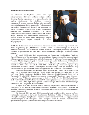 Dr Michał Adam Dobrowolski Jest adiunktem na Wydziale Chemii UW. Jego zainteresowania i aktywność naukowa wiążą się ściśle z fizyczną chemią organiczną, a w szczególności z jej częścią strukturalną. Ze struktury związków organicznych czerpie tematykę badań, które prowadzi oraz doświadczenie, jakim dysponuje. Podstawowymi narzędziami badawczymi, którymi się posługuje są przede wszystkim rentgenowska analiza strukturalna (również pod wysokimi ciśnieniami i w niskich temperaturach), metody spektroskopowe (NMR w ciele stałym, Raman) oraz modelowanie molekularne w ramach metod ab initio. Przy interpretacji danych fizykochemicznych często korzysta z analiz statystycznych. Dr Michał Dobrowolski studia wyższe na Wydziale Chemii UW rozpoczął w 1999 roku. Pracę magisterską pt. „Strukturalne badania efektu podstawnikowego w 1-arylo-2aminoimidazolinach” pod kierunkiem dr hab. Michała Ksawerego Cyrańskiego wykonał w Pracowni Krystalochemii w 2004 roku. Studia chemiczne ukończył z wynikiem bardzo dobrym. W latach 2003-2004 był przewodniczącym Samorządu Studenckiego Wydziału Chemii Uniwersytetu Warszawskiego. Bezpośrednio po ukończeniu studiów rozpoczął studia doktoranckie pod kierunkiem dr hab. Michała Ksawerego Cyrańskiego (w grupie prof. dr hab. Tadeusza Marka Krygowskiego), w ramach których prowadził badania nad strukturalnymi aspektami cyklicznej delokalizacji p-elektronowej w układach naprężonych. Pracę doktorską obronił w 2010 roku. W latach 2008-2009 pełnił funkcję przewodniczącego Rady Doktorantów Wydziału Chemii Uniwersytetu Warszawskiego oraz był członkiem Rady Doktorantów UW, jak również Komisji Dyscyplinarnej dla Studentów i Doktorantów. Ponadto współorganizował Festiwal Nauki na Wydziale Chemii UW w latach 20032008 i był przedstawicielem Wydziału Chemii na Pikniku Naukowym Radia „Bis” w roku 2007 oraz Pikniku Naukowym Polskiego Radia i Centrum Nauki Kopernik 2008, 2009 w Warszawie. W roku 2011 był organizatorem oraz opiekunem XV Festiwalu Nauki „Przygody z chemią” oraz IV Pikniku Industrialnego w Stalowej Woli. W roku 2013 był opiekunem XVII Festiwalu Nauki na Wydziale Chemii UW oraz współpracował z Uniwersytetu Dzieci. W roku 2009 był beneficjentem Mazowieckiego Stypendium Doktoranckiego, natomiast w 2011 programu „Mobilność Plus”. W lipcu 2011 roku wyjechał na staż naukowy do profesora Andrzeja Katrusiaka na Uniwersytecie im. Adama Mickiewicza w Poznaniu. Prowadził tam badania związków pod wysokim ciśnieniem metodami dyfrakcji promieniowania rentgenowskiego z zastosowaniem komory diamentowej. Od listopada 2011 do maja 2013 roku odbył staż postdoktorski w grupie profesora Mohameda Mezouara w European Synchrotron Radiation Facility w Grenoble. Badania dotyczyły syntetyzy kompleksów elektronodonorowo/akceptorowych z węglowodorami benzenoidowymi i ich analogami, które następnie badał za pomocą promieniowania synchrotronowego oraz spektroskopii Ramana pod wysokim ciśnieniem. Od ukończenia studiów prezentował 21 posterów na konferencjach krajowych i międzynarodowych, wygłosił również 6 komunikatów ustnych. Był także członkiem komitetu organizacyjnego International Conference on Physical Organic Chemistry w 2006 roku oraz VI Warszawskiego Seminarium Doktorantów Chemików Chemsession ’09. Opublikował 17 publikacji w czasopismach o zasięgu międzynarodowym o łącznym IF = 48.6. Prace cytowane są 140 razy, indeks Hirscha h = 7.