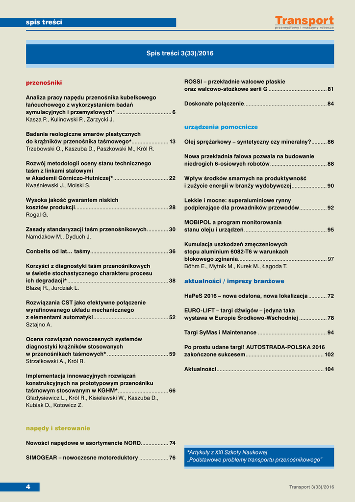 spis treści Spis treści 3(33)/2016 przenośniki Analiza pracy napędu przenośnika kubełkowego łańcuchowego z wykorzystaniem badań symulacyjnych i przemysłowych*..................................... 6 Kasza P., Kulinowski P., Zarzycki J. ROSSI – przekładnie walcowe płaskie oraz walcowo-stożkowe serii G....................................... 81 Doskonałe połączenie....................................................... 84 urządzenia pomocnicze Badania reologiczne smarów plastycznych do krążników przenośnika taśmowego*........................ 13 Trzebowski O., Kaszuba D., Paszkowski M., Król R. Rozwój metodologii oceny stanu technicznego taśm z linkami stalowymi w Akademii Górniczo-Hutniczej*..................................... 22 Kwaśniewski J., Molski S. Wysoka jakość gwarantem niskich kosztów produkcji.............................................................. 28 Rogal G. Zasady standaryzacji taśm przenośnikowych............... 30 Namdakow M., Dyduch J. Conbelts od lat… taśmy................................................... 36 Korzyści z diagnostyki taśm przenośnikowych w świetle stochastycznego charakteru procesu ich degradacji*................................................................... 38 Błażej R., Jurdziak L. Olej sprężarkowy – syntetyczny czy mineralny?........... 86 Nowa przekładnia falowa pozwala na budowanie niedrogich 6-osiowych robotów...................................... 88 Wpływ środków smarnych na produktywność i zużycie energii w branży wydobywczej........................ 90 Lekkie i mocne: superaluminiowe rynny podpierające dla prowadników przewodów................... 92 MOBIPOL a program monitorowania stanu oleju i urządzeń....................................................... 95 Kumulacja uszkodzeń zmęczeniowych stopu aluminium 6082-T6 w warunkach blokowego zginania........................................................... 97 Böhm E., Mytnik M., Kurek M., Łagoda T. aktualności / imprezy branżowe HaPeS 2016 – nowa odsłona, nowa lokalizacja............. 72 Rozwiązania CST jako efektywne połączenie wyrafinowanego układu mechanicznego z elementami automatyki.................................................. 52 Sztajno A. EURO-LIFT – targi dźwigów – jedyna taka wystawa w Europie Środkowo-Wschodniej................... 78 Targi SyMas i Maintenance.............................................. 94 Ocena rozwiązań nowoczesnych systemów diagnostyki krążników stosowanych w przenośnikach taśmowych*......................................... 59 Strzałkowski A., Król R. Po prostu udane targi! AUTOSTRADA-POLSKA 2016 zakończone sukcesem.................................................... 102 Aktualności....................................................................... 104 Implementacja innowacyjnych rozwiązań konstrukcyjnych na prototypowym przenośniku taśmowym stosowanym w KGHM*.................................. 66 Gładysiewicz L., Król R., Kisielewski W., Kaszuba D., Kubiak D., Kotowicz Z. napędy i sterowanie Nowości napędowe w asortymencie NORD.................. 74 SIMOGEAR – nowoczesne motoreduktory.................... 76 4 *Artykuły z XXI Szkoły Naukowej „Podstawowe problemy transportu przenośnikowego” Transport 3(33)/2016