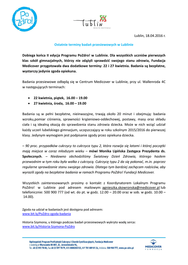 Lublin, 18.04.2016 r. Ostatnie terminy badao przesiewowych w Lublinie Dobiega kooca II edycja Programu PoZdro! w Lublinie. Dla wszystkich uczniów pierwszych klas szkół gimnazjalnych, którzy nie zdążyli sprawdzid swojego stanu zdrowia, Fundacja Medicover przygotowała dwa dodatkowe terminy: 22 i 27 kwietnia. Badania są bezpłatne, wystarczy jedynie zgoda opiekuna. Badania przesiewowe odbędą się w Centrum Medicover w Lublinie, przy ul. Wallenroda 4C w następujących terminach: 22 kwietnia, piątek, 16.00 – 19.00 27 kwietnia, środa, 16.00 – 19.00 Badania są w pełni bezpłatne, nieinwazyjne, trwają około 20 minut i obejmują: badania wzroku,pomiar ciśnienia, sprawności krążeniowo-oddechowej, postawy, masy oraz składu ciała i są idealną okazją do sprawdzenia stanu zdrowia dziecka. Może w nich wziąd udział każdy uczeo lubelskiego gimnazjum, uczęszczający w roku szkolnym 2015/2016 do pierwszej klasy. Jedynym wymogiem jest podpisanie zgody przez opiekuna dziecka. – 90 proc. przypadków cukrzycy to cukrzyca typu 2, która rozwija się latami i której początki mają miejsce w coraz młodszym wieku – mówi Monika Lipioska Zastępca Prezydenta ds. Społecznych. – Niedawno obchodziliśmy Światowy Dzieo Zdrowia, którego hasłem przewodnim w tym roku była walka z cukrzycą. Cukrzycę typu 2 da się pokonad, m.in. poprzez regularne sprawdzanie stanu swojego zdrowia. Dlatego tym bardziej zachęcam rodziców, aby wyrazili zgody na bezpłatne badania w ramach Programu PoZdro! Fundacji Medicover. Wszystkich zainteresowanych prosimy o kontakt z Koordynatorem Lokalnym Programu PoZdro! w Lublinie pod adresem mailowym: [email protected] lub telefonicznie: 500 900 777 (od wt. do pt. w godz. 12.00 – 20.00 oraz w sob. w godz. 10.00 – 14.00). Zgoda na udział w badaniach jest dostępna pod adresem: www.bit.ly/PoZdro-zgoda-badania Historia Szymona, u którego podczas badao przesiewowych wykryto wadę serca: www.bit.ly/Historia-Szymona-PoZdro Więcej informacji: www.po-zdro.pl www.facebook.com/ProgramPoZdro/ www.um.lublin.eu O Programie PoZdro! Celem Programu „PoZdro!” jest doprowadzenie do poprawy stanu zdrowia uczniów pierwszych klas szkół gimnazjalnych poprzez zmniejszenie ryzyka wystąpienia cukrzycy (zwłaszcza typu 2, do której przyczynia się między innymi niezdrowy styl życia) i innych chorób cywilizacyjnych, np. nadciśnienia tętniczego, czy podwyższonego poziomu cholesterolu oraz podniesienie świadomości zdrowego trybu życia. Fundacja robi to przy pomocy trzech elementów. Pierwszy polega na przeprowadzeniu na terenie szkół dobrowolnych, bezpłatnych i nieinwazyjnych, około 20-minutowych badao przesiewowych: m.in. oceny ostrości widzenia, oceny postawy ciała, sprawności krążeniowo-oddechowej, masy i składu ciała, co poprzedza informacja skierowana do rodziców (np. podczas wywiadówek). Drugim elementem programu jest przeprowadzenie szkoleo w placówkach edukacyjnych, dotyczących kształtowania i realizacji polityki zdrowotnej na terenie szkół poprzez wykłady skierowane do nauczycieli oraz dostarczenie odpowiednich narzędzi służących edukacji zdrowotnej. W ramach trzeciego elementu programu dzieci z czynnikami ryzyka rozwoju chorób cywilizacyjnych oraz ich rodziny obejmowane są dwuletnią opieką indywidualną. Przeprowadzane są także warsztaty edukacyjne dla rodzin objętych tą opieką. W Gdyni, Fundacja Medicover chce przebadad 6 tysięcy uczniów pierwszych klas gimnazjalnych w ciągu trzech lat. Dodatkowo, w ramach Programu dostępne są także Lekcje Multimedialne (40 000 pakietów), które są bezpłatnie udostępniane każdej chętnej placówce oraz, również bezpłatny, Poradnik PoZdro! – kompendium wiedzy na temat zdrowego trybu życia. Poradnik można pobrad ze strony internetowej Programu PoZdro! „PoZdro!” jest jednym z największych programów w Europie, jeżeli chodzi o planowaną ilośd przebadanych dzieci. Organizatorzy chcą przebadad w ciągu pięciu lat 30 tysięcy uczniów pod kątem ryzyka wystąpienia cukrzycy typu 2. Rezultat, jaki organizatorzy chcą osiągnąd po zakooczeniu programu to około półtora tysiąca osób, które wyjdą z grupy ryzyka zachorowania. Program Pozdro! realizowany jest w Gdyni, Warszawie, Lublinie oraz Wrocławiu. Fundacja Medicover realizuje program „PoZdro!” z własnych środków, pochodzących z grantu uzyskanego od założycieli i właścicieli firmy Medicover – Fundacji Szwedzkiej Rodziny Jochnick’ów o nazwie J&CafJochnick Foundation. Program powstał w oparciu o najlepsze krajowe i międzynarodowe wzorce, które uwzględniają skuteczne narzędzia zdrowia publicznego stosowane w promocji zdrowia i w tzw. medycynie behawioralnej. O Fundacji Medicover Fundacja Medicover została powołana przez Grupę Medicover w 2007 roku. Głównymi zadaniami Fundacji są: szerzenie wiedzy na temat zdrowego i bezpiecznego trybu życia, propagowanie profilaktyki oraz prawidłowej diagnostyki oraz kształtowanie społecznej świadomości dotyczącej konieczności świadczenia profesjonalnych usług medycznych. W oparciu o wiedzę i doświadczenie z zakresu medycyny działalnośd Fundacji Medicover koncentruje się na edukowaniu, wspieraniu społeczności lokalnych oraz tworzeniu programów, które w sposób pośredni lub bezpośredni przyczyniają się do polepszenia stanu zdrowia i świadomości społeczeostwa. Poza organizacją Ogólnopolskiego Programu Profilaktyki Cukrzycy i Chorób Cywilizacyjnych PoZdro!, Fundacja wspiera także m.in. Interwencyjny Ośrodek Preadopcyjny w Otwocku oraz ośrodek „Ufnośd” w Częstochowie. W ramach wolontariatu pracowniczego prowadzone są projekty takie jak m.in.: Medicover Runners, czy rajd rowerowy „Razem przeciwko cukrzycy typu 2”. Fundacja Medicover wydaje dwumiesięcznik pod nazwą MedMagazyn. O Grupie Medicover Firma Medicover jest liderem na rynku prywatnej opieki medycznej w Europie Środkowo-Wschodniej. Została za