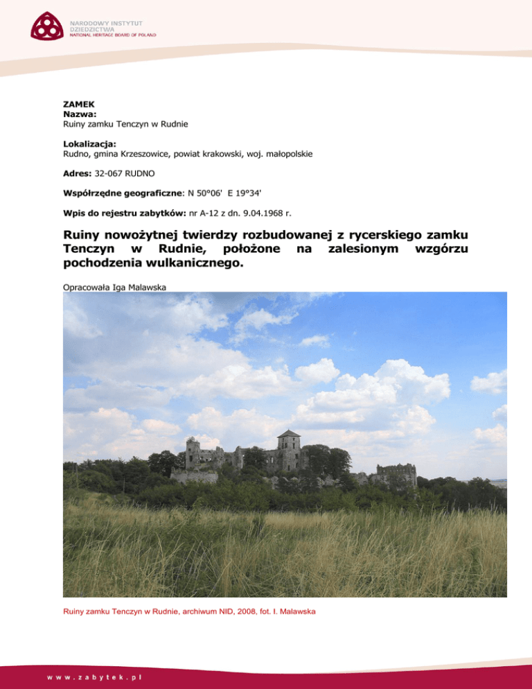 ZAMEK Nazwa: Ruiny zamku Tenczyn w Rudnie Lokalizacja: Rudno, gmina Krzeszowice, powiat krakowski, woj. małopolskie Adres: 32-067 RUDNO Współrzędne geograficzne: N 50°06' E 19°34' Wpis do rejestru zabytków: nr A-12 z dn. 9.04.1968 r. Ruiny nowożytnej twierdzy rozbudowanej z rycerskiego zamku Tenczyn w Rudnie, położone na zalesionym wzgórzu pochodzenia wulkanicznego. Opracowała Iga Malawska Ruiny zamku Tenczyn w Rudnie, archiwum NID, 2008, fot. I. Malawska Początki zamku nie zostały, jak dotąd, jednoznacznie zinterpretowane. Pierwsza wzmianka źródłowa na temat wsi Tenczyn pochodzi z 1314 roku. Budowę pierwotnego założenia obronnego przypisuje się Nawojowi z Morawicy (zm. 1331 r.) lub jego synowi Andrzejowi (zm. 1369 r.). W 1319 roku Jan Nawój herbu Topór, wojewoda sandomierski (1317-1320) i kasztelan krakowski (1320-1331) przeniósł siedzibę rodu z Morawicy do Rudna. Dokumenty źródłowe podają, że w 1319 roku rozpoczęto karczowanie lasu prawdopodobnie pod przyszłą wieś lub gród. Syn Nawoja – Andrzej, pełniąc wiele ważnych urzędów: kasztelana wiślickiego (1340-1347), podkomorzego krakowskiego (1347 -13630) i następnie wojewody krakowskiego (1363-1368), kontynuował dzieło ojca. Pierwszy zamek wzniesiono w najwyższej części wzgórza wulkanicznego, w części północnowschodniej. Było to prawdopodobnie drewniane jeszcze założenie z cylindryczną kamienną wieżą, zwaną Dorotą. Andrzej, jako pierwszy, przyjął nazwisko Tęczyński. Syn Andrzeja – Jan (zm. 1405 r.) pełnił ważne urzędy państwowe. Był kasztelanem i starostą krakowskim, kasztelanem wojnickim a także bliskim doradcą króla Władysława Jagiełły. W testamencie Jana z roku 1402 pojawia się pierwsza wzmianka o zamku, a w dwa lata później, w innym dokumencie, informacja o kaplicy zamkowej. Rozbudowywany zamek w średniowieczu był otoczony murem od strony północnej. Jest prawdopodobne, że posiadał pełny obwód murów dostosowany do konfiguracji terenu. Miał on, typowy dla rycerskich zamków na wzgórzach kształt nieregularnego owalu. Wieża zwana Dorotą znajdowała się w jego południowo-wschodniej części. Przyjmuje się, że od strony północno zachodniej mur flankowany był kwadratową wieżą zwaną Nawojową. Nieregularne skrzydła mieszkalne były dostawione do muru obwodowego od strony północnej i wschodniej. W XV wieku od strony południowej dobudowano do skrzydła mieszkalnego stosunkowo duży (dwutraktowy i prawdopodobnie trzykondygnacyjny) budynek na rzucie prostokąta. Powstała też wieża południowa (uznawana za więzienną) oraz nowa wieża północno-zachodnia. Oddzielono zamek górny od dolnego. W obrębie zamku górnego w źródłach pisanych wzmiankowana jest kaplica. Trudno jednak wskazać jej pierwotne umiejscowienie. Nie można również, na obecnym etapie wiedzy, określić położenia wjazdu. W XV i XVI wieku ród Tęczyńskich doszedł do dużego majątku i statusu społecznego. Zamek więc, w połowie XVI wieku musiał przejść zmiany, tak aby rodowa siedziba dostosowana była zarówno do pozycji jak i nowych trendów stylistycznych. Jan Tęczyński (zm. 1593 r.), kasztelan wojnicki i podkomorzy koronny, gotycki zamek przekształcił w renesansową rezydencję. Uporządkowano gabaryty poszczególnych skrzydeł mieszkalnych tworząc trójskrzydłowy pałac wyposażony w arkadowe krużganki i nowe elewacje. Na dziedzińcu zamku górnego powstała prawdopodobnie studnia. Na zamku dolnym rozbudowano funkcje gospodarcze. Powstały nowe stajnie, kuchnia, piekarnia, łaźnia, browar. Na zamku przebywały ważne osobistości polskiego odrodzenia. Po roku 1610 ostatni z rodu Tęczyńskich, Jan Magnus (wojewoda krakowski, starosta płocki), przebudował renesansową rezydencję w nowożytną twierdzę. Odcinek południowy i wschodni murów wyposażono w dwie pięciokątne basteje (lub – jak sądzi część badaczy w bastiony z kazamatami w typie włoskim). Nowoczesne umocnienia zewnętrzne dostosowano do broni artyleryjskiej. Od północy wzniesiono lub przebudowano basteję wjazdową (barbakan) z tak charakterystyczną dla Tenczyna szyją bramną. Była to długa galeria strzelnicza ubezpieczającą wjazd do zamku, ze strzelnicami skierowanymi na dziedziniec zamku dolnego. Gruntownie przebudowano też kaplicę zamkową Wokół zamku, w tym etapie przebudowy, rozciągały się tereny zielone: od północy ogród, a od południa i zachodu winnice. W rękach rodu Tęczyńskich rezydencja pozostała aż do 1637 roku to jest do śmierci ostatniego z rodu Tęczyńskich, Jana Magnusa zamek odziedziczyła jego jedyna córka Izabela Tęczyńska. Wychodząc za mąż za Łukasza Opalińskiego herbu Łodzia wniosła zamek wraz z ogromnym majątkiem ziemskim w wianie rodzinie Opalińskich. Od tego czasu zamek przestał być siedzibą główną. Odtąd zasiadał tu burgrabia administrujący dobrami. W 1656 roku został zajęty przez Szwedów, a następnie spalony. Jeszcze w końcu XVII wieku, ówcześni właściciele zamku – Lubomirscy- w znacznej części zamek odbudowali. Na początku XVIII wieku dobra tęczyńskie jako wiano Elżbiety z Lubomirskich przeszły w ręce Adama Mikołaja Sieniawskiego, hetmana wielkiego koronnego i kasztelana krakowskiego czyli pierwszego senatora Reczypospolitej. W roku 1731 ich córka Zofia, wdowa po Dönhoffie, wyszła za mąż za Augusta Czartoryskiego i wniosła Tenczyn wraz z ogromnym majątkiem w ręce Czartoryskich. August Czartoryski, twórca rodowej potęgi Familii Czartoryskich, w roku 1763 wydał swoją córkę Elżbietę za mąż za Stanisława Lubomirskiego. Wraz z nią zamek Tenczyn przeszedł do rodu Lubomirskich. W 1768 roku na wpół opuszczony zamek strawił wielki pożar spowodowany uderzeniem pioruna. W następnych latach zamek całkowicie opustoszał. Zamknięto też kaplicę zamkową, przenosząc z niej uprzednio prochy Tęczyńskich do kaplicy grobowej w kościele w Tenczynku. Od 1816 ro