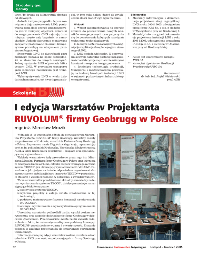 Skroplony gaz ziemny towe. Te drugie są kilkakrotnie droższe od stalowych. Jednak i w tym przypadku lepsze rozwiązanie daje zastosowanie LNG, ponieważ ta sama ilość energii zmagazynowana jest w mniejszej objętości. Zbiorniki do magazynowania CNG zajmują dużo miejsca, często cały bagażnik w samochodzie. Jedynie fabrycznie montowane specjalnie profilowane zbiorniki kompozytowe pozwalają na utrzymanie przestrzeni bagażowej. Stosowanie LNG do dystrybucji gazu ziemnego pozwala na spore oszczędności w stosunku do innych rozwiązań. Jednej cysternie LNG odpowiada kilka cystern CNG. W przypadku transportu gazu ziemnego najtańszym jest transport LNG. Wykorzystywanie LNG w wielu dziedzinach przemysłu jest kwestią przyszło- ści, w tym celu należy dążyć do zwiększenia ilości źródeł tego typu medium. Wnioski 1. Wzrost zapotrzebowania na energię zmusza do poszukiwania nowych nośników energetycznych oraz przyczynia się do powstawania kolejnych rozwiązań techniczno-technologicznych. 2. Jednym z ostatnio rozwijanych osiągnięć jest aplikacja skroplonego gazu ziemnego (LNG). 3. LNG posiada wiele zalet. W porównaniu ze swoją naturalną postacią (faza gazowa) charakteryzuje się znacznie niższymi kosztami transportu i magazynowania. 4. Istniejąca technologia produkcji, transportu i magazynowania pozwalają na budowę lokalnych instalacji LNG w rejonach pozbawionych infrastruktury energetycznej. Bibliografia: 1. Materiały informacyjne i dokumentacja projektowa stacji regazyfikacji LNG z roku 2004 i 2005, udostępnione przez firmę KRI Sp. z o.o. z siedzibą w Wysogotowie przy ul. Serdecznej 8. 2. Materiały informacyjne i dokumentacja projektowa instalacji LNG z roku 2005 i 2006, udostępnione przez firmę PGS Sp. z o.o. z siedzibą w Odolanowie przy ul. Krotoszyńskiej. * Autor jest wiceprezesem zarządu PBG SA ** Autor jest dyrektorem Realizacji Przedsięwzięć PBG SA Recenzował: dr hab. inż. Rafał Wiśniowski, prof. AGH NBI N NB BII B Szkolenie I edycja Warsztatów Projektanta RUVOLUM® firmy Geobrugg w Polsce mgr inż. Mirosław Mrozik W dniach 13–15 września br. odbyła się pierwsza edycja Warsztatów Projektanta RUVOLUM® firmy Geobrugg. Warsztaty zostały zorganizowane w Krakowie, w siedzibie Partnera firmy Geobrugg w Polsce. Zaproszono na nie 63 gości z całego kraju, reprezentujących m.in. politechniki: Krakowską, Wrocławską i Świętokrzyską, AGH, a także liczne biura projektowe – drogowe oraz specjalizujące się w geotechnice. Wykłady warsztatowe były prowadzone przez mgr inż. Mirosława Mrozika, Partnera firmy Geobrugg w Polsce oraz inżyniera ze Szwajcarii Daniela Fluma, członka zespołu tworzącego zarówno system TECCO®, jak i koncepcję wymiarowania RUVOLUM®. Pozwala ona, jako jedyna na świecie, odpowiednio zwymiarować elastyczny system stabilizacji skarp i nasypów TECCO® w postaci siatki stalowej o wysokiej nośności w połączeniu z gwoździowaniem. W czasie warsztatów przedstawiono aktualny stan wiedzy na temat wymiarowania systemu TECCO®, dzieląc prezentacje na następujące bloki tematyczne: ❑ ogólny opis systemu TECCO®, ❑ wybrane projekty z całego świata zrealizowane w tej technologii, ❑ podstawy matematyczno-fizyczne koncepcji wymiarowania RUVOLUM®, ❑ obsługa i wymiarowanie z wykorzystaniem oprogramowania RUVOLUM®. Uczestnicy warsztatów podkreślali bardzo wysoki poziom merytoryczny oraz szerokie doświadczenie firmy Geobrugg w dziedzinie geotechniki. Przedstawiciele świata nauki wyrazili zadowolenie z faktu, że matematyczno-fizyczne podstawy koncepcji RUVOLUM® przedstawiono w jasny i otwarty sposób. Znacznie podnosi to zaufanie projektantów do omawianego rozwiązania technicznego. Informacje o kolejnej edycji warsztatów zostaną rozesłane wśród członków PKG oraz osób współpracujących z firmą Geobrugg w Polsce. 32 Nowoczesne Budownictwo Inżynieryjne Listopad – Grudzień 2006