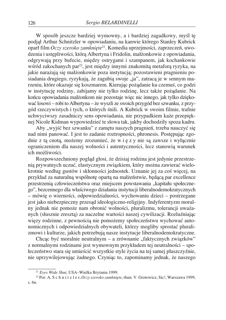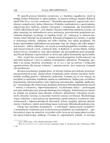 Sergio BELARDINELLI 126 W sposób jeszcze bardziej wymowny, a i bardziej zagadkowy, myśl tę podjął Arthur Schnitzler w opowiadaniu, na kanwie którego Stanley Kubrick oparł film Oczy szeroko zamknięte21. Komedia uprzejmości, zaprzeczeń, uwo− dzenia i ustępliwości, którą Albertyna i Fridolin, małżonkowie z opowiadania, odgrywają przy bufecie, między ostrygami i szampanem, jak kochankowie wśród zakochanych par22, jest między innymi znakomitą metaforą ryzyka, na jakie narażają się małżonkowie poza instytucją; pozostawieni pragnieniu po− siadania drugiego, ryzykują, że zagubią swoje „ja”, zatracą je w sennym ma− rzeniu, które okazuje się koszmarem. Kierując pożądanie ku czemuś, co godzi w instytucję rodziny, zabijamy nie tylko rodzinę, lecz także pożądanie. Na końcu opowiadania małżonkom nie pozostaje więc nic innego, jak tylko dzięko− wać losowi – robi to Albertyna – że wyszli ze swoich przygód bez szwanku, z przy− gód rzeczywistych i tych, o których śnili. A Kubrick w swoim filmie, trafnie uchwyciwszy zasadniczy sens opowiadania, nie przypadkiem każe przepięk− nej Nicole Kidman wypowiedzieć te słowa tak, jakby dochodziły spoza kadru. Aby „wyjść bez szwanku” z zamętu naszych pragnień, trzeba nauczyć się nad nimi panować. I jest to zadanie roztropności, phronesis. Postępując zgo− dnie z tą cnotą, możemy zrozumieć, że w i ę z y nie są zawsze i wyłącznie ograniczeniem dla naszej wolności i autentyczności, lecz stanowią warunek ich możliwości. Rozpowszechniony pogląd głosi, że dzisiaj rodzina jest jedynie przestrze− nią prywatnych uczuć, elastycznym związkiem, który można zawierać wielo− krotnie według gustów i skłonności jednostek. Uznanie jej za coś więcej, na przykład za naturalną wspólnotę opartą na małżeństwie, będącą par excellence przestrzenią człowieczeństwa oraz miejscem powstawania „kapitału społeczne− go”, bezcennego dla właściwego działania instytucji liberalnodemokratycznych – mówię o wierności, odpowiedzialności, wychowaniu dzieci – postrzegane jest jako niebezpieczny przesąd ideologiczno−religijny. Indyferentyzm moral− ny jednak nie pomoże nam obronić wolności, pluralizmu, tolerancji uważa− nych (słusznie zresztą) za naczelne wartości naszej cywilizacji. Rozluźniając więzy rodzinne, z pewnością nie pomożemy społeczeństwu wychować auto− nomicznych i odpowiedzialnych obywateli, którzy mogliby sprostać plurali− zmowi i kulturze, jakich potrzebują nasze instytucje liberalnodemokratyczne. Chcąc być moralnie neutralnym – a zrównanie „faktycznych związków” z normalnymi rodzinami jest wymownym przykładem tej neutralności – spo− łeczeństwo stara się umieścić wszystkie style życia na tej samej płaszczyźnie, nie uprzywilejowując żadnego. Czyniąc to, zapominamy jednak, że naszego 21 22 s. 6n. Eyes Wide Shut, USA–Wielka Brytania 1999. Por. A. S c h n i t z l e r, Oczy szeroko zamknięte, tłum. V. Grotowicz, Sic!, Warszawa 1999, Cnota roztropności w życiu rodzinnym 127 pluralizmu nie da się faktycznie pogodzić ze wszystkimi stylami życia oraz że można go utrzymać tylko pod warunkiem popierania stylu życia inspirowane− go autonomią, odpowiedzialnością, wiernością, szacunkiem dla innych, goto− wością poniesienia ofiary dla dobra innych i podobnymi cnotami, bez których nie ma społeczeństwa obywatelskiego godnego swej nazwy. A ponieważ sądzę, że ze względu na wytwarzanie owego „kapitału spo− łecznego”, owych „dóbr relacyjnych”, jak nazywa je Donati, rodzina będzie nadal spełniała kluczową funkcję w społeczeństwie, lecz że funkcja ta nie bę− dzie spełniana w ten sam sposób przez każdy typ rodziny, chciałbym zakoń− czyć dość oczywistymi rozważaniami, które podyktowane zostały – jak mam nadzieję – przez phronesis. Jeśli jest prawdą, że osoba ludzka powinna być ośrodkiem i sercem każdego społeczeństwa, jeśli jest również prawdą, że realizujemy naszą naturę rodzinną23, czyli że stajemy się tym, kim jesteśmy, dzięki naszej wolności i odpowiedzial− ności, nie powinno nikogo gorszyć, że są osoby, które z najróżniejszych po− wodów decydują się żyć razem, nie wstępując w związki cywilne ani religijne i nie żądając, aby ich relacja została prawnie uznana za równą rodzinie opartej na małżeństwie. Powiedziałbym nawet, że mogłoby to być przyjmowane jako znak liberalności naszego społeczeństwa i instytucji. Lepiej ponieść porażkę w poszukiwaniu swojego prawdziwego dobra, niż myśleć, że ktoś mógłby je narzucić siłą. Lepszy jest dokonujący się na naszych oczach rozpad rodziny niż państwo, które ścigałoby jako przestępstwo współżycie more uxorio. Sprzeci− wiam się jednak niechęci, by nie powiedzieć wrogości, z jaką w powszechnej opinii spotyka się „tradycyjna rodzina”, jakby była instytucją bezpowrotnie przezwyciężoną, przyjmującą – pod presją indywidualizacji – hipotetyczne i przy− godne postaci „faktycznych związków”. Nie tylko bowiem, jak pisze Donati, „rodzina pozostaje «całościowym faktem społecznym», to znaczy nie przestaje angażować wszystkich poziomów egzystencji (biologicznego, psychologicz− nego, społecznego, ekonomicznego, prawnego, symbolicznego) również wtedy, gdy jednostki coraz bardziej się indywidualizują”24, zawsze stanowiąc „pod− stawową instytucję”25 społeczeństwa, lecz – i w naszym kontekście jest to jeszcze ważniejsze – wyłącznie zdrowa rodzina pozwala społeczeństwu odtwarzać podstawowe założenia jego liberalności, a zatem umożliwia również pozy− tywną indywidualizację. 23 Zob. S. B e l a r d i n e l l i, Laicità e famiglia, w: Laicità: la ricerca dell’universale nelle differenze, red. P. Donati, Il Mulino, Bologna 2008, s. 205−225. 24 Por. 