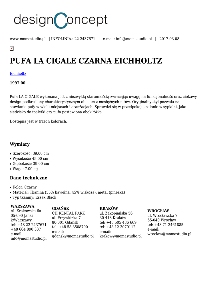 www.momastudio.pl | INFOLINIA.: 22 2437671 | e-mail: [email protected] | 2017-03-08 PUFA LA CIGALE CZARNA EICHHOLTZ Eichholtz 1997.00 Pufa LA CIGALE wykonana jest z niezwykłą starannością zwracając uwagę na funkcjonalność oraz ciekawy design podkreślony charakterystycznym obiciem z mosiężnych nitów. Oryginalny styl pozwala na stawianie pufy w wielu miejscach i aranżacjach. Sprawdzi się w przedpokoju, salonie w sypialni, jako siedzisko do toaletki czy pufa postawiona obok łóżka. Dostępna jest w trzech kolorach. Wymiary ● ● ● ● Szerokość: 39.00 cm Wysokość: 45.00 cm Głębokość: 39.00 cm Waga: 7.00 kg Dane techniczne ● ● ● Kolor: Czarny Materiał: Tkanina (55% bawełna, 45% wiskoza), metal (pinezka) Typ tkaniny: Essex Black WARSZAWA Al. Krakowska 6a 05-090 Janki k/Warszawy tel: +48 22 2437671 +48 664 890 337 e-mail: [email protected] GDAŃSK CH RENTAL PARK ul. Przywidzka 7 80-001 Gdańsk tel: +48 58 3508790 e-mail: [email protected] KRAKÓW ul. Zakopiańska 56 30-418 Kraków tel: +48 505 436 669 tel: +48 12 3070112 e-mail: [email protected] WROCŁAW ul. Wrocławska 7 55-040 Wrocław tel: +48 71 3461885 e-mail: [email protected]