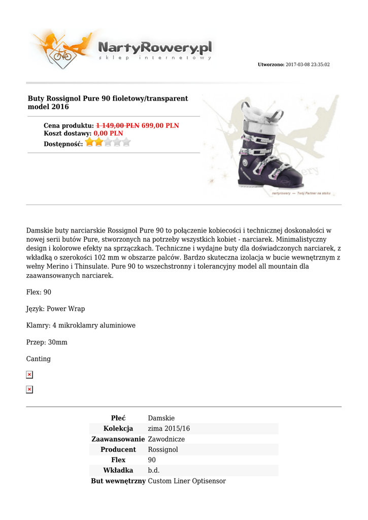Utworzono: 2017-03-08 23:35:02 Buty Rossignol Pure 90 fioletowy/transparent model 2016 Cena produktu: 1 149,00 PLN 699,00 PLN Koszt dostawy: 0,00 PLN Dostępność: Damskie buty narciarskie Rossignol Pure 90 to połączenie kobiecości i technicznej doskonałości w nowej serii butów Pure, stworzonych na potrzeby wszystkich kobiet - narciarek. Minimalistyczny design i kolorowe efekty na sprzączkach. Techniczne i wydajne buty dla doświadczonych narciarek, z wkładką o szerokości 102 mm w obszarze palców. Bardzo skuteczna izolacja w bucie wewnętrznym z wełny Merino i Thinsulate. Pure 90 to wszechstronny i tolerancyjny model all mountain dla zaawansowanych narciarek. Flex: 90 Język: Power Wrap Klamry: 4 mikroklamry aluminiowe Przep: 30mm Canting Płeć Kolekcja Damskie zima 2015/16 Zaawansowanie Zawodnicze Producent Rossignol Flex 90 Wkładka b.d. But wewnętrzny Custom Liner Optisensor Klamry 4 MICRO - 100% ALUMINIUM Kolory Biały Rozmiary 24, 24.5, 25, 25.5 Adres: http://nartyrowery.pl/ Telefon: 34 365 66 09 Email: [email protected] Gadu-Gadu: Skype:
