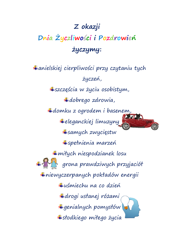 Z okazji Dnia Życzliwości i Pozdrowień życzymy: anielskiej cierpliwości przy czytaniu tych życzeń, szczęścia w życiu osobistym, dobrego zdrowia, domku z ogrodem i basenem, eleganckiej limuzyny samych zwycięstw spełnienia marzeń miłych niespodzianek losu grona prawdziwych przyjaciół niewyczerpanych pokładów energii uśmiechu na co dzień drogi usłanej różami genialnych pomysłów słodkiego miłego życia świeżości spojrzenia głównej wygranej na loterii pozytywnej aury pogody ducha pomyślnych wiatrów gorącej miłości wygodnych butów cudownych wakacji szczęścia punktualnych autobusów świętego spokoju żadnych trosk rześkich poranków pomyślności trafnych decyzji intuicji w interesach prezentów od losu dużego łóżka pękatego portfela szerokiej drogi jasności umysłu niebanalnych wyzwań miłych snów pewności siebie wielkiej fortuny wielu uśmiechów błyskotliwych ripost romantycznych wieczorów szansy na sukces dużo słodyczy pozycji lidera szampańskiej zabawy mocnego dachu nad głową samych pozytywnych wibracji pełni życia wielu niezapomnianych chwil dużo słońca olimpijskiej kondycji jak najmniej zmartwień wyjścia z każdej sytuacji pasma sukcesów niezmiennie zielonego światła czystego nieba stu lat życia końskiego zdrowia sławy pokaźnego konta manny z nieba wysokich wygranych ciągle nowych rekordów serca jak dzwon pewnej ręki komfortowych warunków przyjemnych doznań wielu wzruszeń otrzymywania najwyższych odznaczeń powodzenia osiągnięcia wyznaczonych celów pełnego sejfu szczęścia w kartach sprzyjającej pogody kolorowych chwil twórczego podejścia do pracy mnóstwa prezentów góry pieniędzy udanych negocjacji serdecznych przyjaciół miejsca w księdze rekordów Guinnessa wesołego towarzystwa dobrego apetytu złotej jesieni poczucia humoru wiecznej młodości niewieszającego się komputera sławy i chwały lekkości bytu pokojowego rozwiązywania wszystkich konfliktów korzystnego układu gwiazd czytelnych instrukcji mistrzowskich zagrań dobrej nocy wielkiej przygody słodkich snów zgranej ekipy bujnej wyobraźni interesujących przeżyć rodzinnej atmosfery pomyślnych wieści radości życia dobrego serca suto zastawionego stołu złotej rybki zasięgu w każdym miejscu gry fair play nieomylnych decyzji miejsca w historii kreatywności podroży dookoła świata dużo wolnego czasu beztroskiego życia dobrej passy celnych strzałów zdobycia Montt Everestu wolności trafnych wyborów gradu prestiżowych nagród spokoju ducha oddechu od codzienności samych piątek godnych przeciwników szczerych komplementów wszelkiej pomyślności codziennych atrakcji świetlanej przyszłości korzystnego horoskopu zdjęcia na okładce miłych sąsiadów wiary w sukces wielu alternatyw tolerancji własnego odrzutowca gorączki sobotniej nocy silnej woli ambitnych planów kilku odkryć i kilku wynalazków owacji na stojąco zniewalającego uśmiechu szczęśliwego trafu pomocnej dłoni niezawodnej pamięci nieprzemijającej urody asa w rękawie nadzienia w pączku recepty na szczęście odwagi ptasiego mleczka przygód z happy endem dużo rodzynek w cieście gwiazdki z nieba wiernego psiaka celnego oka różowych okularów siły perswazji zdolności nadprzyrodzonych ostatniego słowa dobrego smaku własnego sposobu na życie w zdrowym ciele zdrowego ducha właściwych wniosków podzielnej uwagi czterolistnej kończyny aby wszystkie dobre dni w żółwim tempie upływały, a te złe szybko odchodziły w niepamięć żeby każdy następny dzień był niesamowity i wyjątkowy abyście zawsze byli uśmiechnięci i pełni życzliwości dla wszystkich aby nieosiągalne cele stały się zdobyczami codzienności cudownych uczuć, które zawsze trafiają w odpowiednie miejsce i do odpowiednich ludzi