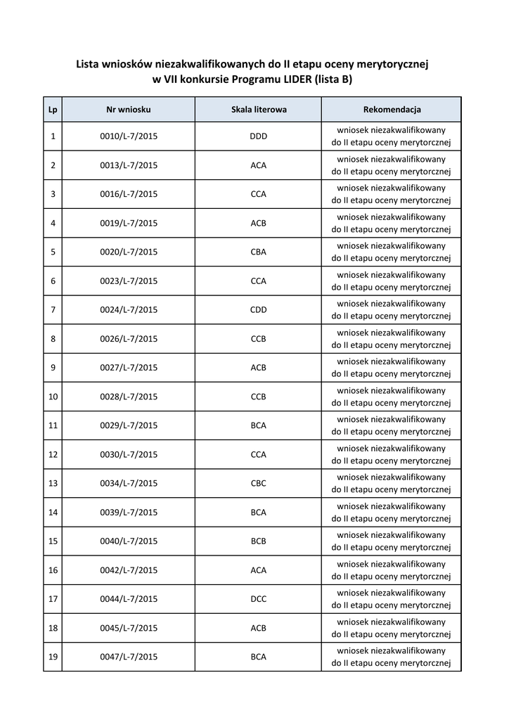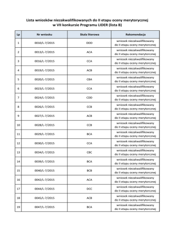 Lista wniosków niezakwalifikowanych do II etapu oceny merytorycznej w VII konkursie Programu LIDER (lista B) Lp Nr wniosku Skala literowa Rekomendacja 1 0010/L-7/2015 DDD wniosek niezakwalifikowany do II etapu oceny merytorcznej 2 0013/L-7/2015 ACA wniosek niezakwalifikowany do II etapu oceny merytorcznej 3 0016/L-7/2015 CCA wniosek niezakwalifikowany do II etapu oceny merytorcznej 4 0019/L-7/2015 ACB wniosek niezakwalifikowany do II etapu oceny merytorcznej 5 0020/L-7/2015 CBA wniosek niezakwalifikowany do II etapu oceny merytorcznej 6 0023/L-7/2015 CCA wniosek niezakwalifikowany do II etapu oceny merytorcznej 7 0024/L-7/2015 CDD wniosek niezakwalifikowany do II etapu oceny merytorcznej 8 0026/L-7/2015 CCB wniosek niezakwalifikowany do II etapu oceny merytorcznej 9 0027/L-7/2015 ACB wniosek niezakwalifikowany do II etapu oceny merytorcznej 10 0028/L-7/2015 CCB wniosek niezakwalifikowany do II etapu oceny merytorcznej 11 0029/L-7/2015 BCA wniosek niezakwalifikowany do II etapu oceny merytorcznej 12 0030/L-7/2015 CCA wniosek niezakwalifikowany do II etapu oceny merytorcznej 13 0034/L-7/2015 CBC wniosek niezakwalifikowany do II etapu oceny merytorcznej 14 0039/L-7/2015 BCA wniosek niezakwalifikowany do II etapu oceny merytorcznej 15 0040/L-7/2015 BCB wniosek niezakwalifikowany do II etapu oceny merytorcznej 16 0042/L-7/2015 ACA wniosek niezakwalifikowany do II etapu oceny merytorcznej 17 0044/L-7/2015 DCC wniosek niezakwalifikowany do II etapu oceny merytorcznej 18 0045/L-7/2015 ACB wniosek niezakwalifikowany do II etapu oceny merytorcznej 19 0047/L-7/2015 BCA wniosek niezakwalifikowany do II etapu oceny merytorcznej 20 0051/L-7/2015 BCB wniosek niezakwalifikowany do II etapu oceny merytorcznej 21 0052/L-7/2015 BCB wniosek niezakwalifikowany do II etapu oceny merytorcznej 22 0058/L-7/2015 CBB wniosek niezakwalifikowany do II etapu oceny merytorcznej 23 0061/L-7/2015 CCB wniosek niezakwalifikowany do II etapu oceny merytorcznej 24 0062/L-7/2015 ADA wniosek niezakwalifikowany do II etapu oceny merytorcznej 25 0065/L-7/2015 BCB wniosek niezakwalifikowany do II etapu oceny merytorcznej 26 0068/L-7/2015 CCA wniosek niezakwalifikowany do II etapu oceny merytorcznej 27 0072/L-7/2015 BCA wniosek niezakwalifikowany do II etapu oceny merytorcznej 28 0073/L-7/2015 CCC wniosek niezakwalifikowany do II etapu oceny merytorcznej 29 0077/L-7/2015 BCB wniosek niezakwalifikowany do II etapu oceny merytorcznej 30 0079/L-7/2015 CDB wniosek niezakwalifikowany do II etapu oceny merytorcznej 31 0080/L-7/2015 CCA wniosek niezakwalifikowany do II etapu oceny merytorcznej 32 0081/L-7/2015 CCB wniosek niezakwalifikowany do II etapu oceny merytorcznej 33 0083/L-7/2015 BCC wniosek niezakwalifikowany do II etapu oceny merytorcznej 34 0084/L-7/2015 BCA wniosek niezakwalifikowany do II etapu oceny merytorcznej 35 0087/L-7/2015 CCA wniosek niezakwalifikowany do II etapu oceny merytorcznej 36 0089/L-7/2015 CCA wniosek niezakwalifikowany do II etapu oceny merytorcznej 37 0093/L-7/2015 DDB wniosek niezakwalifikowany do II etapu oceny merytorcznej 38 0095/L-7/2015 CCB wniosek niezakwalifikowany do II etapu oceny merytorcznej 39 0098/L-7/2015 BCA wniosek niezakwalifikowany do II etapu oceny merytorcznej 40 0101/L-7/2015 CCA wniosek niezakwalifikowany do II etapu oceny merytorcznej 41 0104/L-7/2015 BCA wniosek niezakwalifikowany do II etapu oceny merytorcznej 42 0105/L-7/2015 ACA wniosek niezakwalifikowany do II etapu oceny merytorcznej 43 0111/L-7/2015 ACB wniosek niezakwalifikowany do II etapu oceny merytorcznej 44 0114/L-7/2015 CCB wniosek niezakwalifikowany do II etapu oceny merytorcznej 45 0118/L-7/2015 BBC wniosek niezakwalifikowany do II etapu oceny merytorcznej 46 0122/L-7/2015 ACB wniosek niezakwalifikowany do II etapu oceny merytorcznej 47 0123/L-7/2015 CCA wniosek niezakwalifikowany do II etapu oceny merytorcznej 48 0127/L-7/2015 CDB wniosek niezakwalifikowany do II etapu oceny merytorcznej 49 0128/L-7/2015 BCB wniosek niezakwalifikowany do II etapu oceny merytorcznej 50 0129/L-7/2015 BCB wniosek niezakwalifikowany do II etapu oceny merytorcznej 51 0130/L-7/2015 BCA wniosek niezakwalifikowany do II etapu oceny merytorcznej 52 0133/L-7/2015 ACA wniosek niezakwalifikowany do II etapu oceny merytorcznej 53 0138/L-7/2015 CBA wniosek niezakwalifikowany do II etapu oceny merytorcznej 54 0141/L-7/2015 BCA wniosek niezakwalifikowany do II etapu oceny merytorcznej 55 0146/L-7/2015 CCA wniosek niezakwalifikowany do II etapu oceny merytorcznej 56 0147/L-7/2015 BDB wniosek niezakwalifikowany do II etapu oceny merytorcznej 57 0149/L-7/2015 BDA wniosek niezakwalifikowany do II etapu oceny merytorcznej 58 0150/L-7/2015 CDC wniosek niezakwalifikowany do II etapu oceny merytorcznej 59 0151/L-7/2015 BDA wniosek niezakwalifikowany do II etapu oceny merytorcznej 60 0152/L-7/2015 ACA wniosek niezakwalifikowany do II etapu oceny merytorcznej 61 0157/L-7/2015 DDC wniosek niezakwalifikowany do II etapu oceny merytorcznej 62 0159/L-7/2015 CBA wniosek niezakwalifikowany do II etapu oceny merytorcznej 63 0161/L-7/2015 BCB wniosek niezakwalifikowany do II etapu oceny merytorcznej 64 0162/L-7/2015 CDC wniosek niezakwalifikowany do II etapu oceny merytorcznej 65 0163/L-7/2015 CCA wniosek niezakwalifikowany do II etapu oceny merytorcznej 66 0165/L-7/2015 BCB wniosek niezakwalifikowany do II etapu oceny merytorcznej 67 0167/L-7/2015 CCA wniosek niezakwalifikowany do II etapu oceny merytorcznej 68 0168/L-7/2015 ACA wniosek niezakwalifikowany do II etapu oceny merytorcznej 69 0173/L-7/2015 CCC wniosek niezakwalifikowany do II etapu oceny merytorcznej 70 0176/L-7/2015 ACA wniosek niezakwalifikowany do II etapu oceny merytorcznej 71 0180/L-7/2015 CCA wniosek niezakwalifikowany do II etapu oceny merytorcznej 72 0181/L-7/2015 CCC wniosek niezakwalifikowany do II etapu oceny merytorcznej 73 0182/L-7/2015 BDB wniosek niezakwalifikowany do II etapu oceny merytorcznej 74 0184/L-7/2015 CCC wniosek niezakwalifikowany do II etapu oceny merytorcznej 75 0188/L-7