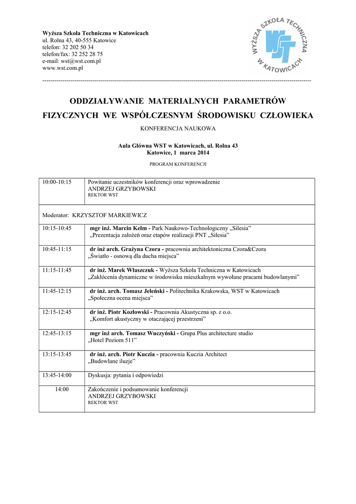 Wyższa Szkoła Techniczna w Katowicach ul. Rolna 43, 40-555 Katowice telefon: 32 202 50 34 telefon/fax: 32 252 28 75 e-mail: [email protected] www.wst.com.pl --------------------------------------------------------------------------------------------------------------------------------------- ODDZIAŁYWANIE MATERIALNYCH PARAMETRÓW FIZYCZNYCH WE WSPÓŁCZESNYM ŚRODOWISKU CZŁOWIEKA KONFERENCJA NAUKOWA Aula Główna WST w Katowicach, ul. Rolna 43 Katowice, 1 marca 2014 PROGRAM KONFERENCJI 10:00-10:15 Powitanie uczestników konferencji oraz wprowadzenie ANDRZEJ GRZYBOWSKI REKTOR WST Moderator: KRZYSZTOF MARKIEWICZ 10:15-10:45 mgr inż. Marcin Kelm - Park Naukowo-Technologiczny „Silesia” „Prezentacja założeń oraz etapów realizacji PNT „Silesia” 10:45-11:15 dr inż arch. Grażyna Czora - pracownia architektoniczna Czora&Czora „Światło - osnową dla ducha miejsca” 11:15-11:45 dr inż. Marek Właszczuk - Wyższa Szkoła Techniczna w Katowicach „Zakłócenia dynamiczne w środowisku mieszkalnym wywołane pracami budowlanymi” 11:45-12:15 dr inż. arch. Tomasz Jeleński - Politechnika Krakowska, WST w Katowicach „Społeczna ocena miejsca” 12:15-12:45 dr inż. Piotr Kozłowski - Pracownia Akustyczna sp. z o.o. „Komfort akustyczny w otaczającej przestrzeni” 12:45-13:15 mgr inż arch. Tomasz Wuczyński - Grupa Plus architecture studio „Hotel Poziom 511” 13:15-13:45 dr inż. arch. Piotr Kuczia - pracownia Kuczia Architect „Budowlane iluzje” 13:45-14:00 Dyskusja: pytania i odpowiedzi 14:00 Zakończenie i podsumowanie konferencji ANDRZEJ GRZYBOWSKI REKTOR WST