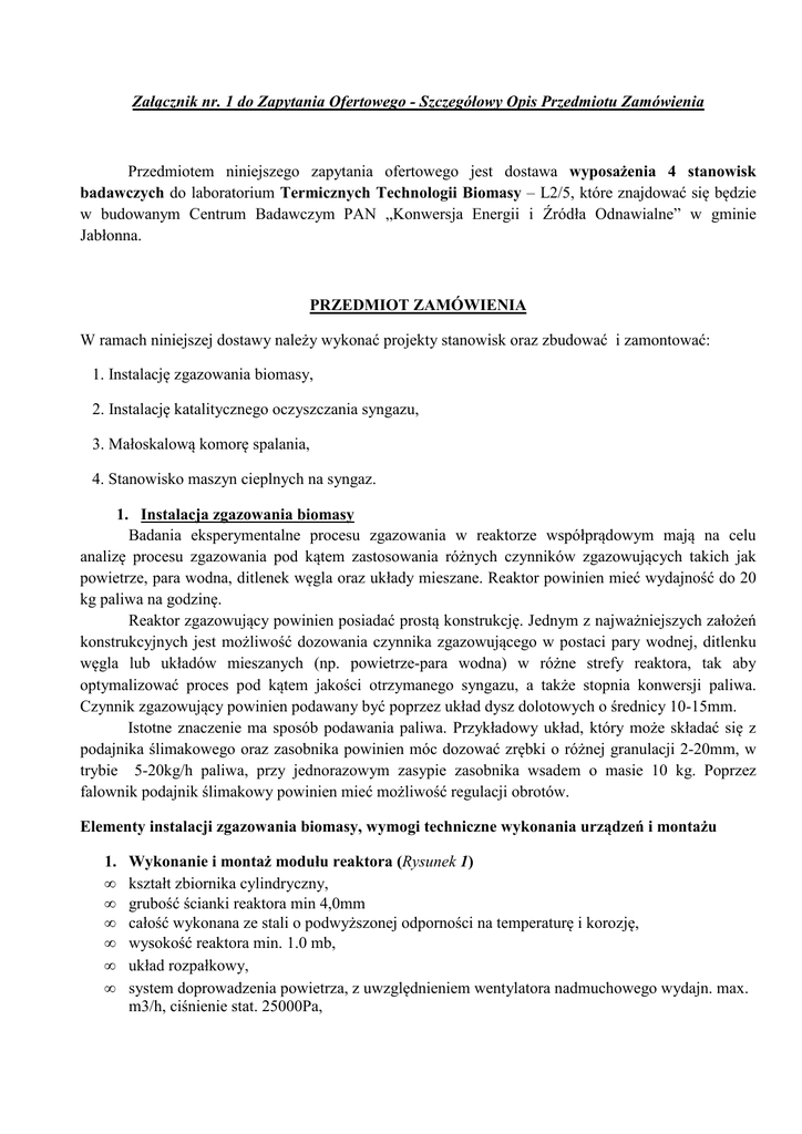 Załącznik nr. 1 do Zapytania Ofertowego - Szczegółowy Opis Przedmiotu Zamówienia Przedmiotem niniejszego zapytania ofertowego jest dostawa wyposażenia 4 stanowisk badawczych do laboratorium Termicznych Technologii Biomasy – L2/5, które znajdować się będzie w budowanym Centrum Badawczym PAN „Konwersja Energii i Źródła Odnawialne” w gminie Jabłonna. PRZEDMIOT ZAMÓWIENIA W ramach niniejszej dostawy należy wykonać projekty stanowisk oraz zbudować i zamontować: 1. Instalację zgazowania biomasy, 2. Instalację katalitycznego oczyszczania syngazu, 3. Małoskalową komorę spalania, 4. Stanowisko maszyn cieplnych na syngaz. 1. Instalacja zgazowania biomasy Badania eksperymentalne procesu zgazowania w reaktorze współprądowym mają na celu analizę procesu zgazowania pod kątem zastosowania różnych czynników zgazowujących takich jak powietrze, para wodna, ditlenek węgla oraz układy mieszane. Reaktor powinien mieć wydajność do 20 kg paliwa na godzinę. Reaktor zgazowujący powinien posiadać prostą konstrukcję. Jednym z najważniejszych założeń konstrukcyjnych jest możliwość dozowania czynnika zgazowującego w postaci pary wodnej, ditlenku węgla lub układów mieszanych (np. powietrze-para wodna) w różne strefy reaktora, tak aby optymalizować proces pod kątem jakości otrzymanego syngazu, a także stopnia konwersji paliwa. Czynnik zgazowujący powinien podawany być poprzez układ dysz dolotowych o średnicy 10-15mm. Istotne znaczenie ma sposób podawania paliwa. Przykładowy układ, który może składać się z podajnika ślimakowego oraz zasobnika powinien móc dozować zrębki o różnej granulacji 2-20mm, w trybie 5-20kg/h paliwa, przy jednorazowym zasypie zasobnika wsadem o masie 10 kg. Poprzez falownik podajnik ślimakowy powinien mieć możliwość regulacji obrotów. Elementy instalacji zgazowania biomasy, wymogi techniczne wykonania urządzeń i montażu 1. • • • • • • Wykonanie i montaż modułu reaktora (Rysunek 1) kształt zbiornika cylindryczny, grubość ścianki reaktora min 4,0mm całość wykonana ze stali o podwyższonej odporności na temperaturę i korozję, wysokość reaktora min. 1.0 mb, układ rozpałkowy, system doprowadzenia powietrza, z uwzględnieniem wentylatora nadmuchowego wydajn. max. m3/h, ciśnienie stat. 25000Pa, Rysunek 1 Schemat zgazowarki na biomasę małej mocy urzą załadunku paliwa 2. Wykonanie i montażż urządzeń • moduł ciągłego głego zasypu biomasy, ze zbiornikiem max. 5kg 3. Wykonanie i montażż układu kontroli i sterowania • Czujnik termoelektryczny płaszczowy z termoelementem typu S klasy 1 szt. 3, zakończony czony głowicą aluminiową, materiał płaszcza stal żaroodporna pyrosil D, średnica płaszcza D=6mm, spoina pomiarowa odizolowana od osłony, długość długo czujnika L=300, mierzący cy temperaturę temperatur w trzech strefach reaktora • Przepływomierz , oparty na masowym natężeniu nat eniu przepływu, zasilanie 24 VDC, zakres 00 20m/s • Rejestrator,, 16 wejść wej analogowych wych pomiarowych. Powinien on współpracować współpracowa z czujnikami: • • • Pt100, Pt1000, Ni100, termoelementami typu K, N, S, przetwornikami z wyjściem wyj w standardzie pętli prądowej ądowej 4-20mA 4 / 0- 20mA, • Komputer pomiarowy szt1. 2. Instalacja katalitycznego oczyszczania syngazu Instalacja katalitycznego oczyszczania syngazu składa sie z pionowego reaktora wysokotemperaturowego ogrzewanego oporowo, wyposażonego w trzy niezależnie sterowane strefy grzewcze. W reaktorze będą znajdowały się dwa złoża. Pierwsze, znajdujące się na górze, będące obojętnym nośnikiem np. ceramika lub kulki stalowe będzie miało na celu ogrzanie wchodzącego strumienia gazu zawierającego smoły do temperatury wymaganej do zajścia reakcji. Tak ogrzany gaz trafi na podgrzane złoże katalizatora na którym smoły ulegną rozpadowi. Elementy instalacji oczyszczania, wymogi techniczne wykonania urządzeń i montażu 1. • • • • • Wykonanie i montaż modułu reaktora (Rysunek 2) kształt zbiornika cylindryczny, grubość ścianki reaktora min 4,0 mm całość wykonana ze stali o podwyższonej odporności na temperaturę i korozję, zgodnie z podanym rysunkiem wysokość reaktora 1.0 mb, panel sterujący z blatem drewnianym. Rysunek 2 Schemat reaktora do katalitycznego oczyszczania syngazu 2. Wykonanie i montaż układu kontroli i sterowania • grzanie przy pomocy 12 grzałek patronowych o długości 100 mm, średnicy 12,5 mm i mocy 1 kW • Regulacja temperatury trzystrefowa przez trzy niezależne regulatory typu PID wyposażone w wyjście analogowe podłączone z regulatorami fazowymi umożliwiające regulację temperatury z dokładnością 1°C. Termoelementy typu K Ø6 wraz z króccami przesuwnymi z gwintem M12x1,5, szt. 12 Rejestracja danych powinna odbywać się przy pomocy rejestratora danych, który posiada 8 wejść analogowych pomiarowych. Powinien on współpracować z czujnikami: • • • • • Pt100, Pt1000, Ni100, termoelementami typu K, N, S, przetwornikami z wyjściem w standardzie pętli prądowej 4-20mA / 0- 20mA, Ponadto rejestrator powinien komunikować się z komputerem przez port RS-485, protokół ASCII lub ethernet, protokół Modbus TCP, serwer WWW 3. Małoskalowa komora spalania Wnętrze komory paleniskowej (Rysunek 3) wyłożone musi być materiałem niepalnym przynajmniej do 1150˚C, przy czym minimalna jego grubość to 3cm. Od strony czoła płomienia zaleca się stosowanie grubszej warstwy materiału o przewodności cieplnej 0,05W/mK. Komorę należy zaizolować również od zewnątrz. Rysunek 3 Rysunek koncepcyjny stanowiska do badania procesów spalania. Z uwagi na zaleganie dużej ilości żaru na spodzie obszaru spalania, zaleca się wykonać podłoże z betonu ognioodpornego. Działanie to ma na celu przedłużenie żywotności spodu popielnika. Dodatkowo, zaleca się rozważenie zainstalowania przenośnika ślimak