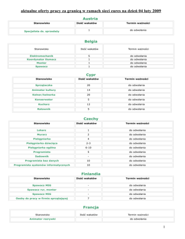 aktualne oferty pracy za granicą w ramach sieci eures na dzień 04 luty 2009 Austria Stanowisko Specjalista ds. sprzedaży Ilość wakatów 1 Termin ważności do odwołania Belgia Stanowisko Ilość wakatów Termin ważności Elektromechanik 5 do odwołania Koordynator tłumacz 1 do odwołania Monter 1 do odwołania Spawacz 1 do odwołania Cypr Stanowisko Ilość wakatów Termin ważności Sprzątaczka 20 do odwołania Animator kultury 14 do odwołania Kelner/kelnerka 20 do odwołania Konserwator 5 do odwołania Kucharz 12 do odwołania Ratownik 5 do odwołania Czechy Stanowisko Ilość wakatów Termin ważności Lekarz 1 do odwołania Murarz 2 do odwołania Pielęgniarka 4 do odwołania Pielęgniarka dziecięca 2-3 do odwołania Pielęgniarka ogólna 6-10 do odwołania Programista 5 do odwołania Sadownik - do odwołania Programista baz danych 10 do odwołania Programista systemów informatycznych 10 do odwołania Finlandia Stanowisko Ilość wakatów Termin ważności Spawacz MIG - do odwołania Spawacz rur, monter - do odwołania Spawacz MIG - do odwołania Osoby do pracy w firmie sprzątającej 7 do odwołania Francja Stanowisko Ilość wakatów Termin ważności Animator rozrywki - do odwołania 1 Ankieter - do odwołania Bagażowy - do odwołania Barman - do odwołania Kelner/ka - do odwołania Kinezyterapeuta 2 do odwołania Kucharz/kucharka 1 do odwołania Kucharz/kucharka - do odwołania Organizacja i obsługa bankietów - do odwołania Pracownik kasy biletowej - do odwołania Recepcjonista/recepcjonistka - do odwołania Sprzedawca - do odwołania Sprzedawca w barze szybkiej obsługi - do odwołania Hiszpania Stanowisko Ilość wakatów Termin ważności Programista maszyn CNC 1 do odwołania Księgowy 10 do odwołania Lekarze 71 do odwołania Inżynier elektronik 5 do odwołania Pielęgniarki 60 do odwołania Pielęgniarki 5 do odwołania Holandia Stanowisko Ilość wakatów Termin ważności Elektromonter szaf sterowniczych - do odwołania Elektryk - do odwołania Elektryk stoczniowy - do odwołania Główny elektryk - do odwołania Hydraulik - do odwołania Inżynier mechanik 1 do odwołania Mechanik maszyn rolniczych 1 do odwołania Pielęgniarka/pomoc pielęgniarki 50 do odwołania Irlandia Stanowisko Ilość wakatów Termin ważności Kierowca autobusu 10 do odwołania Monter linii elektrycznych 15 do odwołania Litwa Stanowisko Ilość wakatów Dekarz monter - Kierowca międzynarodowy 5 – 10 Krawiec/krawcowa 20 Kierowca-spedytor - Termin ważności do odwołania do odwołania 1 kwiecień 2009 do odwołania 2 Kierowca C+E 30 do odwołania Malta Stanowisko Ilość wakatów Termin ważności Informatyk 3 do odwołania Informatyk – oprogramowanie sieciowe 2 do odwołania Składacz, pracownik drukarni 1 do odwołania Niemcy Stanowisko Ilość wakatów Inżynier - Inżynier konstruktor 5 Inżynier mechanik - Kierowca ciężarówki/pojazdu czyszczącego 1 Kierowca maszyn budowlanych/operator koparki 1 Kierownik budowy – inżynier 1 Operator maszyny (wiercenie płuczkowe) 1 Projektant oprogramowania- Informatyk - Robotnik drogowy 1 Technik dentystyczny 1 Termin ważności do odwołania do odwołania do odwołania do odwołania do odwołania do odwołania do odwołania do odwołania do odwołania do odwołania Słowacja Stanowisko Ilość wakatów Termin ważności Pomoc kucharza 2 do odwołania Financial Analyst 30 do odwołania Słowenia Stanowisko Ilość wakatów Termin ważności Glazurnik 3 do odwołania Kelner 1 do odwołania Kelnerka 2 do odwołania Kucharz 1 do odwołania Kucharz 1 do odwołania Kucharz 1 do odwołania Kucharz-osoba do produkcji pizzy 1 do odwołania 3 Szwecja Stanowisko Ilość wakatów Termin ważności Pracownik w szkółce leśnej 6 do odwołania Wielka Brytania Stanowisko Ilość wakatów Termin ważności Blacharz samochodowy, lakiernik 2 do odwołania Blacharz-lakiernik 4 do odwołania Brygadzista 1 do odwołania Farmaceuta - do odwołania Inspektor weterynaryjny - do odwołania Inżynier ds. badań i rozwoju CFD 1 do odwołania Inżynier ds. badań i rozwoju CO2 1 do odwołania Kierowca furgonetki- dostawca 30 do odwołania Opiekun (w domach opieki) 10 do odwołania Opiekun osób starszych i niepełnosprawnych 20 do odwołania Pokojowa/pokojowy 1 do odwołania Pracownik rolny/pakowacz - do odwołania Starszy opiekun 10 do odwołania Szef kuchni 3 do odwołania Szef kuchni 1 do odwołania Szef wyrobów cukierniczych 1 do odwołania Ślusarz narzędziowy 1 do odwołania Średnio wykwalifikowany wykrawacz - do odwołania Wykwalifikowany wykrawacz - do odwołania Stanowisko Ilość wakatów Termin ważności Animator kultury 200 do odwołania Stanowisko Ilość wakatów Termin ważności Technik dźwiękowiec/ scenograf 10 16 luty 2009 Animator rozrywki 60 16 luty 2009 Trener Sportowy 25 16 luty 2009 Dziecięcy Animator Rozrywki 25 16 luty 2009 Instruktor Fitness i Aerobiku 10 16 luty 2009 Manager Animatorów Rozrywki 20 16 luty 2009 Performer Uliczny 10 16 luty 2009 Stanowisko Ilość wakatów Termin ważności Stolarz/cieśla - do odwołania Sernice Engineer, Electrical 1 20 luty 2009 Włochy Grecja Norwegia 4 Tapicer samochodowy - 21 luty 2009 Szczegółowe informacje na temat w/w ofert są dostępne na stronie Powiatowego Urzędu Pracy w Łomży www.pup.lomza.pl (wybór zakładka „Bezrobotni”->Menu / EURES - Ogłoszenia) .Więcej ofert z sieci EURES dostępnych jest także na stronie portalu system 7/24 – Urząd Pracy Podlasia www.up.podlasie.pl (wybór poprzez: zakładka „Osoby bezrobotne” lub logo EURES). Osoby zainteresowane ofertami prosimy o kontakt z Powiatowym Urzędem Pracy w Łomży, ul. Nowogrodzka 1, sala główna, referent ds. EURES – Katarzyna Zajkowska, tel: (086) 215-80-15 email: [email protected] lub z Wojewódzkim Urzędem Pracy w Białymstoku, ul. Pogodna 22, doradca EURES – Beata Chrościńska, tel: (085) 749-72-35 5