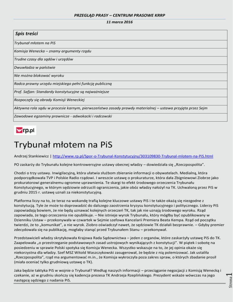 PRZEGLĄD PRASY – CENTRUM PRASOWE KRRP 11 marca 2016 Spis treści Trybunał młotem na PiS Komisja Wenecka – znamy argumenty rządu Trudne czasy dla sądów i urzędów Dwuwładza w państwie Nie można blokować wyroku Radca prawny urzędu miejskiego pełni funkcję publiczną Prof. Safjan: Standardy konstytucyjne są najważniejsze Rozpoczęły się obrady Komisji Weneckiej Aktywna rola sądu w procesie karnym, pierwszeństwo zasady prawdy materialnej – ustawa przyjęta przez Sejm Zawodowe egzaminy prawnicze - adwokacki i radcowski Trybunał młotem na PiS Andrzej Stankiewicz | http://www.rp.pl/Spor-o-Trybunal-Konstytucyjny/303109830-Trybunal-mlotem-na-PiS.html PO zaskarży do Trybunału kolejne kontrowersyjne ustawy obecnej władzy – dowiedziała się „Rzeczpospolita”. Chodzi o trzy ustawy. Inwigilacyjną, która ułatwia służbom zbieranie informacji o obywatelach. Medialną, która podporządkowała TVP i Polskie Radio rządowi. I wreszcie ustawę o prokuraturze, która dała Zbigniewowi Ziobrze jako prokuratorowi generalnemu ogromne uprawnienia. Te skargi to efekt środowego orzeczenia Trybunału Konstytucyjnego, w którym sędziowie odrzucili ograniczenia, jakie obóz władzy nałożył na TK. Uchwaloną przez PiS w grudniu 2015 r. ustawę uznali za niekonstytucyjną. Platforma liczy na to, że teraz na wokandę trafią kolejne kluczowe ustawy PiS i te także okażą się niezgodne z konstytucją. Tyle że może to doprowadzić do dalszego zaostrzenia kryzysu konstytucyjnego i politycznego. Liderzy PiS zapowiadają bowiem, że nie będą uznawać kolejnych orzeczeń TK, tak jak nie uznają środowego wyroku. Rząd zapowiada, że tego orzeczenia nie opublikuje. – Nie istnieje wyrok Trybunału, który mógłby być opublikowany w Dzienniku Ustaw – przekonywała w czwartek w Sejmie szefowa Kancelarii Premiera Beata Kempa. Rząd od początku twierdzi, że to „komunikat”, a nie wyrok. Ziobro oświadczył nawet, że sędziowie TK działali bezprawnie. – Gdyby premier zdecydowała się na publikację, mogłaby stanąć przed Trybunałem Stanu – przekonywał. Strona Jaka będzie taktyka PiS w wojnie o Trybunał? Według naszych informacji – przeciąganie negocjacji z Komisją Wenecką i czekanie, aż w grudniu skończy się kadencja prezesa TK Andrzeja Rzeplińskiego. Prezydent wskaże wówczas na jego następcę sędziego z nadania PiS. 1 Przedstawicieli władzy skrytykowała Krajowa Rada Sądownictwa – jeden z organów, które zaskarżyły ustawę PiS do TK. Zaapelowała „o przestrzeganie podstawowych zasad ustrojowych wynikających z konstytucji”. W piątek i sobotę na posiedzeniu w sprawie Polski spotyka się Komisja Wenecka. Wszystko wskazuje na to, że jej opinia okaże się niekorzystna dla władzy. Szef MSZ Witold Waszczykowski zasugerował, że będzie z nią polemizować. Jak ustaliła „Rzeczpospolita”, rząd ma argumentować m.in., że Komisja wykroczyła poza zakres spraw, o których zbadanie prosił (miała oceniać tylko grudniową ustawę o TK). PRZEGLĄD PRASY – CENTRUM PRASOWE KRRP 11 marca 2016 Komisja Wenecka – znamy argumenty rządu Andrzej Gajcy | http://www.rp.pl/Polityka/303109838-Komisja-Wenecka--znamy-argumenty-rzadu.html Polska delegacja szykuje się na długą potyczkę z Komisją Wenecką. Podczas piątkowej debaty ma wskazywać na brak obiektywizmu, upolitycznienie, a przede wszystkim niezrozumienie Konstytucji RP. Szef polskiej dyplomacji Witold Waszczykowski nie weźmie udziału w weneckiej debacie. Rząd będzie reprezentowało trzech wiceministrów „Rzeczpospolita” dotarła do głównych argumentów, które mają paść podczas piątkowej polemiki w Wenecji. Trzech wiceministrów, dwóch z MSZ: Konrad Szymański i Aleksander Stępkowski, oraz wiceszef resortu sprawiedliwości Marcin Warchoł będą w piątek zabiegać, by ostateczna opinia Komisji Weneckiej ws. zmian w Trybunale Konstytucyjnym nie była druzgocąca dla polskiego rządu. Jak słyszymy od polskich dyplomatów – to wręcz mission impossible. Pierwotnie polskiej delegacji miał przewodzić szef MSZ Witold Waszczykowski, na którego wniosek Komisja zajęła się zmianami w Trybunale, lecz w rządzie zapadła decyzja, by delegacja była mniej polityczna, natomiast bardziej ekspercka. Waszczykowski zapowiedział w czwartek, że polska delegacja podczas obrad Komisji będzie zbijać stawiane zarzuty. Do tego celu ma posłużyć lista uwag do projektu opinii, jakie rząd przesłał w ostatnich dniach do Komisji Weneckiej. Jakich argumentów użyje polska delegacja? Po pierwsze, przedstawiciele polskiego rządu mają wskazywać, że Komisja Wenecka w swojej opinii zachowała się nielojalnie, wykraczając poza zakres wniosku z 23 grudnia 2015 r. Dotyczył on bowiem jedynie oceny grudniowej nowelizacji, a nie kontrowersji związanych z problemem kompletności składu TK czy sposobu obsady stanowisk. Po drugie, Komisja wykazała się brakiem obiektywizmu, nie odnosząc się do faktu niedopuszczenia przez prezesa TK Andrzeja Rzeplińskiego zaprzysiężonych przez prezydenta trzech sędziów. Rząd zarzuca też ekspertom Rady Europy upolitycznienie i przekroczenie kompetencji, bo jako ciało wyłącznie doradcze nie może wzywać władz RP do określonego działania i stawiać ultimatum. Polscy negocjatorzy mają także podnosić błędną ocenę przez Komisję kwestii ślubowania sędziów oraz obowiązku prezydenta do jego przyjęcia. Twierdzą, że KW błędnie uznała, iż rząd zawsze związany jest nie tylko sentencją wyroku TK, ale także jego uzasadnieniem, bo zdaniem PiS konstytucja wiąże rząd jedynie do opublikowania sentencji orzeczenia. Według naszych ustaleń rząd nie zgadza się także z twierdzeniem Komisji, że zmiany w zakresie postępowania dyscyplinarnego wobec sędziów TK godzą w ich niezawisłość. Kiedy w rzeczywistości nowela – zdaniem polskich władz – zwiększa ich niezawisłość, bo żeby pociągnąć do odpowiedzia