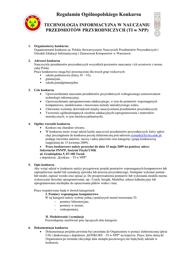 Regulamin Ogólnopolskiego Konkursu TECHNOLOGIA INFORMACYJNA W NAUCZANIU PRZEDMIOTÓW PRZYRODNICZYCH (TI w NPP) 1. Organizatorzy konkursu: Organizatorami konkursu są: Polskie Stowarzyszenie Nauczycieli Przedmiotów Przyrodniczych i Ośrodek Edukacji Informatycznej i Zastosowań Komputerów w Warszawie. 2. Adresaci konkursu Nauczyciele przedmiotów przyrodniczych wszystkich poziomów nauczania i ich uczniowie z terenu całej Polski. Prace konkursowe mogą być przeznaczone dla trzech grup wiekowych: szkoła podstawowa (klasy IV - VI), gimnazjum, szkoła ponadgimnazjalna 3. Cele konkursu • Upowszechnianie nauczania przedmiotów przyrodniczych wzbogaconego zastosowaniem technologii informacyjnej. • Upowszechnianie oprogramowania edukacyjnego, w tym do pomiarów wspomaganych komputerowo, modelowania i stosowania metody interaktywnego wideo. • Ułatwienie wymiany doświadczeń między nauczycielami przedmiotów przyrodniczych. • Tworzenie ogólnodostępnych zasobów edukacyjnych (oprogramowania i materiałów metodycznych, w tym interdyscyplinarnych). 4. Ogólne warunki konkursu • Konkurs ma charakter otwarty. • W konkursie moŜe wziąć udział kaŜdy nauczyciel przedmiotów przyrodniczych, który zgłosi chęć przystąpienia do konkursu pocztą elektroniczną pod adresem [email protected], podając nazwiska autorów, nazwę i adres placówki oraz kategorię i grupę konkursową (najpóźniej do 15 kwietnia 2009). • Prace konkursowe naleŜy przesyłać do dnia 15 maja 2009 na poniŜszy adres: Sekretariat PSNPP, Instytut Fizyki UMK ul. Grudziądzka 5, 87-100 Toruń z dopiskiem: „Konkurs – TI w NPP” 5. Opis konkursu Aby wziąć udział w konkursie naleŜy przygotować projekt pomiarów wspomaganych komputerowo lub zaprojektować model lub symulację zjawiska lub procesu przyrodniczego. Następnie wykonać pomiar lub model, zapisać wyniki oraz opisać je. Do przeprowadzenia pomiarów lub wykonania modelu moŜna wykorzystać dowolne oprogramowanie, np.: Coach, Insight, Modellus, arkusz kalkulacyjny lub oprogramowanie niezbędne do opracowania plików wideo i inne. Prace rozpatrywane będą w dwóch kategoriach: I. Pomiary wspomagane komputerowo W tej kategorii naleŜy wybrać jedną z poniŜszych metod stosowania TI: − pomiary laboratoryjne, − pomiary w terenie, − wideopomiary. II. Modelowanie i symulacje Przewidujemy moŜliwość prac łączących obie kategorie. 6. Dokumentacja konkursu • Dokumentacja projektu powinna być przesłana do Organizatora w postaci elektronicznej (płyta CD) i drukowanej z dopiskiem „KONKURS – TI w NPP” na kopercie. Prace, które dotrą do Organizatora po terminie (decyduje data stempla pocztowego) nie będą brały udziału w konkursie. • Praca konkursowa powinna zawierać szczegółowy opis (do 5 stron A4) przeprowadzonego doświadczenia lub modelu w postaci drukowanej i elektronicznej, wyniki pomiarów lub zaprojektowany model w postaci elektronicznej. Do dokumentacji moŜna dołączyć film lub zdjęcia w postaci cyfrowej rejestrujące przebieg wykonanego doświadczenia (dotyczy pomiarów). 7. Szczegółowe warunki konkursu • Do Konkursu mogą być zgłaszane tylko oryginalne prezentacje autorstwa uczestników, nie naruszające praw autorskich osób trzecich, uprzednio nigdzie nie publikowane. • Wszystkie prace powinny być potwierdzone przez dyrektora szkoły. • Prace powinny spełniać następujące wymagania edycyjne: 1. Dokument powinien zawierać stronę tytułową z pełną nazwą projektu, imiona i nazwiska osób biorących udział w konkursie, nazwę szkoły oraz określenie kategorii konkursowej. 2. W dokumencie tekstowym powinna być zastosowana czcionka Times New Roman 12, pojedyncza interlinia, przypisy dolne. 3. Jeśli projekt zawiera obiekty graficzne (wykresy, zdjęcia, filmy, animacje) powinny być one dodatkowo załączone, przynajmniej w rozdzielczości 300 dpi. 8. Kryteria oceny Zgłoszone do konkursu wyniki projektów oceniane będą przez Jury, wg następujących kryteriów: • etap edukacyjny uczestników (szkoła podstawowa, gimnazjum, szkoła ponadgimnazjalna), • wartość merytoryczna i edukacyjna projektu, • oryginalność pomysłu, koncepcji, • skala przedsięwzięcia, • wkład pracy. 9. Nagrody • Jury przyzna 1 nagrodę główną Grand Prix, 1 nagrodę rzeczową główną dla kaŜdego etapu edukacyjnego oraz po 3 wyróŜnienia. • Najlepsze prace zostaną wyróŜnione: a) prezentacją podczas XVI Zjazdu PSNPP (plakaty, warsztat), b) publikacją w czasopiśmie „Nauczanie Przedmiotów Przyrodniczych” oraz w Mazowieckim Kwartalniku Edukacyjnym „Meritum”. c) umieszczeniem na stronach internetowych PSNPP i OEIiZK. 10. Wyniki konkursu zostaną ogłoszone na stronach internetowych organizatorów do dnia 15 czerwca 2009. Autorzy nagrodzonych projektów zostaną poinformowani takŜe drogą elektroniczną. 11. Wręczenie nagród odbędzie się podczas XVI Zjazdu PSNPP we wrześniu 2009 roku. 12. Ustalenia dodatkowe 1. Organizatorzy zastrzegają sobie nabycie majątkowych praw autorskich do wszystkich wyróŜnionych oraz nagrodzonych prac konkursowych, na wszystkich polach eksploatacji określonych ustawą o prawie autorskim i prawach pokrewnych (Dz.U.2000, Nr 80, po. 904 ze zm.). 2. Prace nadesłane na Konkurs nie będą zwracane Autorom. 3. Wszystkie zgłoszone do Konkursu prace mogą być w całości lub we fragmentach wykorzystane przez Organizatorów w materiałach edukacyjnych i informacyjnych, mogą równieŜ być publikowane na stronach internetowych Organizatorów. 4. Organizatorzy zastrzegają sobie prawo do przerwania lub odwołania Konkursu oraz dokonania zmian w Regulaminie Konkursu bez podania przyczyn. 5. Niniejszy Regulamin jest jedynym dokumentem określającym zasady Konkursu. 13. Do przesyłanych prac konkursowych naleŜy dołączyć podpisane oświadczenie (Załącznik). 14. Wzięcie udziału w konkursie jest równoznaczne z akceptacją niniejszego Regulaminu. Z