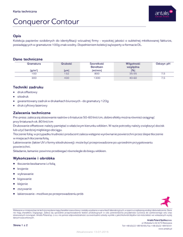 Karta techniczna Conqueror Contour Opis Kolekcja papierów ozdobnych do identyfikacji wizualnej firmy - wysokiej jakości o subtelnej młotkowanej fakturze, posiadających w gramaturze 100g znak wodny. Dopełnieniem kolekcji są koperty w formacie DL. Dane techniczne Gramatura Grubość Szorstkość Bendtsen Wilgotność względna Odczyn pH [g/m2] 100 [µm] 132 [ml/min] 800 [%] 35-55 7,5 300 430 1300 40-60 7,5 Techniki zadruku druk offsetowy sitodruk gwarantowany zadruk w drukarkach biurowych - do gramatury 120g druk cyfrowy laserowy Zalecenia techniczne Pre-press: zaleca się stosowanie rastrów o liniaturze 50-60 linii/cm, dobre efekty można również osiągnąć przy liniaturach ok. 80 linii/cm Drukowanie offsetowe: należy pamiętać o właściwym kierunku włókien. W razie potrzeby należy zwiększyć docisk lub użyć bardziej miękkiego obciągu. Tłoczenie folią: w przypadku trudności producent zaleca wstępne wyrównanie powierzchni przez ślepe tłoczenie w miejscach tłoczenia folią. Lakierowanie (lakier UV z formy sitodrukowej): może być przeprowadzone po uprzednim przygotowaniu powierzchni. Składanie, łamanie: powinno przebiegać równolegle do biegu włókien. Wykończenie i obróbka tłoczenie bezbarwne i z folią krojenie wykrawanie bigowanie klejenie zszywanie lakierowanie - możliwe po przeprowadzeniu prób Wskazane w niniejszej karcie technicznej dane mają charakter szacunkowy i zostały uzyskane w warunkach laboratoryjnych, w oparciu o najlepszą wiedzę i doświadczenie. Dane nie mają charakteru wiążącego. Zaleca się uprzednie przeprowadzenie testów produkcyjnych w celu potwierdzenia przydatności surowca do zamierzonego celu oraz stosowanych rozwiązań. Antalis Poland sp. z o.o. nie ponosi odpowiedzialności za ewentualne szkody wynikłe z jakichkolwiek błędów lub nieścisłości we wskazanych wyżej danych szacunkowych. Antalis Poland Spółka z o.o. ul. Wołoska 5, 02-675 Warszawa Strona 1 z 2 Tel +48 (0)22 189 50 00, Fax +48 (0)22 189 50 01 www.antalis.pl Aktualizowane 13-07-2016 Karta techniczna Conqueror Contour Certyfikaty i atesty ISO 9001 ISO 14001 ISO 9706 ECF FSC® Wskazane w niniejszej karcie technicznej dane mają charakter szacunkowy i zostały uzyskane w warunkach laboratoryjnych, w oparciu o najlepszą wiedzę i doświadczenie. Dane nie mają charakteru wiążącego. Zaleca się uprzednie przeprowadzenie testów produkcyjnych w celu potwierdzenia przydatności surowca do zamierzonego celu oraz stosowanych rozwiązań. Antalis Poland sp. z o.o. nie ponosi odpowiedzialności za ewentualne szkody wynikłe z jakichkolwiek błędów lub nieścisłości we wskazanych wyżej danych szacunkowych. Antalis Poland Spółka z o.o. ul. Wołoska 5, 02-675 Warszawa Strona 2 z 2 Tel +48 (0)22 189 50 00, Fax +48 (0)22 189 50 01 www.antalis.pl Aktualizowane 13-07-2016