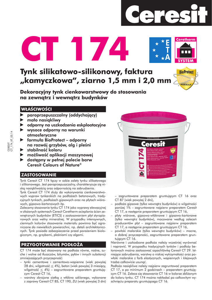 CT 174 Tynk silikatowo-silikonowy, faktura „kamyczkowa”, ziarno 1,5 mm i 2,0 mm CERESIT CT_174_KT_03.14 Dekoracyjny tynk cienkowarstwowy do stosowania na zewnątrz i wewnątrz budynków WŁAŚCIWOŚCI paroprzepuszczalny (oddychający) mało nasiąkliwy odporny na uszkodzenia eskploatacyjne wysoce odporny na warunki atmosferyczne formuła BioProtect – odporny na rozwój grzybów, alg i pleśni stabilność koloru możliwość aplikacji maszynowej dostępny w pełnej palecie barw Ceresit Colours of Nature® ZASTOSOWANIE Tynk Ceresit CT 174 łączy w sobie zalety tynku silikatowego i silikonowego. Jest paroprzepuszczalny, charakteryzuje się niską nasiąkliwością oraz odpornością na zabrudzenia. Tynk Ceresit CT 174 służy do wykonywania cienkowarstwowych wypraw tynkarskich na podłożach betonowych, tradycyjnych tynkach, podłożach gipsowych oraz na płytach wiórowych, gipsowo-kartonowych itp. Zalecamy stosowanie tynku CT 174 jako wyprawy elewacyjnej w złożonych systemach Ceresit Ceretherm ocieplania ścian zewnętrznych budynków (ETICS) z zastosowaniem płyt styropianowych oraz wełny mineralnej. W przypadku intensywnych, ciemnych kolorów stosowanie materiału powinno być ograniczone do niewielkich powierzchni, np. detali architektonicznych. Tynk posiada zabezpieczenie przed porażeniem biologicznym, np. grzybami, pleśniami czy algami. PRZYGOTOWANIE PODŁOŻA CT 174 może być stosowany na podłoża równe, nośne, suche i wolne od tłuszczów, bitumów, pyłów i innych substancji zmniejszających przyczepność: – tynki cementowe i cementowo-wapienne (wiek powyżej 28 dni, wilgotność < 4%), beton (wiek powyżej 3 miesięcy, wilgotność < 4%) – zagruntowane preparatem gruntującym Ceresit CT 16, – warstwy zbrojone siatką z włókna szklanego, wykonane z zaprawy Ceresit CT 85, CT 190, ZU (wiek powyżej 3 dni) – zagruntowane preparatem gruntującym CT 16 oraz CT 87 (wiek powyżej 2 dni), – podłoża gipsowe (tylko wewnątrz budynków) o wilgotności poniżej 1% – zagruntowane najpierw preparatem Ceresit CT 17, a następnie preparatem gruntującym CT 16, – płyty wiórowe, gipsowo-włóknowe i gipsowo-kartonowe (tylko wewnątrz budynków), mocowane według zaleceń producentów płyt – zagruntowane najpierw preparatem CT 17, a następnie preparatem gruntującym CT 16, – powłoki malarskie (tylko wewnątrz budynków) – mocne, o dobrej przyczepności, zagruntowane preparatem gruntującym CT 16. Nierówne i uszkodzone podłoża należy wcześniej wyrównać i naprawić. W przypadku tradycyjnych tynków i podłoży betonowych można zastosować szpachlówkę Ceresit CT 29. Istniejące zabrudzenia, warstwy o niskiej wytrzymałości oraz powłoki malarskie z farb elastycznych, wapiennych i klejowych trzeba całkowicie usunąć. Podłoża nasiąkliwe należy najpierw zagruntować preparatem CT 17, a po minimum 2 godzinach – preparatem gruntującym CT 16. Zaleca się stosowanie CT 16 w kolorze zbliżonym do koloru tynku. CT 174 można nakładać po całkowitym wyschnięciu preparatu gruntującego CT 16. WYKONANIE Dokładnie wymieszać zawartość pojemnika. Jeśli potrzeba, można dobrać konsystencję materiału do warunków stosowania poprzez dodatek niewielkiej ilości czystej wody i ponowne wymieszanie. Nie używać rdzewiejących pojemników i narzędzi. CT 174 równomiernie nanosić na podłoże, na grubość ziarna, za pomocą trzymanej pod kątem stalowej pacy. Następnie, kolistymi ruchami płasko trzymanej packi plastikowej, należy nadać mu jednorodną fakturę gęsto ułożonych ziaren kruszywa. Nie skrapiać tynku wodą! Na jednej płaszczyźnie pracować bez przerw, zachowując jednakową konsystencję materiału. W przypadku konieczności przerwania pracy, należy wzdłuż wyznaczonej linii przykleić samoprzylepną taśmę, nałożyć tynk, nadać mu fakturę, a następnie zerwać taśmę z resztkami świeżego materiału. Po przerwie należy kontynuować pracę od wyznaczonego miejsca. Krawędź wykonanej wcześniej wyprawy można zabezpieczyć taśmą samoprzylepną. Narzędzia i świeże zabrudzenia należy myć wodą, a stwardniałe resztki tynku usuwać mechanicznie. Renowacje tynku można przeprowadzić poprzez malowanie farbą silikatową Ceresit CT 54 lub farbą silikonową Ceresit CT 48 oraz Ceresit CT 49. UWAGA Prace należy wykonywać w suchych warunkach, przy temperaturze powietrza i podłoża od +5°C do +25°C i przy wilgotności względnej powietrza poniżej 80%. Wszelkie dane odnoszą się do temperatury +20°C oraz wilgotności względnej powietrza 60%. W innych warunkach należy uwzględnić szybsze lub wolniejsze twardnienie materiału. Nie mieszać produktu z innymi tynkami, barwnikami, żywicami i innymi spoiwami. Pomieszczenia po zastosowaniu tynku należy wietrzyć do zaniku zapachu, przed oddaniem ich do użytku. W przypadku kontaktu materiału z oczami płukać je obficie wodą i zasięgnąć porady lekarza. Wyrób należy przechowywać w miejscu niedostępnym dla dzieci. Właściwości użytkowe podane są w treści odpowiadającej wyrobowi Deklaracji Właściwości Użytkowych. ZALECENIA Nie należy nakładać tynku na ściany silnie nasłonecznione, a wykonaną wyprawę chronić przed zbyt szybkim przesychaniem. Do czasu całkowitego wyschnięcia, chronić tynk przed opadami deszczu. Zaleca się wtedy stosowanie osłon na rusztowaniach. Z uwagi na zawarte wypełniacze naturalne, mogące powodować różnice w wyglądzie tynku – należy na jednej płaszczyźnie stosować materiał o tym samym numerze szarży produkcyjnej umieszczonym na każdym opakowaniu. Napoczęte opakowanie należy dokładnie zamykać, a jego zawartość wykorzystać w możliwie najkrótszym czasie. Niniejsza karta techniczna określa zakres stosowania materiału i zalecany sposób prowadzenia robót, ale nie może zastąpić zawodowego przygotowania wykonawcy. Oprócz podanych zaleceń prace należy wykonywać zgodnie ze sztuką budowlan