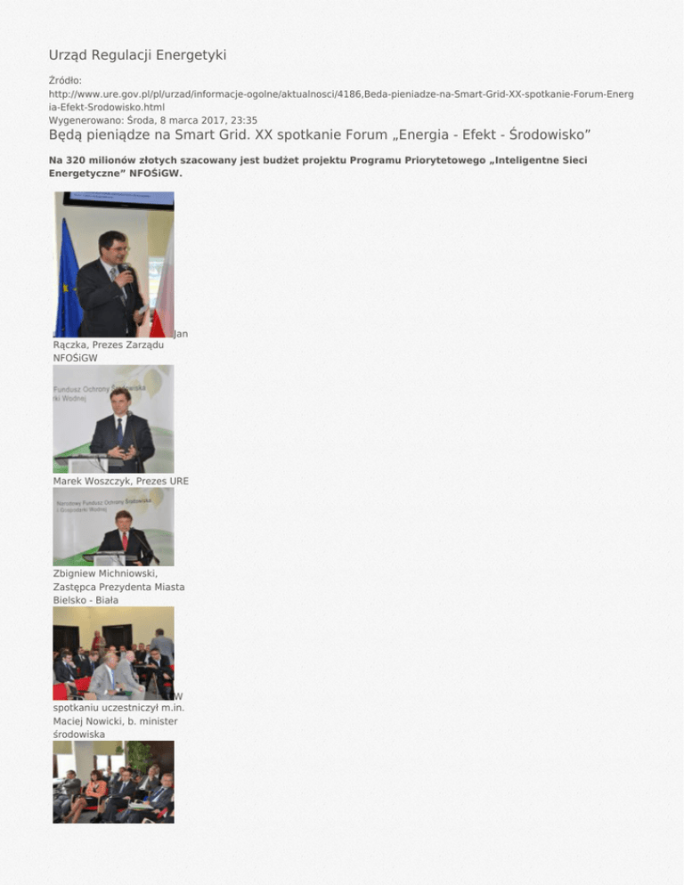 Urząd Regulacji Energetyki Źródło: http://www.ure.gov.pl/pl/urzad/informacje-ogolne/aktualnosci/4186,Beda-pieniadze-na-Smart-Grid-XX-spotkanie-Forum-Energ ia-Efekt-Srodowisko.html Wygenerowano: Środa, 8 marca 2017, 23:35 Będą pieniądze na Smart Grid. XX spotkanie Forum „Energia - Efekt - Środowisko” Na 320 milionów złotych szacowany jest budżet projektu Programu Priorytetowego „Inteligentne Sieci Energetyczne” NFOŚiGW. Jan Rączka, Prezes Zarządu NFOŚiGW Marek Woszczyk, Prezes URE Zbigniew Michniowski, Zastępca Prezydenta Miasta Bielsko - Biała W spotkaniu uczestniczył m.in. Maciej Nowicki, b. minister środowiska Marek Woszczyk, Prezes URE wziął udział w dwudziestym już spotkaniu z cyklu „Energia - Efekt - Środowisko”, w ramach którego Narodowy Fundusz Ochrony Środowiska i Gospodarki Wodnej (NFOŚiGW) wspiera ideę inteligentnych sieci energetycznych Od 2012 roku finansowanie projektów smart w energetyce będzie możliwe m.in. dzięki środkom przekazywanym do NFOŚiGW w ramach obowiązków regulatora wynikających z ustawy Prawo energetyczne. Budżet Programu Priorytetowego Inteligentne Sieci Energetyczne zasilą między innymi wpływy z opłat zastępczych. Prace nad projektem Programu Priorytetowego Inteligentne Sieci Energetyczne zainaugurowano w lutym 2010 roku z udziałem Prezesa URE. Po zakończonych konsultacjach społecznych Projekt PP ISE zaprezentowano 1 lipca 2011 podczas XX spotkania z cyklu Forum „Energia - Efekt - Środowisko”. Zdaniem Marka Woszczyka, Prezesa Urzędu Regulacji Energetyki, Projekt Programu „Inteligentne Sieci Energetyczne” jest przykładem dobrej współpracy wszystkich uczestników debaty o Smart Grid: administracji, nauki, sektora energetycznego, sektora IT. Szef URE zwrócił uwagę, iż równolegle z podjęciem działań technicznych i legislacyjnych w zakresie smart grid konieczne jest rozpoczęcie działań nakierowanych na edukację świadomych konsumentów nowego rodzaju usług, które łączą rynek energetyczny z rynkiem telekomunikacyjnym. - Aby jak największa populacja chciała korzystać z możliwości, jakie oferują inteligentne sieci, konieczne są działania edukacyjno - informacyjne. Oba komponenty programu wsparcia smart grid techniczny i edukacyjny - są potrzebne i dopiero razem - poprzez efekt synergii - dają pożądane skutki. - mówił Marek Woszczyk, szef URE podczas spotkania w Narodowym Funduszu Ochrony Środowiska i Gospodarki Wodnej. O tym jak sfinansować rozwój Inteligentnych Sieci Energetycznych oraz o strategii finansowania Smart Grid mówił gospodarz spotkania dr Jan Rączka, Prezes Zarządu NFOŚGiW. Szczegóły Projektu Programu Priorytetowego Inteligentne Sieci Energetyczne przedstawili - Wojciech Stawiany, Doradca w Departamencie Komunikacji i Strategii w NFOŚiGW oraz Agnieszka Zagrodzka, Zastępca Dyrektora Departamentu Ochrony Klimatu w NFOŚiGW a zarazem kierownik Projektu Programu Priorytetowego. Wojciech Stawiany przypomniał przebieg konsultacji społecznych i technicznych projektu programu informując m.in., że w projekcie PP ISE zapisano konieczność zgodności przygotowywanych projektów z opracowanym w URE Stanowiskiem Prezesa URE w sprawie niezbędnych wymagań wobec wdrażanych przez OSD E inteligentnych systemów pomiarowo-rozliczeniowych z uwzględnieniem funkcji celu oraz proponowanych mechanizmów wsparcia przy postulowanym modelu rynku. Agnieszka Zagrodzka przedstawiła harmonogram dalszych prac nad implementacją projektu Programu. NFOŚiGW planuje zakończenie prac nad projektem w sierpniu 2011 r., po przyjęciu projektu PP ISE przez Zarząd i Radę Nadzorczą NFOŚiGW we wrześniu 2011 r., ogłoszenie pierwszego konkursu PP ISE, przewidziano na IV kwartał 2011 r. Z kwoty 320 milionów złotych na wdrożenie inteligentnych sieci elektroenergetycznych przeznaczono 150 mln zł. Kolejne 170 mln dotacji otrzymają beneficjenci na przedsięwzięcia inwestycyjne w zakresie wdrażania rozproszonych odnawialnych źródeł energii, zakupu i montażu energooszczędnego oświetlenia, budowy urządzeń magazynowania energii, a także kondensatorów kompensujących moc bierną. Program zakłada dofinansowywanie m.in. 12 różnych rodzajów przedsięwzięć w tzw. przestrzeniach pilotażowych, w tym projekty inteligentnych sieci energetycznych w zakresie energii elektrycznej obejmujące co najmniej 10 tys. punktów pomiarowych (m.in. w gospodarstwach domowych, małych i średnich przedsiębiorstwach, obiektach usługowych, handlowych) lub 1 tys. punktów pomiarowych w specjalnych strefach ekonomicznych, w których będą wdrażane rozproszone źródła energii odnawialnej. W ramach Programu dofinansowane będą projekty Smart Grid w zakresie energii elektrycznej, gazowej, energii cieplnej, wielu mediów (energia elektryczna, gaz, energia cieplna, ciepła woda użytkowa), kampanie edukacyjno - informacyjne, projekty informatyczne, opracowania specyfikacji standardów, opracowania techniczno - ekonomicznych studiów wykonalności. Z dofinansowania skorzystają przedsiębiorcy - operatorzy systemów dystrybucyjnych i przesyłowych energii elektrycznej i gazu, jednostki samorządu terytorialnego, zarządzający specjalnymi strefami ekonomicznymi, konsorcja naukowo przemysłowe oraz operatorzy komunikacji elektronicznej, realizatorzy „działań miękkich” wdrażający obiekty (instalacje) energooszczędnego oświetlenia - wskazani przez beneficjenta wiodącego, wdrażający odnawialne źródła energii, wdrażający urządzenia magazynowania energii i/lub baterii kondensatorów kompensujących moc bierną w ramach budowy/przebudowy sieci elektroenergetycznych służących przyłączeniu odnawialnych źródeł energii. Projekt potrwa do 2018 r. (w tym: alokacja budżetu styczeń 2013 r. - grudzień 2017 r.; płatności: do 31.12.2018 r.). W pierwszym roku alokacji budżetu kwota planowanych do zawarcia umów wyniesie 85 mln złotych. Na spotkanie do Narodowego F