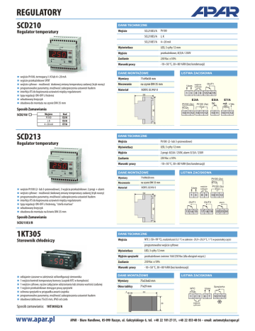 REGULATORY SCD210 DANE TECHNICZNE Wejście Regulator temperatury SCL210E3/A Pt100 SCL210E5/A J, K SCL210E7/A 4÷20 mA Wyświetlacz LED, 3 cyfry 12 mm Wyjście przekaźnikowe, 8(3)A / 250V Zasilanie 230 Vac ±10% Warunki pracy -10÷50 °C, 30÷80 %RH (bez kondensacji) DANE MONTAŻOWE n wejście Pt100, termopary J i K lub 4÷20 mA n wyjście przekaźnikowe SPDT n wejście cyfrowe - możliwość skokowej zmiany temperatury zadanej (tryb nocny) n programowalne parametry, możliwość zabezpieczenia ustawień hasłem n interfejs iFS do kopiowania ustawień między regulatorami n typy regulacji: ON-OFF z histerez wbudowany brzęczyk n obudowa do montażu na szynie DIN 35 mm n 71x90x58 mm Mocowanie na szynie DIN 35 mm Materiał NORYL UL94V-0 Pt100 J, K 4÷20 mA OUT1 wejście cyfrowe Uzas 1 3 58 8 9 13 14 15 E3/A Pt100 (2p) E5/A E7/A TC _ + Pt100 (3p) mA _ + Vdc + 90 Sposób Zamawiania Wejście SCD210/ o LISTWA ZACISKOWA Wymiary 10 11 12 10 11 12 Kod E3/A E5/A E7/A SCD213 10 11 10 11 12 DANE TECHNICZNE Pt100 (2- lub 3-przewodowe) Wejścia Regulator temperatury Wyświetlacz LED, 3 cyfry 12 mm Wyjścia 2 progi: 8(3)A / 250V, alarm 5(1)A / 250V Zasilanie 230 Vac ±10% Warunki pracy -10÷50 °C, 30÷80 %RH (bez kondensacji) DANE MONTAŻOWE 71x90x58 mm Mocowanie na szynie DIN 35 mm Materiał NORYL UL94V-0 Pt100 (2p) 58 Uzas wejście cyfrowe 1 3 8 9 Pt100 (3p) 10 11 12 OUT1 OUT2 13 14 15 17 18 19 alarm 90 wejście Pt100 (2- lub 3-przewodowe), 3 wyjścia przekaźnikowe: 2 progi + alarm n wejście cyfrowe - możliwość skokowej zmiany temperatury zadanej (tryb nocny) n programowalne parametry, możliwość zabezpieczenia ustawień hasłem n interfejs iFS do kopiowania ustawień między regulatorami n typy regulacji: ON-OFF z histerezą, "strefa martwa" n wbudowany brzęczyk n obudowa do montażu na listwie DIN 35 mm n LISTWA ZACISKOWA Wymiary 22 23 24 Sposób Zamawiania SCD213E3/B 1KT305 DANE TECHNICZNE Wejścia Sterownik chłodniczy NTC (-50÷99 °C), rozdzielczość 0,1 °C w zakresie -29,9÷29,9 °C, 1 °C w pozostałej części programowalne wejście cyfrowe n odtajanie czasowe w zależności od konfiguracji sterownika n 1 wejście kontroli temperatury komory (czujnik NTC w komplecie) n 1 wejście cyfrowe, ręczne załączanie odszraniania lub zmiana wartości zadanej n 1 wyjście przekaźnikowe sterujące pracą sprężarki n ochrona sprężarki w przypadku awarii czujnika n programowalne parametry, możliwość zabezpieczenia ustawień hasłem obudowa tablicowa 75x33 mm, IP65 od czoła n Wyświetlacz LED, 3 cyfry 12 mm Wyjście sprężarki przekaźnikowe zwierne 16A/250 Vac (dla obciążeń rezyst.) Zasilanie 230 Vac ±10% Warunki pracy -10÷50 °C, 30÷80 %RH (bez kondensacji) DANE MONTAŻOWE Wymiary 75x33x63 mm Okno tablicy 71x29 mm 4 LISTWA ZACISKOWA www.apar.pl Uzas 1 2 3 6 7 Sprężarka 63 29 Sposób zamawiania: 1KT305E2/A NTC 10 11 12 wejście cyfrowe APAR - Biuro Handlowe, 05-090 Raszyn, ul. Gałczyńskiego 6, tel. +48 22 101-27-31, +48 22 853-48-56 • email: [email protected]