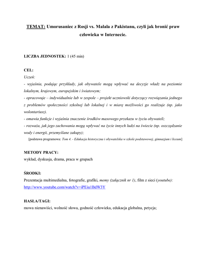 TEMAT: Umorusaniec z Rosji vs. Malala z Pakistanu, czyli jak bronić praw człowieka w Internecie. LICZBA JEDNOSTEK: 1 (45 min) CEL: Uczeń: - wyjaśnia, podając przykłady, jak obywatele mogą wpływać na decyzje władz na poziomie lokalnym, krajowym, europejskim i światowym; - opracowuje – indywidualnie lub w zespole – projekt uczniowski dotyczący rozwiązania jednego z problemów społeczności szkolnej lub lokalnej i w miarę możliwości go realizuje (np. jako wolontariusz). - omawia funkcje i wyjaśnia znaczenie środków masowego przekazu w życiu obywateli; - rozważa, jak jego zachowania mogą wpływać na życie innych ludzi na świecie (np. oszczędzanie wody i energii, przemyślane zakupy); [podstawa programowa: Tom 4. - Edukacja historyczna i obywatelska w szkole podstawowej, gimnazjum i liceum] METODY PRACY: wykład, dyskusja, drama, praca w grupach ŚRODKI: Prezentacja multimedialna, fotografie, grafiki, memy (załącznik nr 1), film z sieci (youtube): http://www.youtube.com/watch?v=iPEiu1BdW3Y HASŁA/TAGI: mowa nienawiści, wolność słowa, godność człowieka, edukacja globalna, petycja; PRZEBIEG LEKCJI: - (5 min.) wyświetlamy krótki filmik (1 – Umorusany z Rosji; link do filmiku powyżej); pytamy uczniów o odczucia: co widzieli, co ich śmieszyło; my przedstawiamy prawdziwą historię Umorusanego; - (5 min.) wnioski z pierwszego punktu: w Internecie każdy nasz ruch zostawia cyfrowy ślad; często nie mamy wpływu w jaki sposób informacja zaczyna żyć własnym życiem; nie zdajemy sobie sprawy z tego, co robimy w sieci; potrzeba urefleksyjnienia swych działań w Internecie;; pojęcie mowy nienawiści oraz godności osobowej i osobistej; - (5 min) druga strona medalu – opowiadamy historię walki o prawa człowieka z wykorzystaniem internetu; Malalai Yousafzai – jej bitwa o prawo do edukacji kobiet w jej kraju (wykorzystamy jej zdjęcia, screen z jej bloga, informacje o nominacji do pokojowej nagrody nobla); - (15 min) zadanie dla uczniów; podział klasy na trzy grupy: każda z nich ma wymyślić najlepszy sposób walki o prawa człowieka; najważniejszym narzędziem będzie dla nich Internet; 1. grupa wciela się w romskie dzieci, które uczęszczają do szkoły w Polsce; dzieciaki są dyskryminowane przez społeczność uczniowską, nauczyciele uciekają od odpowiedzialności, dyrektor umywa ręce, twierdząc, że nie ma dowodów; zaczynają walczyć o swoje prawa, spotykają się z dość konserwatywnym Przewodniczącym Rady Rodziców; chcą pozyskać wsparcie rodziców i środki finansowe na zorganizowanie pewnych wydarzeń społecznych; 2. grupa stawia się w sytuacji uczniów z Brazylii, którzy chcą założyć klub piłkarski w swojej miejscowości, ale nie zgadza się na to władza lokalna, mówiąc, że brak środków; grupa przygotowuje się do rozmowy z burmistrzem miasta; chcą przedstawić swoją propozycję na funkcjonowanie klubu i jego finansowanie na wzór młodzieżowych klubów europejskich; 3. grupa wciela się w grupę niepełnoletnich osób, które pracują w fabryce ubrań w Chinach za bardzo małe pieniądze; chcą by reszta świata o nich usłyszała i pomogła im w walce, utrudnia im to szef zakładu; paru osobom udaje się namówić dwóch dziennikarzy pracujących przy ambasadzie amerykańskiej, by mogli mu opowiedzieć o ich sytuacji i o tym, jak postanowili walczyć z wyzyskiem; grupy otrzymują od nas scenariusze; na każdym z nich znajdują się pewnie terminy, które mogą im pomóc w układaniu dramy (scenariusze w załączniku nr 2); w tym zadaniu my wcielamy się odpowiednio w Przewodniczącego Rady Rodziców, władze lokalne oraz dziennikarzy; uczniowie mają za zadanie jak najbardziej przekonująco odpowiedzieć na nasze zarzuty bądź pytania, mówiąc o tym jak w walce o swoje prawa pomaga im Internet (np. dzieciaki z Brazylii pozyskują informację z Internetu, kontaktują się z klubami z innych krajów etc.); w takcie przygotowań do dramy podchodzimy do grup pomagając im znaleźć argumenty, by zadanie było dla nich jak najbardziej jasne; - (5 min) nasz komentarz końcowy dotyczący dramy, wprowadzamy pojęcie edukacji globalnej; - (5 min) podsumowanie zajęć: uświadomienie uczniom, że każdy ma wpływ na stan naszego świata; zaznajomienie ich ze stroną internetową: avazz.com; PRACA DOMOWA: napisać petycję (wzór rozdamy – załącznik nr 3) dotyczące spraw z najbliżej okolicy (pomożemy im odnaleźć takie problemy); na pracę domową mają tydzień; składają ją do nauczyciela, który może zadecydować, czy to zadanie będzie oceniane.