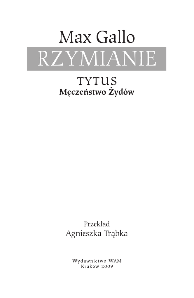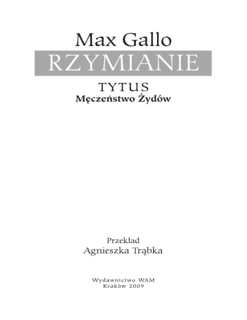 Tytuł oryginału Les Romains Titus. Le martyre des Juifs «LES ROMAINS 3. TITUS. LE MARTYRE DES JUIFS» de Max Gallo World copyright © LIBRAIRIE ARTHÈME FAYARD, 2006 © Wydawnictwo WAM, 2009 Redakcja Jakub Kołacz SJ Korekta Dariusz Godoś Projekt okładki wg oryginału Atelier Didier Thimonier przygotował Andrzej Sochacki ISBN 978-83-7505-363-0 WYDAWNICTWO WAM ul. Kopernika 26 • 31-501 Kraków tel. 012 62 93 200 • faks 012 42 95 003 e-mail: [email protected] DZIAŁ HANDLOWY tel. 012 62 93 254-256 • faks 012 430 32 10 e-mail: [email protected] Zapraszamy do naszej KSIĘGARNI INTERNETOWEJ http://WydawnictwoWAM.pl tel. 012 62 93 260 • faks 012 62 93 261 Drukarnia Wydawnictwa WAM ul. Kopernika 26 • 31-501 Kraków wydawnictwowam.pl Spis treści Część pierwsza 5 Część druga 71 Część trzecia 91 Część czwarta Część piąta Część szósta Część siódma 145 219 257 287 1. Ja, Serenus, obywatel Rzymu, piszę ostatnią część Kronik mojego życia. Mijają właśnie dwa lata od śmierci cesarza Tytusa. Służyłem mu i dlatego wiem, ile zawdzięcza mu Imperium. Jednak jego brat Domicjan, który objął po nim władzę, za wszelką cenę próbuje usunąć imię Tytusa z pamięci Rzymian. Mimo jego starań to właśnie Tytusa przypominają cały czas inskrypcje wygrawerowane na łukach triumfalnych, mówiące, że ujarzmił zbuntowany lud żydowski i zniszczył Jerozolimę – miasto, które dotychczas wydawało się nie do zdobycia. Wszyscy generałowie, królowie albo nie byli w stanie go podbić, albo odstępowali od tego zamiaru. Zazdrosny cesarz Domicjan może kazać usunąć te zdania. Ale jeśli Bóg, do którego się modlę, da mi zapał i siły, abym ukończył Kroniki, one będą pomnikiem na cześć cesarza Tytusa wzniesionym na zawsze i z myślą o wszystkich ludziach. Opowiem o jego wadach, o błędach, o jego okrucieństwie i podłości, ale także o uczciwości, hojności 8 RZYMIANIE i odwadze. Chciałbym, aby ten pomnik zapewnił mu należne miejsce wśród cesarzy Rzymu. Kiedy go poznałem, był zaledwie legatem XV Legionu Apollinaris, którego obóz rozciągał się w delcie Nilu, u wrót Aleksandrii – orientalnego, wspaniałego i znanego z naukowych osiągnięć, drugiego miasta Imperium, któremu czasami zazdrościł nawet Rzym. Tytus miał wtedy tylko dwadzieścia siedem lat, a ja pięćdziesiąt. Panował jeszcze Neron. Przemierzał Grecję, jeżdżąc od teatru do cyrku, recytując wiersze albo biorąc udział w wyścigach rydwanów, zawsze głodny triumfów i aplauzu, marząc, aby przedsięwziąć, na wzór Aleksandra, wielką zwycięską wyprawę w stronę Indii, która uczyniłaby z niego po wszystkie czasy najwybitniejszego cesarza rodzaju ludzkiego. Ale Żydzi w Judei i w Galilei wzniecili bunt. Wyglądało to tak, jakby centurion uzbrojony w dwa miecze, z torsem osłoniętym złotą kolczugą został ugodzony strzałą w piętę. Nie został pokonany, ale nie mógł iść do przodu inaczej, jak tylko utykając, obawiając się, aby rana się nie zakaziła i nie zatruła w ten sposób całej nogi czy wręcz całego ciała. Bunt Żydów mógł bowiem rozlać swoją truciznę na cały Orient. Byli przecież obecni we wszystkich miastach. W samym Rzymie wiele dziesiątków tysięcy z nich zamieszkiwało dzielnice na prawym brzegu Tybru. Ci, którzy ich nienawidzili, wykorzystali powstanie przeciwko Rzymowi w Galilei i w Judei, aby im ubliżać, prześladować ich i zabijać. W Rzymie pogardzano nimi i nękano ich. W Antiochii, trzecim co do TYTUS 9 wielkości mieście Imperium, także miały miejsce pogromy. Wygnano Żydów do Cezarei, wielkiego portu w Galilei. Prefekt Aleksandrii Tyberiusz Aleksander, Żyd apostata, zezwolił mieszkańcom i legionistom na zabicie pięćdziesięciu tysięcy z nich. Wszędzie w Imperium porządek był poważnie naruszony. Byłem w Grecji wraz z Neronem, kiedy dotarły do niego te wieści. Widziałem, jak jego nadęta twarz wykrzywia się, jak zawód, lęk i wściekłość zarazem deformują jego rysy. Rebelia Żydów i jej konsekwencje przyćmiewały jego aktorskie triumfy i uniemożliwiały mu marsz na czele legionów po śladach Aleksandra. Uniósł się gniewem. Trzeba ukrócić ten zbuntowany lud, odbić miasta w Judei i Galilei i skończyć z tą dumną Jerozolimą, w której kiedyś Herod, król Żydów, wzniósł świątynię, ogromną jak forteca, aby uczcić boga swojego ludu, niewidzialnego i jedynego boga, który – jak utrzymywano – jest większy od wszystkich bóstw Grecji, Rzymu i Orientu. Neron kazał więc Wespazjanowi przywrócić wszędzie pokój rzymski. Ten generał, który odnosił już sukcesy w walkach w Brytanii, miał objąć dowodzenie nad V i X Legionem, przeprawić się przez cieśninę Hellespont i dotrzeć do Galilei. Jego syn, Tytus, wyznaczony na stanowisko legata XV Legionu, miał tam do niego dołączyć. Pewnego zimowego poranka, kiedy wzburzone, szare morze rozbijało się z hukiem o falochron portu w Passos, wsiadłem wraz z Tytusem na triremę, która przygotowywała się do odpłynięcia w stronę Aleksandrii, gdzie czekał na nas XV Legion. 2. Na początku nie ufałem Tytusowi. Gdy tylko przekroczyłem pomost i wszedłem na statek, przywołał mnie do siebie. Stał na rufie, na platformie dowódcy, która zamknięta barierką górowała nad pokładem galery. Centurioni, których znałem, oraz trybun Placidus stali koło niego. Ich peleryny trzepotały na wietrze, a pod nimi widziałem ciała, umięśnione torsy i grube ręce, które chwytały się balustrady, ponieważ liny cumujące zostały już puszczone i statek zaczynał się kołysać. Zimowy wiatr był mocny, docierał nawet do portu i zapowiadano, że przeprawa o tej porze roku może być niebezpieczna. Podszedłem do platformy. Po bokach Tytusa dostrzegłem dwóch młodych ludzi o gładkich twarzach i ogolonych głowach. Mieli na sobie brązowe peleryny narzucone na mocno rozcięte na piersi białe tuniki 