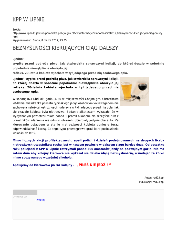 KPP W LIPNIE Źródło: http://www.lipno.kujawsko-pomorska.policja.gov.pl/k36/informacje/wiadomosci/20812,Bezmyslnosci-kierujacych-ciag-dalszy. html Wygenerowano: Środa, 8 marca 2017, 23:35 BEZMYŚLNOŚCI KIERUJĄCYCH CIĄG DALSZY „Jedno” wypite przed podróżą piwo, jak stwierdziła sprawczyni kolizji, do której doszło w sobotnie popołudnie niewątpliwie obniżyło jej refleks. 20-letnia kobieta wjechała w tył jadącego przed nią osobowego opla. „Jedno” wypite przed podróżą piwo, jak stwierdziła sprawczyni kolizji, do której doszło w sobotnie popołudnie niewątpliwie obniżyło jej refleks. 20-letnia kobieta wjechała w tył jadącego przed nią osobowego opla. W sobotę (6.11.br) ok. godz.16.30 w miejscowości Chojno gm. Chrostkowo 20-letnia mieszkanka powiatu rypińskiego jadąc osobowym volkswagenem nie zachowała należytej ostrożności i uderzyła w tył jadącego przed nią opla. Jak się okazało kobieta była nietrzeźwa. Badanie alkotestem wykazało, że w wydychanym powietrzu miała ponad 1 promil alkoholu. Na szczęście nikt z uczestników zdarzenia nie odniósł obrażeń. Ucierpiały jedynie oba auta. Za kierowanie pojazdem w stanie nietrzeźwości kobieta poniesie teraz odpowiedzialność karną. Za tego typu przestępstwo grozi kara pozbawienia wolności do lat 5. Mimo licznych akcji profilaktycznych, apeli policji i działań podejmowanych na drogach liczba nietrzeźwych uczestników ruchu jest w naszym powiecie w dalszym ciągu bardzo duża. Od początku roku policjanci z KPP w Lipnie zatrzymali ponad 300 amatorów jazdy na podwójnym gazie. Nie ma zatem dnia aby kolejny kierowca nie wykazał się daleko idącą bezmyślnością, wsiadając za kółko mimo spożywanego wcześniej alkoholu. Apelujemy do kierowców po raz kolejny - „PIŁEŚ NIE JEDŹ ! ” Autor: red2.kppl Publikacja: red2.kppl Ocena: 0/5 (0) Tweetnij