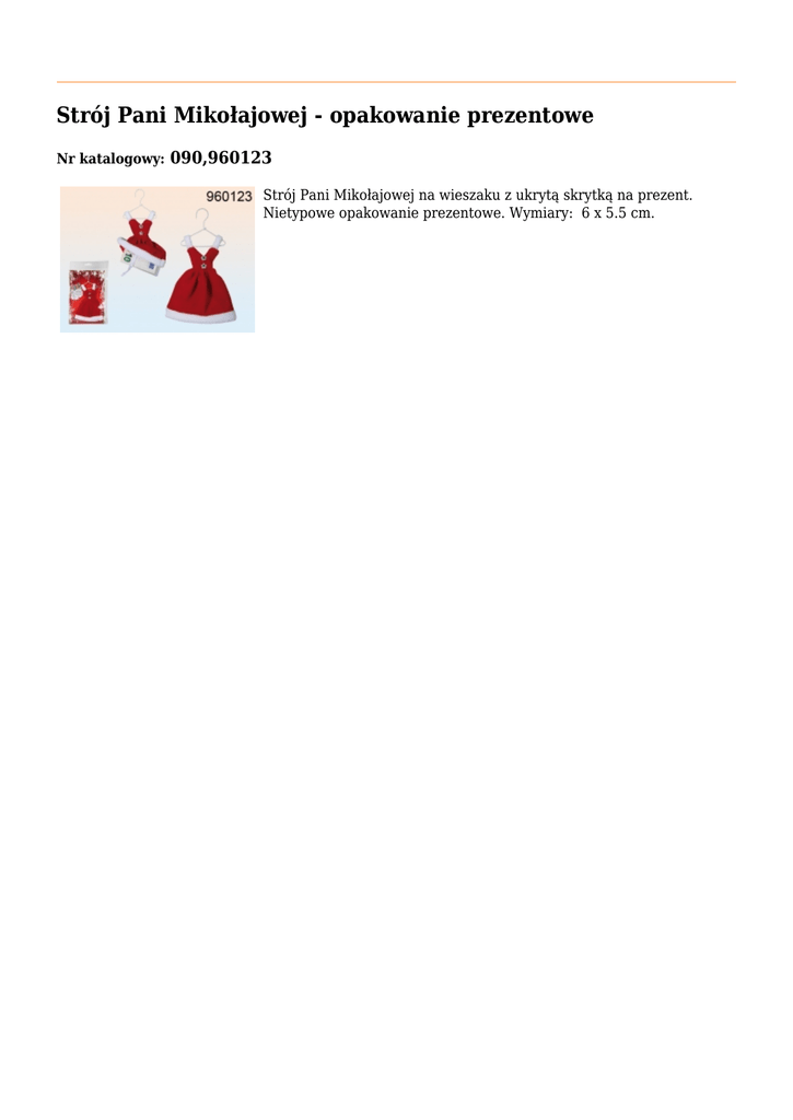 Strój Pani Mikołajowej - opakowanie prezentowe Nr katalogowy: 090,960123 Strój Pani Mikołajowej na wieszaku z ukrytą skrytką na prezent. Nietypowe opakowanie prezentowe. Wymiary: 6 x 5.5 cm.