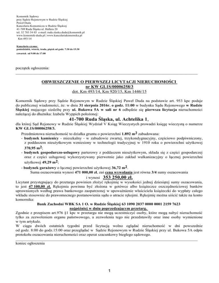 Komornik Sądowy przy Sądzie Rejonowym w Rudzie Śląskiej Paweł Duda Kancelaria Komornicza w Rudzie Śląskiej 41-709 Ruda Śląska ul. Hallera 20 tel. 32 783 54 03 e-mail: [email protected] www.komornik-duda.pl | www.kancelariakomornika.pl Km 493/14 Kancelaria czynna: poniedziałek, wtorek, środa, piątek od godz. 7:30 do 15:30 czwartek od 9:00 do 17:00 początek ogłoszenia: __________________________________________________________________________________________ OBWIESZCZENIE O PIERWSZEJ LICYTACJI NIERUCHOMOŚCI nr KW GL1S/00006258/3 dot. Km 493/14, Km 920/15, Km 1446/15 Komornik Sądowy przy Sądzie Rejonowym w Rudzie Śląskiej Paweł Duda na podstawie art. 953 kpc podaje do publicznej wiadomości, że: w dniu 31 sierpnia 2016r. o godz. 11:00 w budynku Sądu Rejonowego w Rudzie Śląskiej mającego siedzibę przy ul. Bukowa 5A w sali nr 6 odbędzie się pierwsza licytacja nieruchomości należącej do dłużnika: Izabela Wyppich położonej: 41-700 Ruda Śląska, ul. Achtelika 1, dla której Sąd Rejonowy w Rudzie Śląskiej Wydział V Ksiąg Wieczystych prowadzi księgę wieczystą o numerze KW GL1S/00006258/3. Przedmiotowa nieruchomość to działka gruntu o powierzchni 1.892 m2 zabudowana: - budynek kamienicy - mieszkalny - w zabudowie zwartej, trzykondygnacyjny, częściowo podpiwniczony, z poddaszem nieużytkowym wzniesiony w technologii tradycyjnej w 1910 roku o powierzchni użytkowej 370,95 m2; - budynek gospodarczo-usługowy parterowy z poddaszem nieużytkowym, składa się z części gospodarczej oraz z części usługowej wykorzystywany pierwotnie jako zakład wulkanizacyjny o łącznej powierzchni użytkowej 49,29 m2; - budynek garażowy o łącznej powierzchni użytkowej 36,72 m2. Suma oszacowania wynosi 471 000,00 zł, zaś cena wywołania jest równa 3/4 sumy oszacowania i wynosi 353 250,00 zł. Licytant przystępujący do przetargu powinien złożyć rękojmię w wysokości jednej dziesiątej sumy oszacowania, to jest 47 100,00 zł. Rękojmia powinna być złożona w gotówce albo książeczce oszczędnościowej banków uprawnionych według prawa bankowego zaopatrzonej w upoważnienie właściciela książeczki do wypłaty całego wkładu stosownie do prawomocnego postanowienia sądu o utracie rękojmi. Rękojmię można uiścić także na konto komornika: Bank Zachodni WBK SA 1 O. w Rudzie Śląskiej 63 1090 2037 0000 0001 2159 7623 najpóźniej w dniu poprzedzającym przetarg. Zgodnie z przepisem art.976 §1 kpc w przetargu nie mogą uczestniczyć osoby, które mogą nabyć nieruchomość tylko za zezwoleniem organu państwowego, a zezwolenia tego nie przedstawiły oraz inne osoby wymienione w tym artykule. W ciągu dwóch ostatnich tygodni przed licytacją wolno oglądać nieruchomość w dni powszednie od godz. 8:00 do godz.15:00 oraz przeglądać w Sądzie Rejonowym w Rudzie Śląskiej przy ul. Bukowa 5A odpis protokołu oszacowania nieruchomości oraz operat szacunkowy biegłego sądowego. __________________________________________________________________________________________ koniec ogłoszenia 1