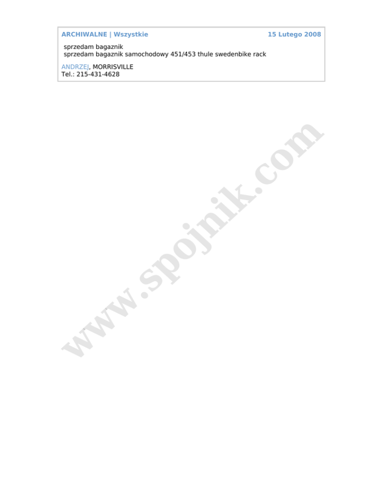 ARCHIWALNE | Wszystkie 15 Lutego 2008 sprzedam bagaznik sprzedam bagaznik samochodowy 451/453 thule swedenbike rack w w w .s po jn ik .c o m ANDRZEJ, MORRISVILLE Tel.: 215-431-4628
