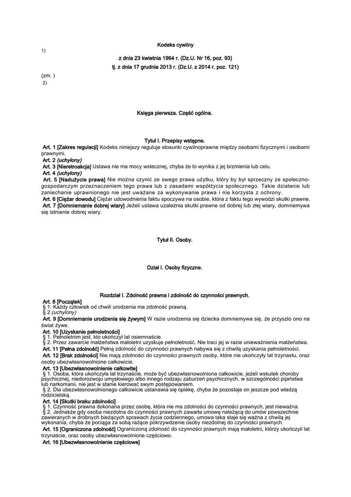 Kodeks cywilny 1) z dnia 23 kwietnia 1964 r. (Dz.U. Nr 16, poz. 93) tj. z dnia 17 grudnia 2013 r. (Dz.U. z 2014 r. poz. 121) (zm. ) 2) Księga pierwsza. Część ogólna. Tytuł I. Przepisy wstępne. Art. 1 [Zakres regulacji] Kodeks niniejszy reguluje stosunki cywilnoprawne między osobami fizycznymi i osobami prawnymi. Art. 2 (uchylony) Art. 3 [Nieretroakcja] Ustawa nie ma mocy wstecznej, chyba że to wynika z jej brzmienia lub celu. Art. 4 (uchylony) Art. 5 [Nadużycie prawa] Nie można czynić ze swego prawa użytku, który by był sprzeczny ze społecznogospodarczym przeznaczeniem tego prawa lub z zasadami współżycia społecznego. Takie działanie lub zaniechanie uprawnionego nie jest uważane za wykonywanie prawa i nie korzysta z ochrony. Art. 6 [Ciężar dowodu] Ciężar udowodnienia faktu spoczywa na osobie, która z faktu tego wywodzi skutki prawne. Art. 7 [Domniemanie dobrej wiary] Jeżeli ustawa uzależnia skutki prawne od dobrej lub złej wiary, domniemywa się istnienie dobrej wiary. Tytuł II. Osoby. Dział I. Osoby fizyczne. Rozdział I. Zdolność prawna i zdolność do czynności prawnych. Art. 8 [Początek] § 1. Każdy człowiek od chwili urodzenia ma zdolność prawną. § 2.(uchylony) Art. 9 [Domniemanie urodzenia się żywym] W razie urodzenia się dziecka domniemywa się, że przyszło ono na świat żywe. Art. 10 [Uzyskanie pełnoletności] § 1. Pełnoletnim jest, kto ukończył lat osiemnaście. § 2. Przez zawarcie małżeństwa małoletni uzyskuje pełnoletność. Nie traci jej w razie unieważnienia małżeństwa. Art. 11 [Pełna zdolność] Pełną zdolność do czynności prawnych nabywa się z chwilą uzyskania pełnoletności. Art. 12 [Brak zdolności] Nie mają zdolności do czynności prawnych osoby, które nie ukończyły lat trzynastu, oraz osoby ubezwłasnowolnione całkowicie. Art. 13 [Ubezwłasnowolnienie całkowite] § 1. Osoba, która ukończyła lat trzynaście, może być ubezwłasnowolniona całkowicie, jeżeli wskutek choroby psychicznej, niedorozwoju umysłowego albo innego rodzaju zaburzeń psychicznych, w szczególności pijaństwa lub narkomanii, nie jest w stanie kierować swym postępowaniem. § 2. Dla ubezwłasnowolnionego całkowicie ustanawia się opiekę, chyba że pozostaje on jeszcze pod władzą rodzicielską. Art. 14 [Skutki braku zdolności] § 1. Czynność prawna dokonana przez osobę, która nie ma zdolności do czynności prawnych, jest nieważna. § 2. Jednakże gdy osoba niezdolna do czynności prawnych zawarła umowę należącą do umów powszechnie zawieranych w drobnych bieżących sprawach życia codziennego, umowa taka staje się ważna z chwilą jej wykonania, chyba że pociąga za sobą rażące pokrzywdzenie osoby niezdolnej do czynności prawnych. Art. 15 [Ograniczona zdolność] Ograniczoną zdolność do czynności prawnych mają małoletni, którzy ukończyli lat trzynaście, oraz osoby ubezwłasnowolnione częściowo. Art. 16 [Ubezwłasnowolnienie częściowe] § 1. Osoba pełnoletnia może być ubezwłasnowolniona częściowo z powodu choroby psychicznej, niedorozwoju umysłowego albo innego rodzaju zaburzeń psychicznych, w szczególności pijaństwa lub narkomanii, jeżeli stan tej osoby nie uzasadnia ubezwłasnowolnienia całkowitego lecz potrzebna jest pomoc do prowadzenia jej spraw. § 2. Dla osoby ubezwłasnowolnionej częściowo ustanawia się kuratelę. Art. 17 [Zgoda przedstawiciela ustawowego] Z zastrzeżeniem wyjątków w ustawie przewidzianych, do ważności czynności prawnej, przez którą osoba ograniczona w zdolności do czynności prawnych zaciąga zobowiązanie lub rozporządza swoim prawem, potrzebna jest zgoda jej przedstawiciela ustawowego. Art. 18 [Potwierdzenie umowy] § 1. Ważność umowy, która została zawarta przez osobę ograniczoną w zdolności do czynności prawnych bez wymaganej zgody przedstawiciela ustawowego zależy od potwierdzenia umowy przez tego przedstawiciela. § 2. Osoba ograniczona w zdolności do czynności prawnych może sama potwierdzić umowę po uzyskaniu pełnej zdolności do czynności prawnych § 3. Strona, która zawarła umowę z osobą ograniczoną w zdolności do czynności prawnych, nie może powoływać się na brak zgody jej przedstawiciela ustawowego. Może jednak wyznaczyć temu przedstawicielowi odpowiedni termin do potwierdzenia umowy; staje się wolna po bezskutecznym upływie wyznaczonego terminu. Art. 19 [Czynność jednostronna] Jeżeli osoba ograniczona w zdolności do czynności prawnych dokonała sama jednostronnej czynności prawnej, do której ustawa wymaga zgody przedstawiciela ustawowego, czynność jest nieważna. Art. 20 [Umowy w drobnych sprawach] Osoba ograniczona w zdolności do czynności prawnych może bez zgody przedstawiciela ustawowego zawierać umowy należące do umów powszechnie zawieranych w drobnych bieżących sprawach życia codziennego. Art. 21 [Rozporządzanie zarobkiem] Osoba ograniczona w zdolności do czynności prawnych może bez zgody przedstawiciela ustawowego rozporządzać swoim zarobkiem, chyba że sąd opiekuńczy z ważnych powodów inaczej postanowi. Art. 22 [Przedmioty swobodnego użytku] Jeżeli przedstawiciel ustawowy osoby ograniczonej w zdolności do czynności prawnych oddał jej określone przedmioty majątkowe do swobodnego użytku, osoba ta uzyskuje pełną zdolność w zakresie czynności prawnych, które tych przedmiotów dotyczą. Wyjątek stanowią czynności prawne, do których dokonania nie wystarcza według ustawy zgoda przedstawiciela ustawowego. Art. 22 1 [Pojęcie konsumenta] Za konsumenta uważa się osobę fizyczną dokonującą czynności prawnej niezwiązanej bezpośrednio z jej działalnością gospodarczą lub zawodową. Art. 23 [Ochrona dóbr osobistych] Dobra osobiste człowieka, jak w szczególności zdrowie, wolność, cześć, swoboda sumienia, nazwisko lub pseudonim, wizerunek, tajemnica korespondencji, nietykalność mieszkania, twórczość naukowa, artystyczna, wynal