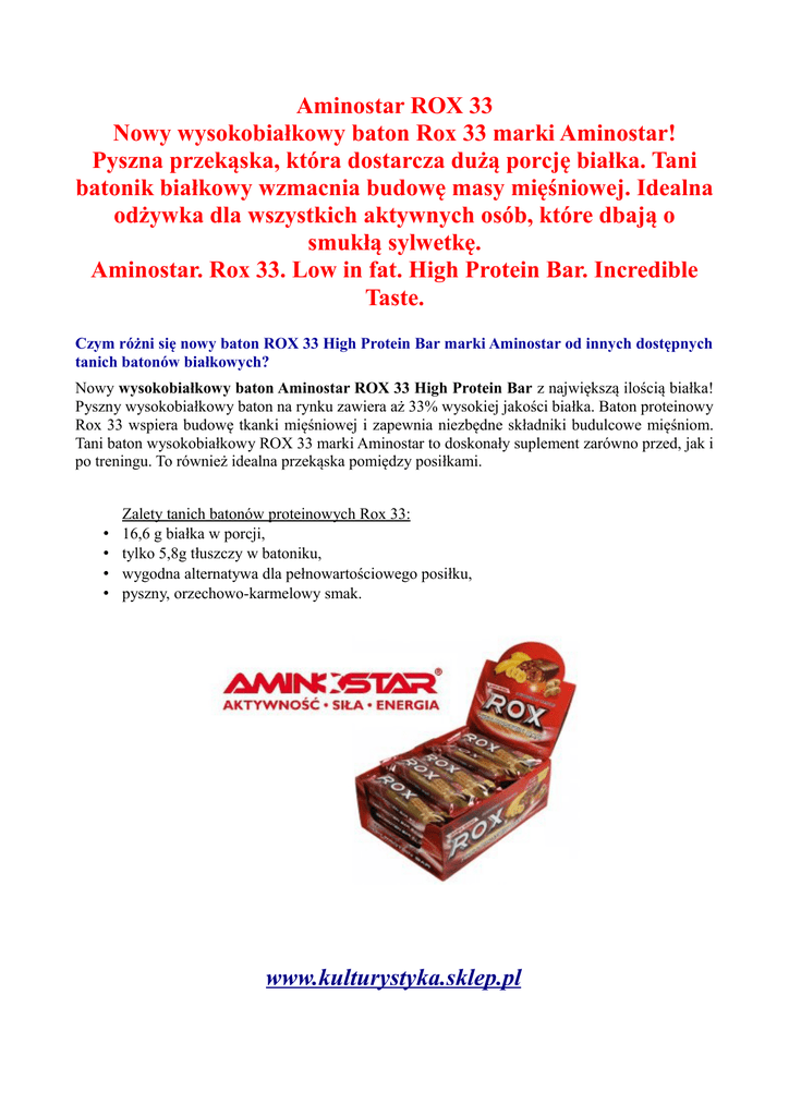 Aminostar ROX 33 Nowy wysokobiałkowy baton Rox 33 marki Aminostar! Pyszna przekąska, która dostarcza dużą porcję białka. Tani batonik białkowy wzmacnia budowę masy mięśniowej. Idealna odżywka dla wszystkich aktywnych osób, które dbają o smukłą sylwetkę. Aminostar. Rox 33. Low in fat. High Protein Bar. Incredible Taste. Czym różni się nowy baton ROX 33 High Protein Bar marki Aminostar od innych dostępnych tanich batonów białkowych? Nowy wysokobiałkowy baton Aminostar ROX 33 High Protein Bar z największą ilością białka! Pyszny wysokobiałkowy baton na rynku zawiera aż 33% wysokiej jakości białka. Baton proteinowy Rox 33 wspiera budowę tkanki mięśniowej i zapewnia niezbędne składniki budulcowe mięśniom. Tani baton wysokobiałkowy ROX 33 marki Aminostar to doskonały suplement zarówno przed, jak i po treningu. To również idealna przekąska pomiędzy posiłkami. • • • • Zalety tanich batonów proteinowych Rox 33: 16,6 g białka w porcji, tylko 5,8g tłuszczy w batoniku, wygodna alternatywa dla pełnowartościowego posiłku, pyszny, orzechowo-karmelowy smak. www.kulturystyka.sklep.pl Dla kogo przeznaczone są tanie batony wysokobiałkowe Aminostar? Batonik ROX 33 przeznaczony jest dla sportowców i osób aktywnych. Zwiększa wydolność organizmu podczas wysiłku fizycznego. Tani wysokobiałkowy baton ROX 33 to dietetyczny środek spożywczy przeznaczony jest dla sportowców wszystkich dyscyplin - sportów siłowych, jak kulturystyka i fitness, wytrzymałościowych, jak kolarstwo i biegi, a także dla wszystkich aktywnych sportowo osób. Idealne uzupełnienie diety dla wszystkich, którzy dbają o swoją sylwetkę i chcą zachować smukły i szczupły wygląd, jak również dla tych, którzy chcą uzupełnić dietę w wysokiej jakości białko. Dawkowanie Aminostar ROX 33. Batony ROX 33 marki Aminostar to idealne odżywki białkowe do stosowania zarówno przed, jak i po treningu. To również pyszna przekąska w ciągu dnia. Zaleca się spożywać 1-2 batony dziennie. Skład taniego batona Rox 33 marki Aminostar: Zawartość składników odżywczych w batonie: w 1 batoniku - 60g w 100 g Wartość energetyczna 235 kcal / 989 kJ 393 kcal / 1657 kJ Białko 19,9g 33,3g Węglowodany 20,1g 33,6g Tłuszcz 7,9g 13,2g Inne składniki zawarte w wysokobiałkowym batonie Aminostar Rox 33: białko z mleka,czekolada mleczna 16,7%(cukier, masło kakaowe, mleko w proszku, masa kakaowa, lecytyna sojowa, aromat),syrop glukozowy,syrop glukozowo- fruktozowy,polidekstroza (błonnik rozpuszczalny), orzechy arachidowe, hydrolizowana żelatyna, granulat sojowy, (białko sojowe, skrobia z tapioki, sól), krem karmelowy 1,8% (skondensowane mleko słodzone, syrop glukozowy, olej roślinny, syrop karmelizowany, cukier, emulugator- mono i digilicerydy kwasów tłuszczowych, sól, aromat) olej słonecznikowy, aromat.
