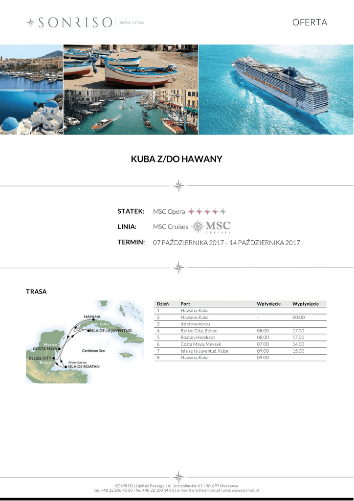 OFERTA KUBA Z/DO HAWANY STATEK: MSC Opera LINIA: MSC Cruises TERMIN: 07 PAŹDZIERNIKA 2017 – 14 PAŹDZIERNIKA 2017 TRASA Dzień 1 2 3 4 5 6 7 8 Port Hawana, Kuba Hawana, Kuba dzień na morzu Belize City, Belize Roatan, Honduras Costa Maya, Meksyk Isla se la Juventud, Kuba Hawana, Kuba Wpłynięcie 08:00 08:00 07:00 09:00 09:00 SONRISO | Lipiński Passage | Al. Jero zo limskie 61 | 00-697 Warszawa tel. +48 22 206 45 00 | fax. +48 22 100 14 61 | e-mail: biuro @so nriso .pl | web: www.so nriso .pl Wypłynięcie 00:00 17:00 17:00 14:00 15:00 - OFERTA CENA Typ kabiny Cena z osobę Kabina wewnętrzna od 469 EUR Kabina z oknem od 589 EUR Kabina z balkonem od 859 EUR CENA ZAWIERA DOTATKOWE OPŁATY zakwaterowanie w 2 - os. kabinie wybranej kategorii pełne wyżywienie: 3 posiłki, przekąski między posiłakmi, bufet o północy napoje: woda stołowa, kawa, herbata oraz sok do śniadania dostępne 24 h w restauracji bufetowej oraz w restauracji głównej wyłącznie podczas śniadań serwis bagażowy podczas wejścia i zejścia ze statku 24 godzinny serwis kabinowy korzystanie z urządzeń sportowo - rekreacyjnych dostępnych na pokładzie (baseny, jacuzzi, boiska sportowe, kluby dla dzieci i młodzieży itp.) udział we wszystkich imprezach organizowanych na pokładzie (przedstawienia, pokazy, aukcje, animacje i inne) dojazd/przelot do portu rozpoczęcia i zakończenia rejsu transfery (lotnisko - port - lotnisko) ewentualne noclegi przed lub po rejsie wycieczki fakultatywne napoje: bezalkoholowe, alkoholowe, woda mineralna dostępne w restauracjach i barach (istnieje możliwość wykupienia pakietów napojów, o szczegóły zapytaj w biurze) korzystanie z mini baru w kabinie korzystanie z usług typu: SPA, salon piękności, pralnia itp. wydatki osobiste tj. zakupy w butikach, internet, kasyno itp. obowiązkowe opłaty portowe obowiązkowa opłata serwisowa (napiwki dla obsługi statku ok.8,5 EUR/os. dorosła/dzień, dzieci poniżej 3 lat nie płacą) obowiązkowe ubezpieczenie turystyczne koszt wymaganych wiz ewentualna opłata paliwowa (linia w momencie wzrotu cen ropy zastrzega sobie prawo do dodania oplaty paliwowej do każdej rezerwacji) Na życzenie świadczymy dodatkowo usługi: rezerwacje hotelowe na całym świecie rezerwacje biletów lotniczych, trasferów oraz parkingu w porcie rezerwacje wycieczek fakultatywnych i innych atrakcji SONRISO | Lipiński Passage | Al. Jero zo limskie 61 | 00-697 Warszawa tel. +48 22 206 45 00 | fax. +48 22 100 14 61 | e-mail: biuro @so nriso .pl | web: www.so nriso .pl