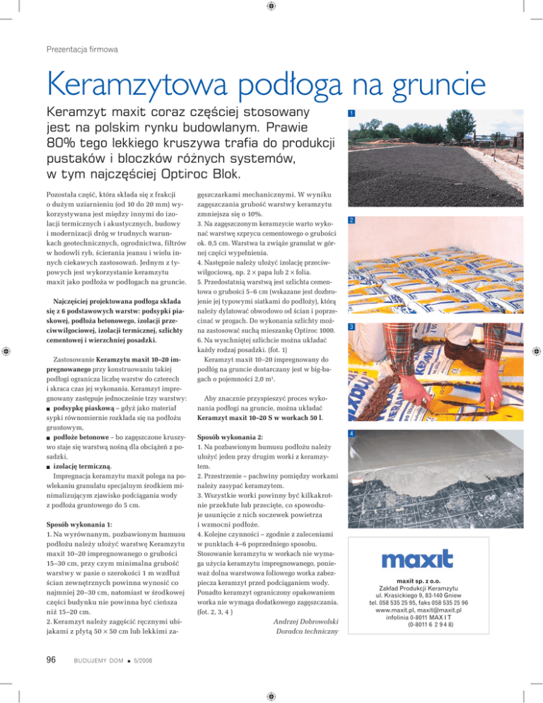 Prezentacja firmowa Keramzytowa podïoga na gruncie Keramzyt maxit coraz czÚĂciej stosowany jest na polskim rynku budowlanym. Prawie 80% tego lekkiego kruszywa trafia do produkcji pustaków i bloczków róĝnych systemów, w tym najczÚĂciej Optiroc Blok. Pozostaïa czÚĂÊ, która skïada siÚ z frakcji o duĝym uziarnieniu (od 10 do 20 mm) wykorzystywana jest miÚdzy innymi do izolacji termicznych i akustycznych, budowy i modernizacji dróg w trudnych warunkach geotechnicznych, ogrodnictwa, filtrów w hodowli ryb, Ăcierania jeansu i wielu innych ciekawych zastosowañ. Jednym z typowych jest wykorzystanie keramzytu maxit jako podïoĝa w podïogach na gruncie. NajczÚĂciej projektowana podïoga skïada siÚ z 6 podstawowych warstw: podsypki piaskowej, podïoĝa betonowego, izolacji przeciwwilgociowej, izolacji termicznej, szlichty cementowej i wierzchniej posadzki. Zastosowanie Keramzytu maxit 10–20 impregnowanego przy konstruowaniu takiej podïogi ogranicza liczbÚ warstw do czterech i skraca czas jej wykonania. Keramzyt impregnowany zastÚpuje jednoczeĂnie trzy warstwy: podsypkÚ piaskowÈ – gdyĝ jako materiaï sypki równomiernie rozkïada siÚ na podïoĝu gruntowym, podïoĝe betonowe – bo zagÚszczone kruszywo staje siÚ warstwÈ noĂnÈ dla obciÈĝeñ z posadzki, izolacjÚ termicznÈ. Impregnacja keramzytu maxit polega na powlekaniu granulatu specjalnym Ărodkiem minimalizujÈcym zjawisko podciÈgania wody z podïoĝa gruntowego do 5 cm. Sposób wykonania 1: 1. Na wyrównanym, pozbawionym humusu podïoĝu naleĝy uïoĝyÊ warstwÚ Keramzytu maxit 10–20 impregnowanego o gruboĂci 15–30 cm, przy czym minimalna gruboĂÊ warstwy w pasie o szerokoĂci 1 m wzdïuĝ Ăcian zewnÚtrznych powinna wynosiÊ co najmniej 20–30 cm, natomiast w Ărodkowej czÚĂci budynku nie powinna byÊ cieñsza niĝ 15–20 cm. 2. Keramzyt naleĝy zagÚĂciÊ rÚcznymi ubijakami z pïytÈ 50 × 50 cm lub lekkimi za- 96 BUDUJEMY DOM 5/2008 gÚszczarkami mechanicznymi. W wyniku zagÚszczania gruboĂÊ warstwy keramzytu zmniejsza siÚ o 10%. 3. Na zagÚszczonym keramzycie warto wykonaÊ warstwÚ szprycu cementowego o gruboĂci ok. 0,5 cm. Warstwa ta zwiÈĝe granulat w górnej czÚĂci wypeïnienia. 4. NastÚpnie naleĝy uïoĝyÊ izolacjÚ przeciwwilgociowÈ, np. 2 × papa lub 2 × folia. 5. PrzedostatniÈ warstwÈ jest szlichta cementowa o gruboĂci 5–6 cm (wskazane jest dozbrojenie jej typowymi siatkami do podïoĝy), którÈ naleĝy dylatowaÊ obwodowo od Ăcian i poprzecinaÊ w progach. Do wykonania szlichty moĝna zastosowaÊ suchÈ mieszankÚ Optiroc 1000. 6. Na wyschniÚtej szlichcie moĝna ukïadaÊ kaĝdy rodzaj posadzki. (fot. 1) Keramzyt maxit 10–20 impregnowany do podïóg na gruncie dostarczany jest w big-bagach o pojemnoĂci 2,0 m3. 1 2 3 Aby znacznie przyspieszyÊ proces wykonania podïogi na gruncie, moĝna ukïadaÊ Keramzyt maxit 10–20 S w workach 50 l. Sposób wykonania 2: 1. Na pozbawionym humusu podïoĝu naleĝy uïoĝyÊ jeden przy drugim worki z keramzytem. 2. Przestrzenie – pachwiny pomiÚdzy workami naleĝy zasypaÊ keramzytem. 3. Wszystkie worki powinny byÊ kilkakrotnie przekïute lub przeciÚte, co spowoduje usuniÚcie z nich soczewek powietrza i wzmocni podïoĝe. 4. Kolejne czynnoĂci – zgodnie z zaleceniami w punktach 4–6 poprzedniego sposobu. Stosowanie keramzytu w workach nie wymaga uĝycia keramzytu impregnowanego, poniewaĝ dolna warstwowa foliowego worka zabezpiecza keramzyt przed podciÈganiem wody. Ponadto keramzyt ograniczony opakowaniem worka nie wymaga dodatkowego zagÚszczania. (fot. 2, 3, 4 ) Andrzej Dobrowolski Doradca techniczny 4 maxit sp. z o.o. Zakïad Produkcji Keramzytu ul. Krasickiego 9, 83-140 Gniew tel. 058 535 25 95, faks 058 535 25 96 www.maxit.pl, [email protected] infolinia 0-8011 MAX I T (0-8011 6 2 9 4 8)
